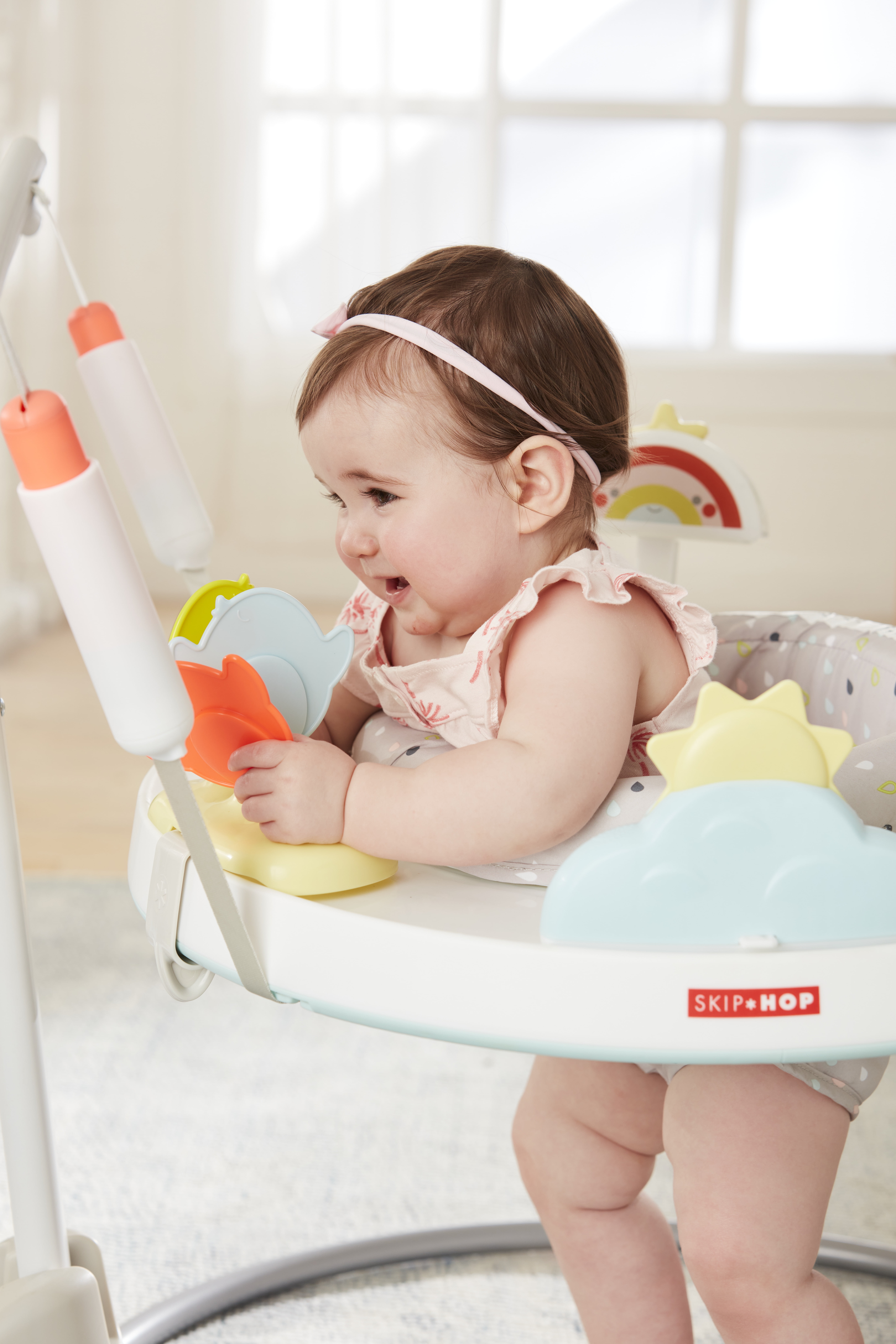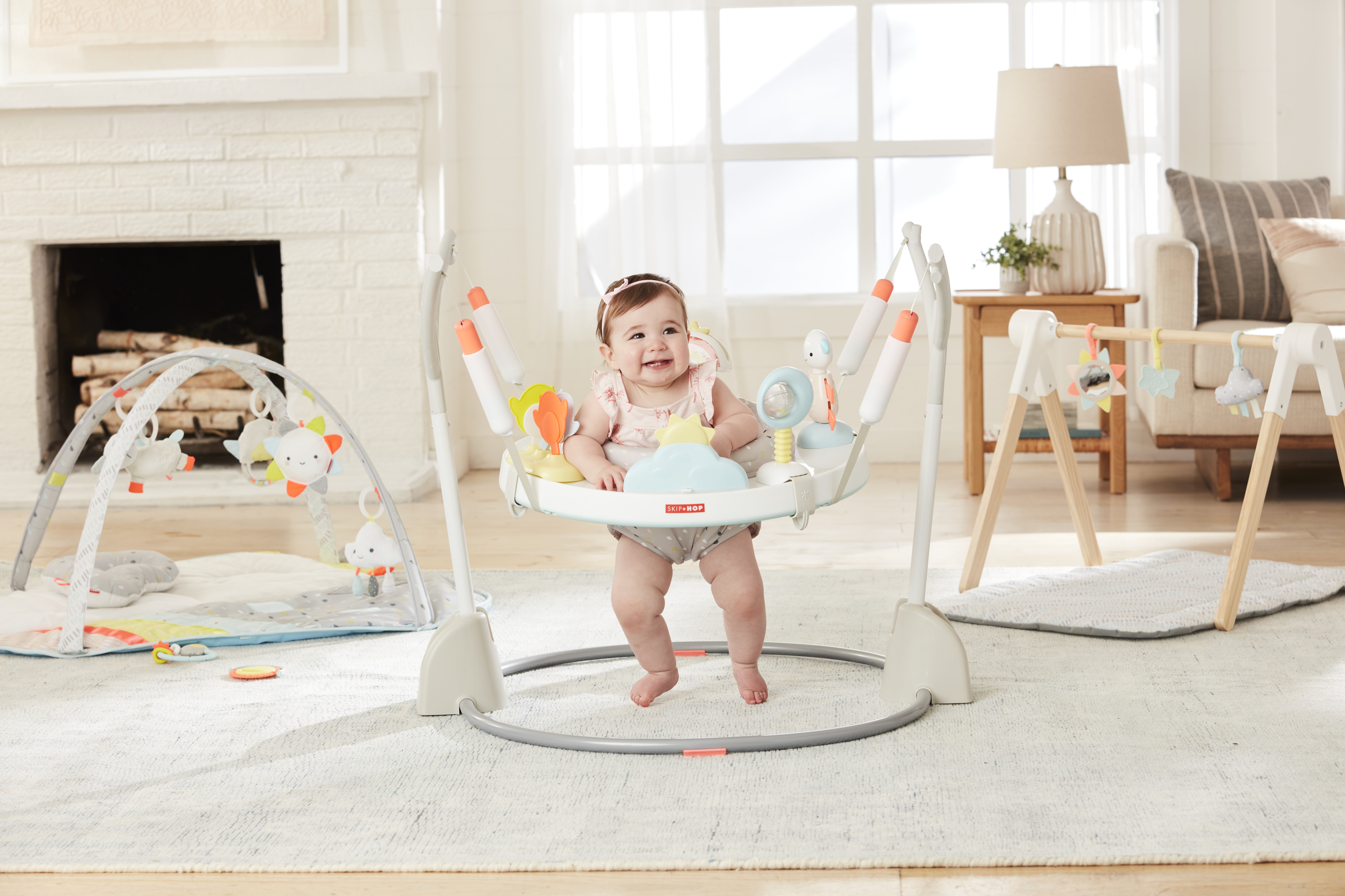 Ages 4m+ 20+ developmental activities Light-up cloud bounce counter tracks baby’s jumps and rewards baby with colorful lights and sounds: Four fun sound effects when button is pushed; Applause sound at 100-jump milestone; Parent reminder at 10 and 20 minutes to track usage Clip-on, movable toys to customize baby’s play: Swaying Trees teach cause and effect; Fox Jumping Jack jumps as baby jumps; Spinning Bee rattles and wobbles; Hedgehog Mirror with tambourines on each side Easily folds flat for storage; strap secures folded jumper for travel 360-degree rotating seat so baby can sit, swivel and bounce Leaf teethers attached to seat with removable ring Four spring capsules reveal fun colors when baby jumps Adjustable to five heights as baby grows