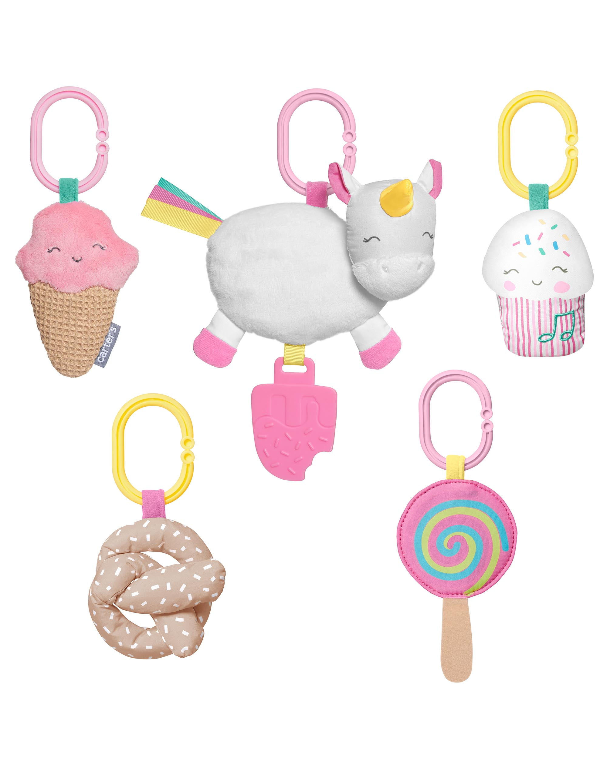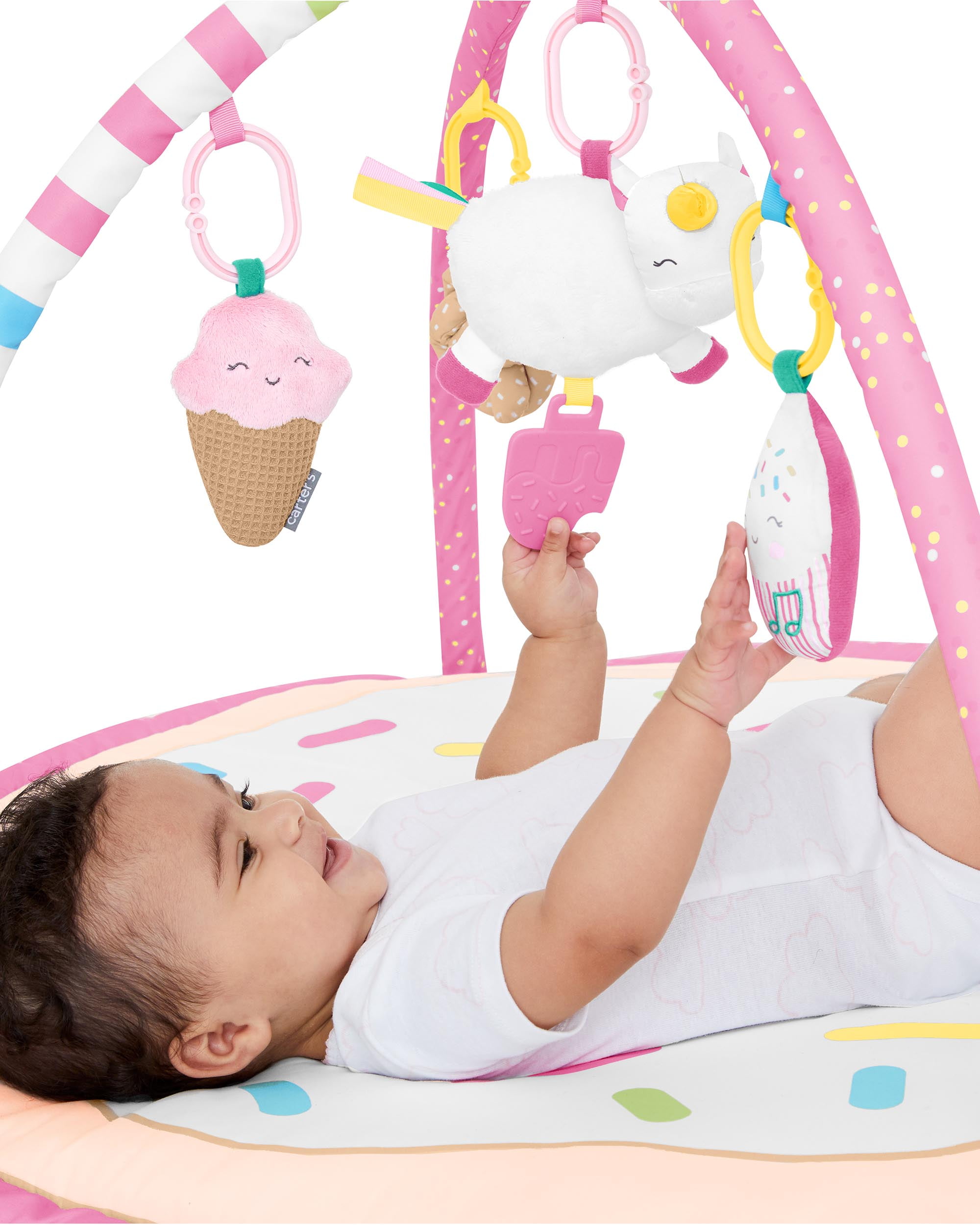 Ages 0+ Three ways to play: Overhead, tummy time and seated Comfy donut-shape mat with plush center Adorable popsicle tummy time pillow Five developmental toys include: Plush unicorn with rattle and popsicle teether toy, musical cupcake, ice cream with crinkle & waffle texture cone, soft tactile pretzel, lollipop with baby mirror PVC-free, Phthalate-free Size (inches): 34l x .75d x 28h; (cm): 86l x 2d x 71h