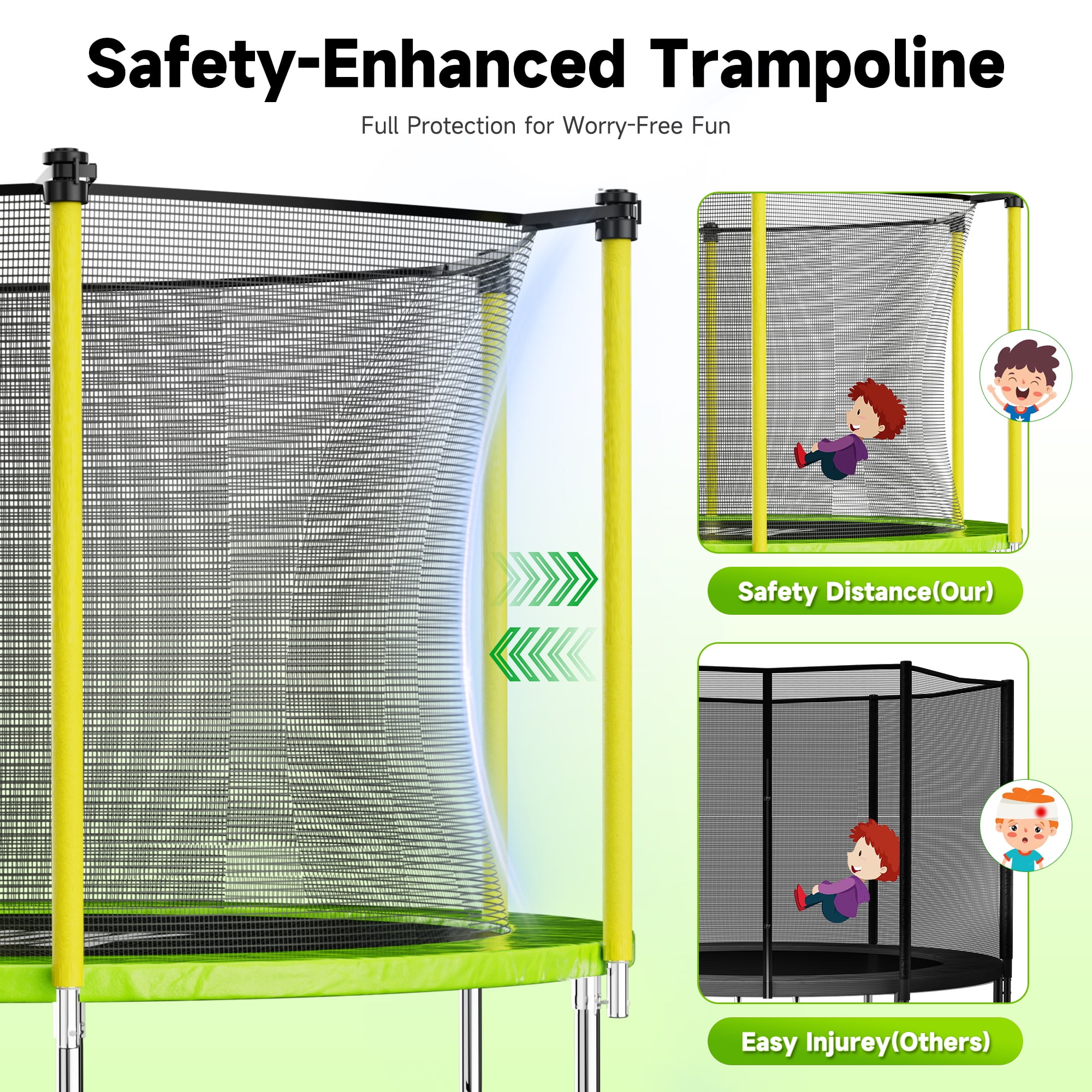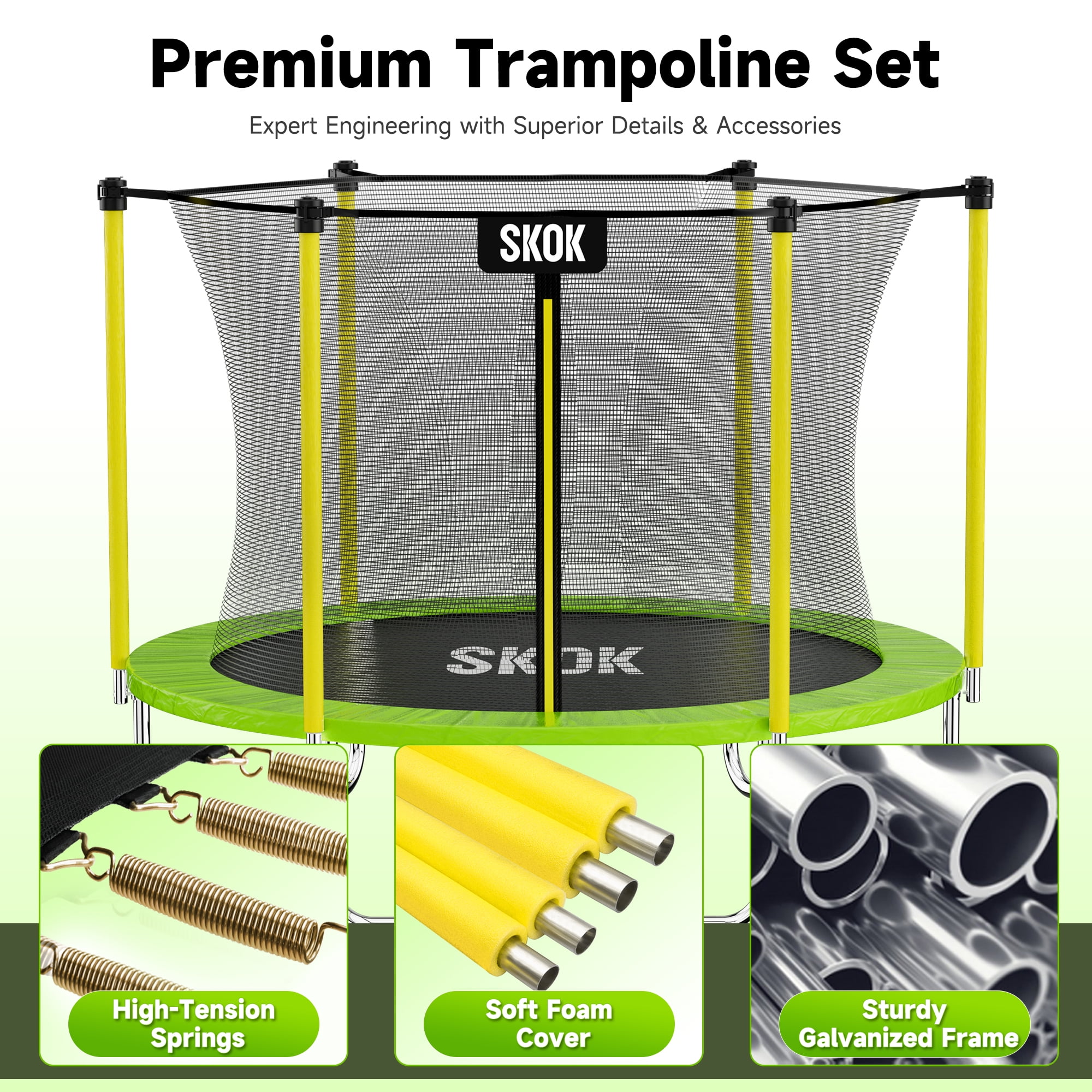 SKOK trampolines are tested for safety and durability to meet or exceed American Society of Children’s Product Certificate (CPC), TUV Certification and Testing, CONFORMITE EUROPEENNE (CE) all standards. SKOK trampoline is made of galvanized stainless steel frame. They are durable and anti-rust. For the safety of backyard playing, powered by 5-star premium trampoline safety net. Jumping mat is made of high-density PP material, wrapped in high-tension steel springs, providing very strong bounce for the exercise trampoline. All in One Box,you needn’t have to wait between packages, and you can make sure all parts of your kid trampoline are in the box at a glance.
