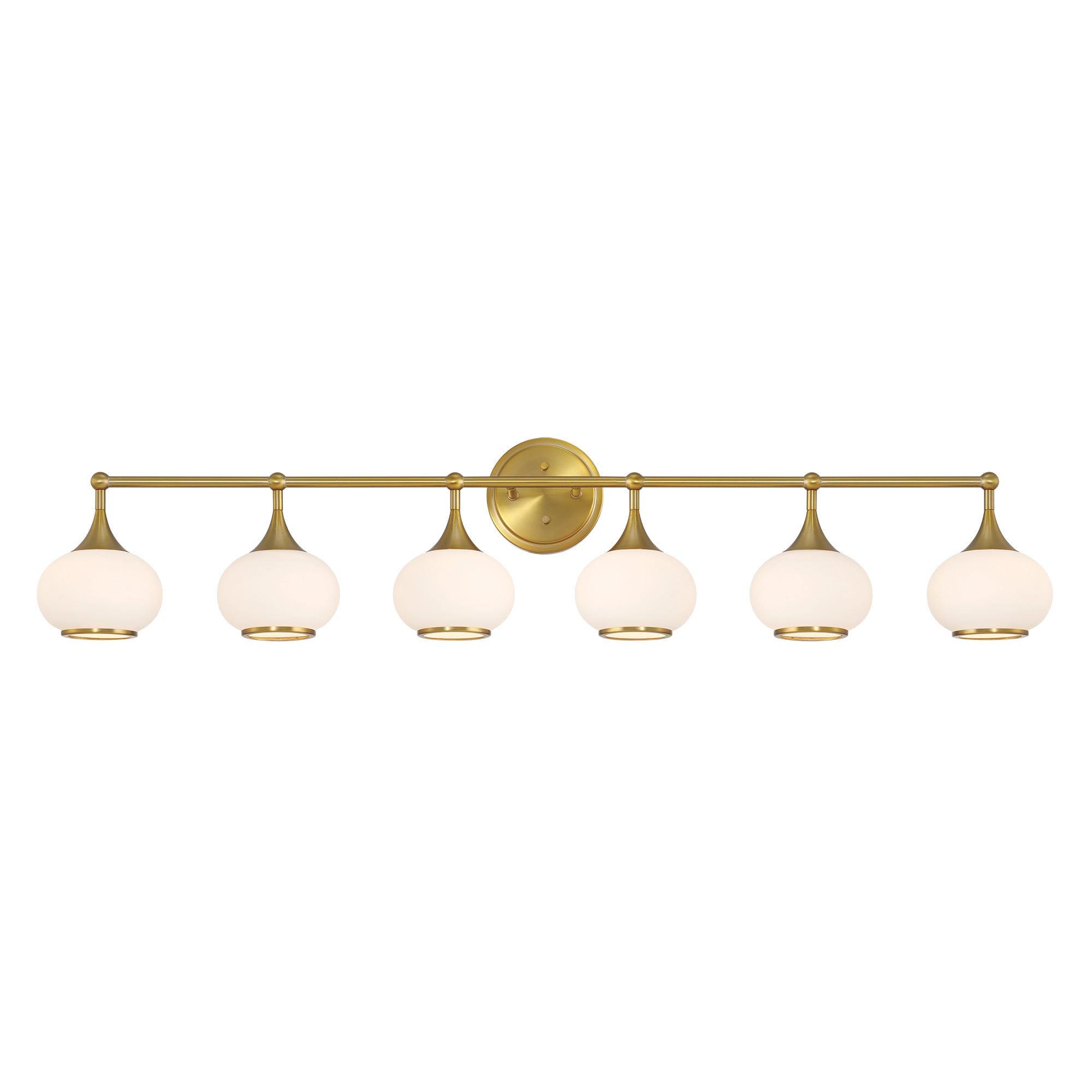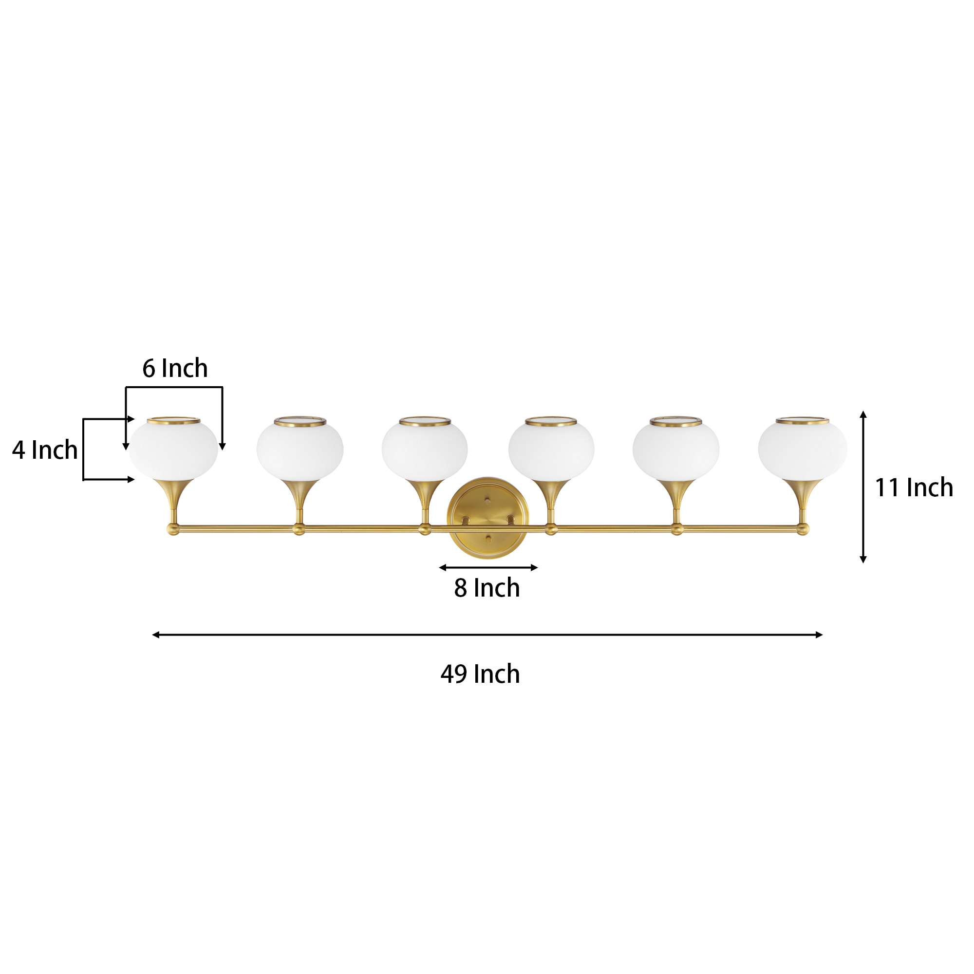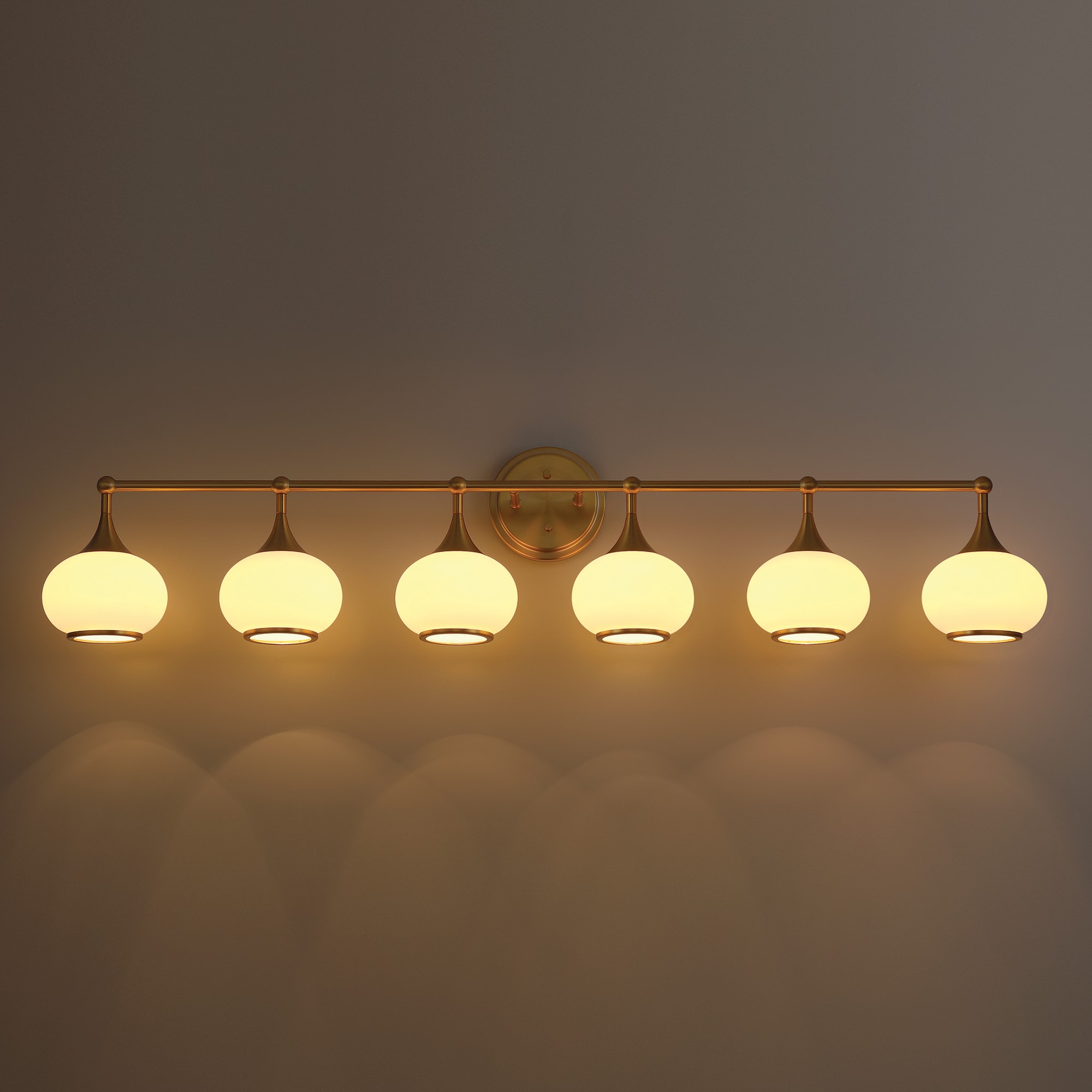 This 6-light vanity fixture dazzles and brightens larger bathrooms with plenty of modern glam style. It’s made of steel with a bold metallic finish, featuring an oval backplate and a horizontal bar that connects to six holders. The opal glass shades showcase an eye-catching design, reflecting the dimmable glow from six corresponding bulbs (sold separately). We love that you can install this vanity light either upward or downward, depending on your preference. Plus, it’s rated for damp locations, making it safe for high-moisture environments.