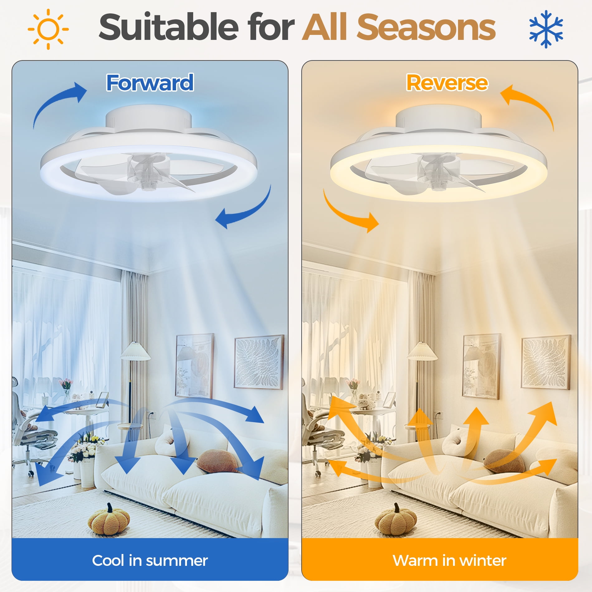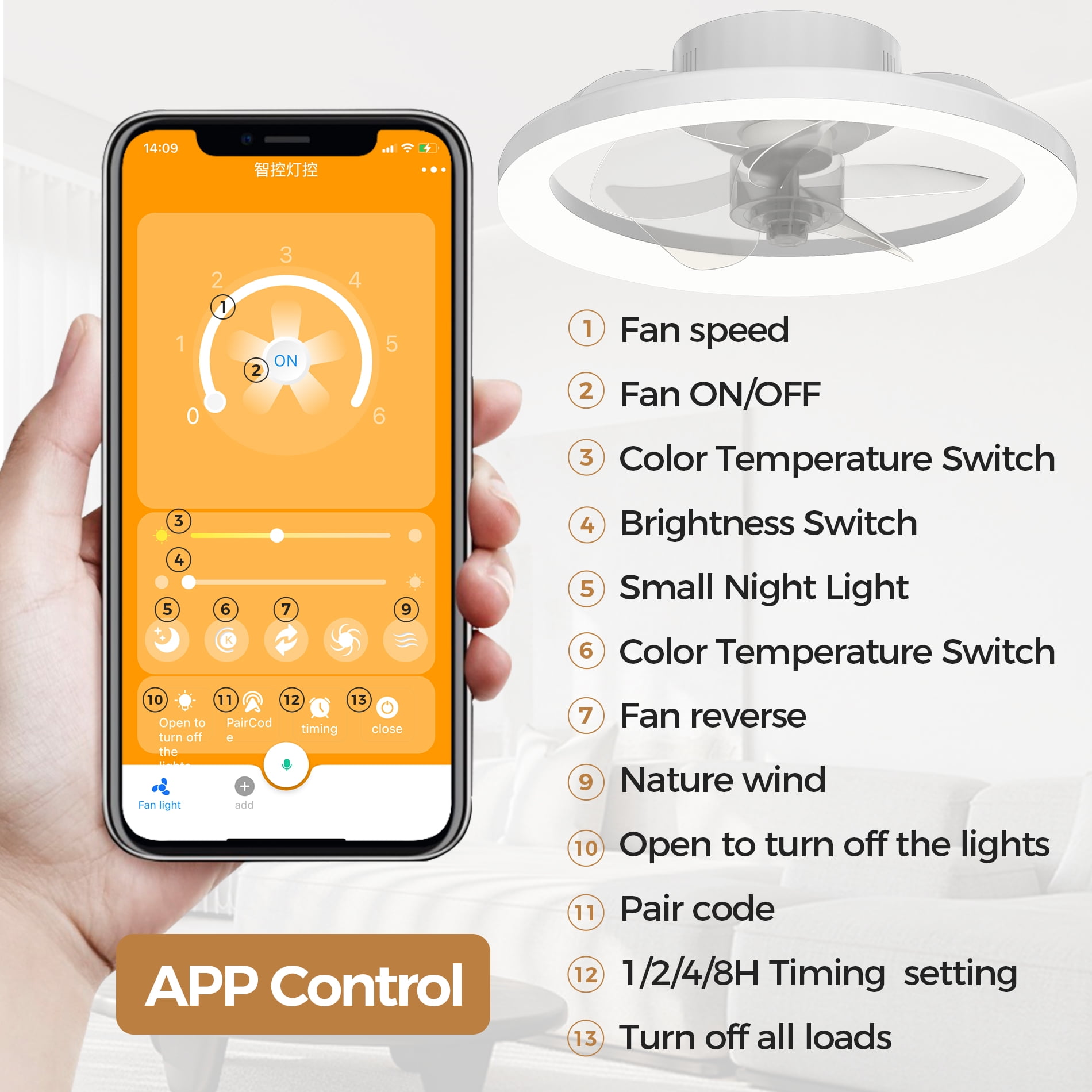 【Small Ceiling Fan with Light】: 16 Inch Modern ceiling fan with Lights, , the simple color scheme can be matched with any home decor style to make your room more fashionable and upscale. It is very suitable for covered Patios and office, study room, bedroom, farmhouse, living room, garage, kitchen, hallways or other small indoor spaces. 【Remote & APP Control】: Ceiling fan with remote allows you to control a 6-speed fan and 2 colors lighting, set a 2 hour timer, reversible DC motor, and go from downshift mode in summer to upshift mode in winter. Up to 50% energy savings compared to traditional AC motors and less than 50 dB noise. 【Dimmable Led Ceiling Fan】: White ceiling fan with light, press the “LIGHT ON/OFF” key to switch on the light {from natural light to cold white light} and then turn off the light. Set the memory function of the light: turn off the light and wait for about 15 seconds before turning it on to set the light. 【Easy To Install】: We have simplified the wiring, please refer to our detailed installation manual and installation video, follow the steps to complete the easy installation of the ceiling fan lights, and experience the joy of installation yourself. 【After-sales Service】: If you encounter any problems during the use or installation of the fan, you can contact us. (Note: this model is not suitable for use in an environment exposed to rain and sunlight.)