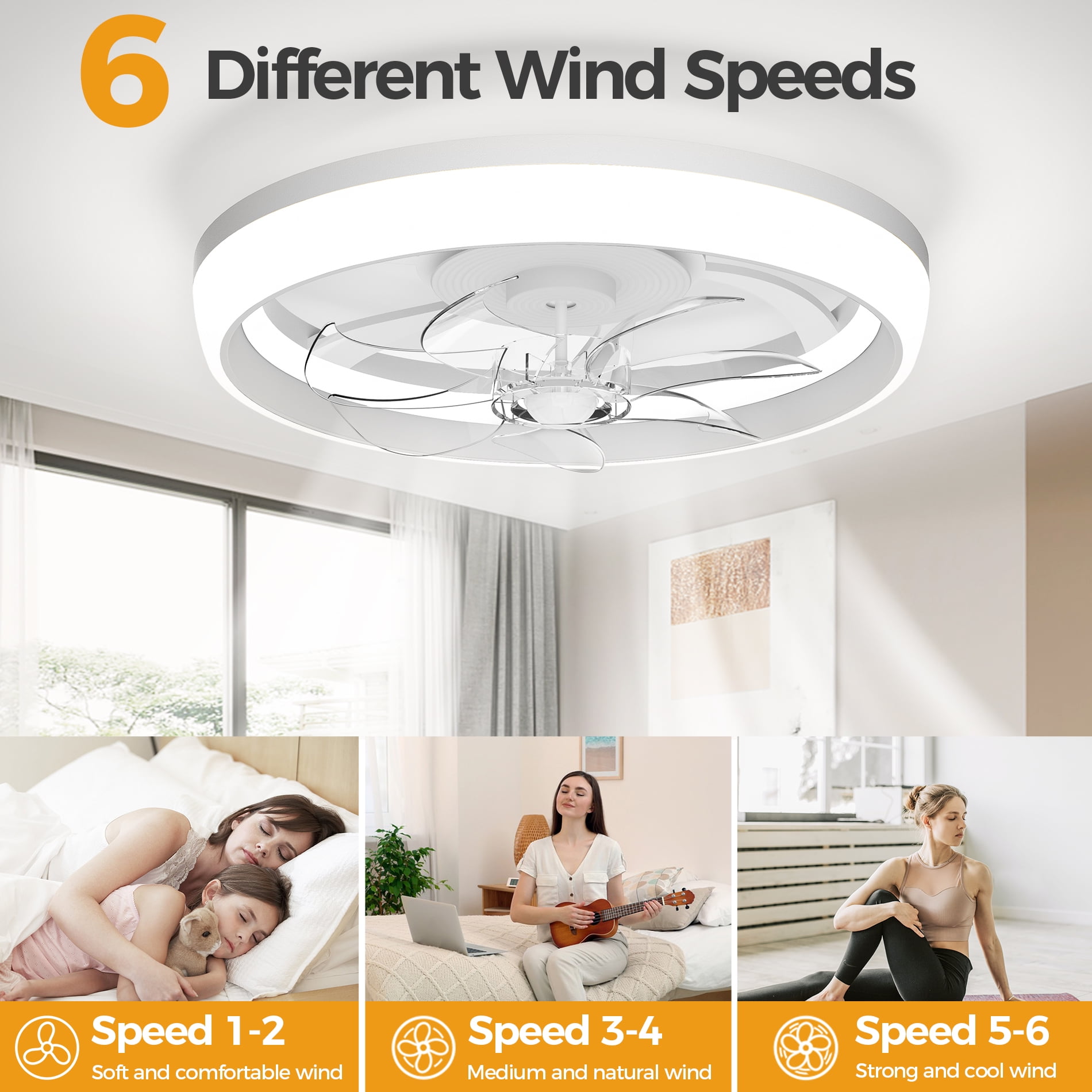 SKVEVN 19″ Ceiling Fan with Light – 3 Colors Lighting, 6 Wind Speeds, Remote Control&APP, Modern Dimmable LED, Smart Ceiling Fan for Bedroom(White)