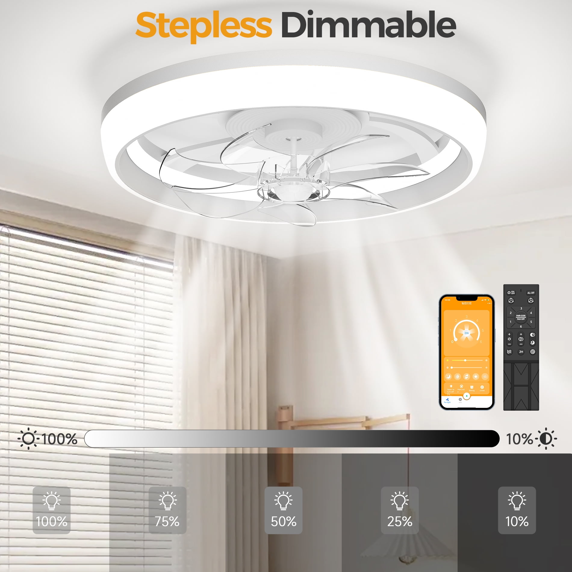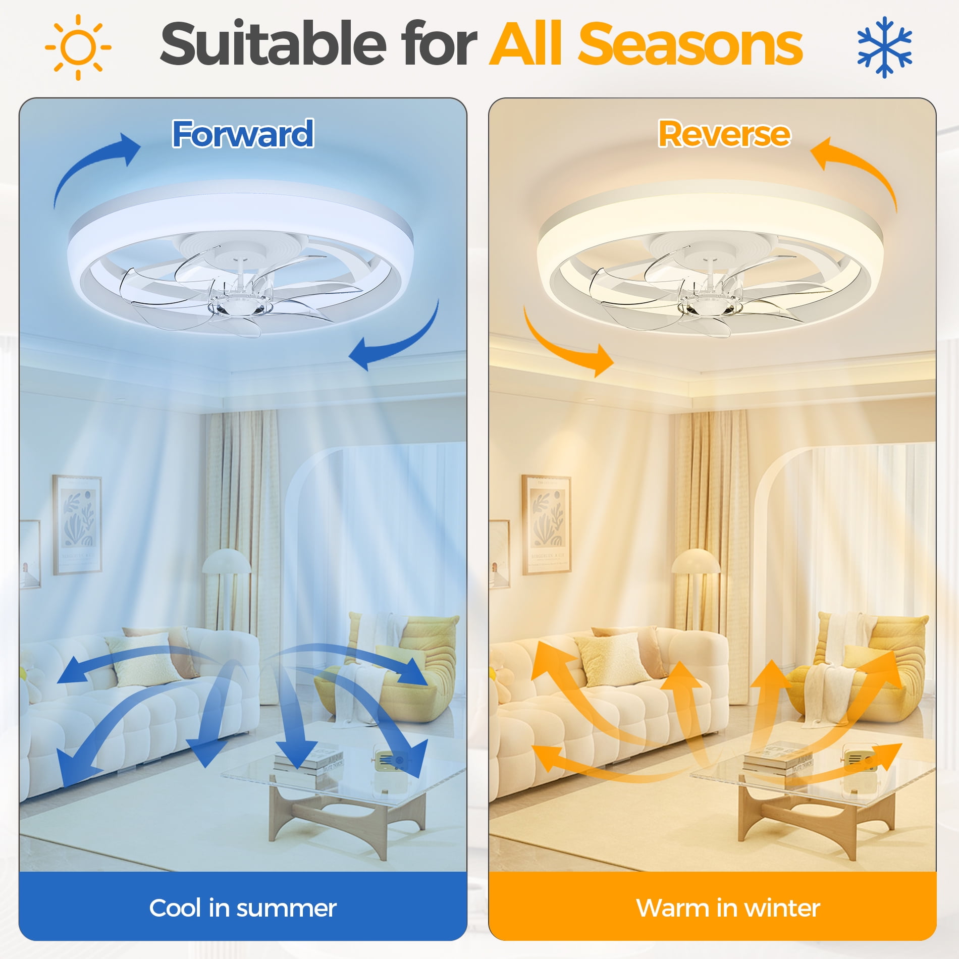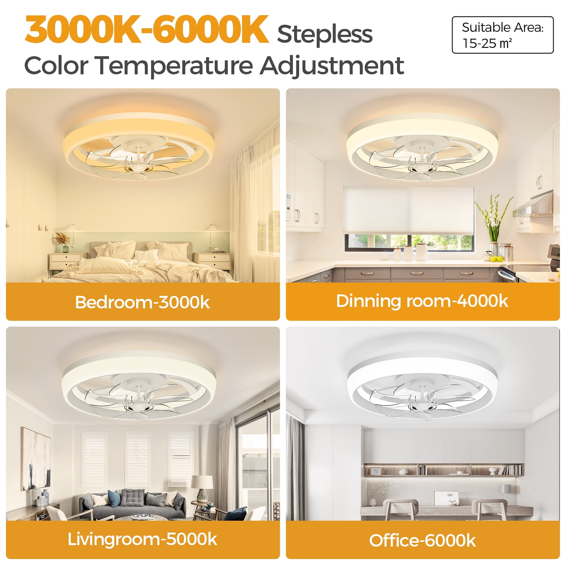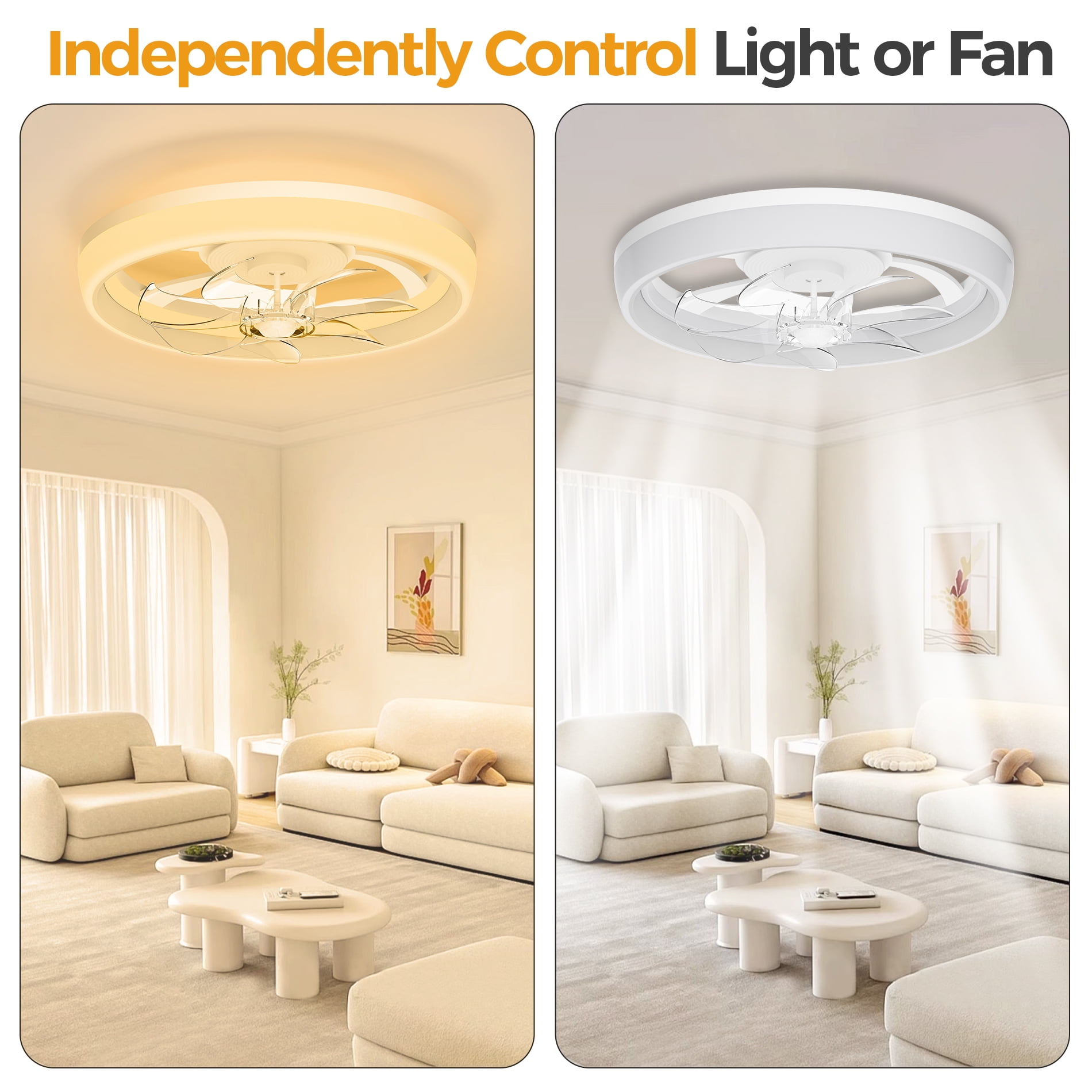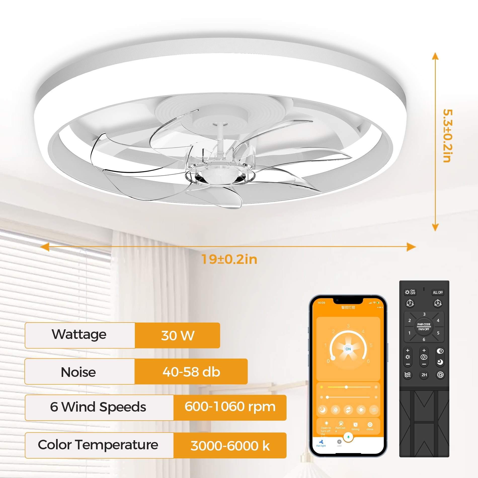 【Small Ceiling Fan with Light】: 19 Inch Modern ceiling fan with Lights, , the simple color scheme can be matched with any home decor style to make your room more fashionable and upscale. It is very suitable for covered Patios and office, study room, bedroom, farmhouse, living room, garage, kitchen, hallways or other small indoor spaces. 【Multi-Function Remote Control&APP】: Ceiling fan with remote&APP allows you to control a 6-speed fan and 2 colors lighting, set a 1/2/4 hour timer, reversible DC motor, and go from downshift mode in summer to upshift mode in winter. Up to 50% energy savings compared to traditional AC motors and less than 35 dB noise. 【Dimmable Led Ceiling Fan】: White ceiling fan with light, press the “LIGHT ON/OFF” key to switch on the light {from natural light to cold white light} and then turn off the light. Set the memory function of the light: turn off the light and wait for about 15 seconds before turning it on to set the light. 【Easy To Install】: The 19″ ceiling fans can be mounted on a 15° angled ceiling. We have simplified the wiring, please refer to our detailed installation manual and installation video, follow the steps to complete the easy installation of the ceiling fan lights, and experience the joy of installation yourself. 【After-sales Warranty Service】: The Skvevn brand provides 12-month worry-free warranty with 24-hour technical support. If you encounter any problems during the use or installation of the fan, you can contact us. (Note: this model is not suitable for use in an environment exposed to rain and sunlight.)