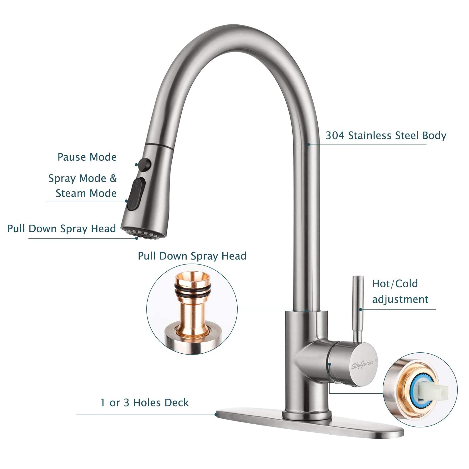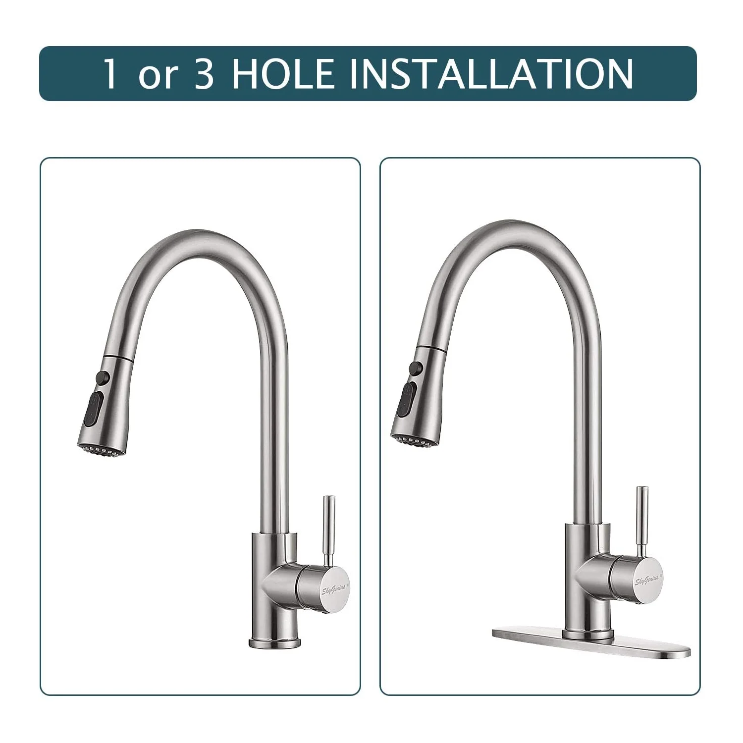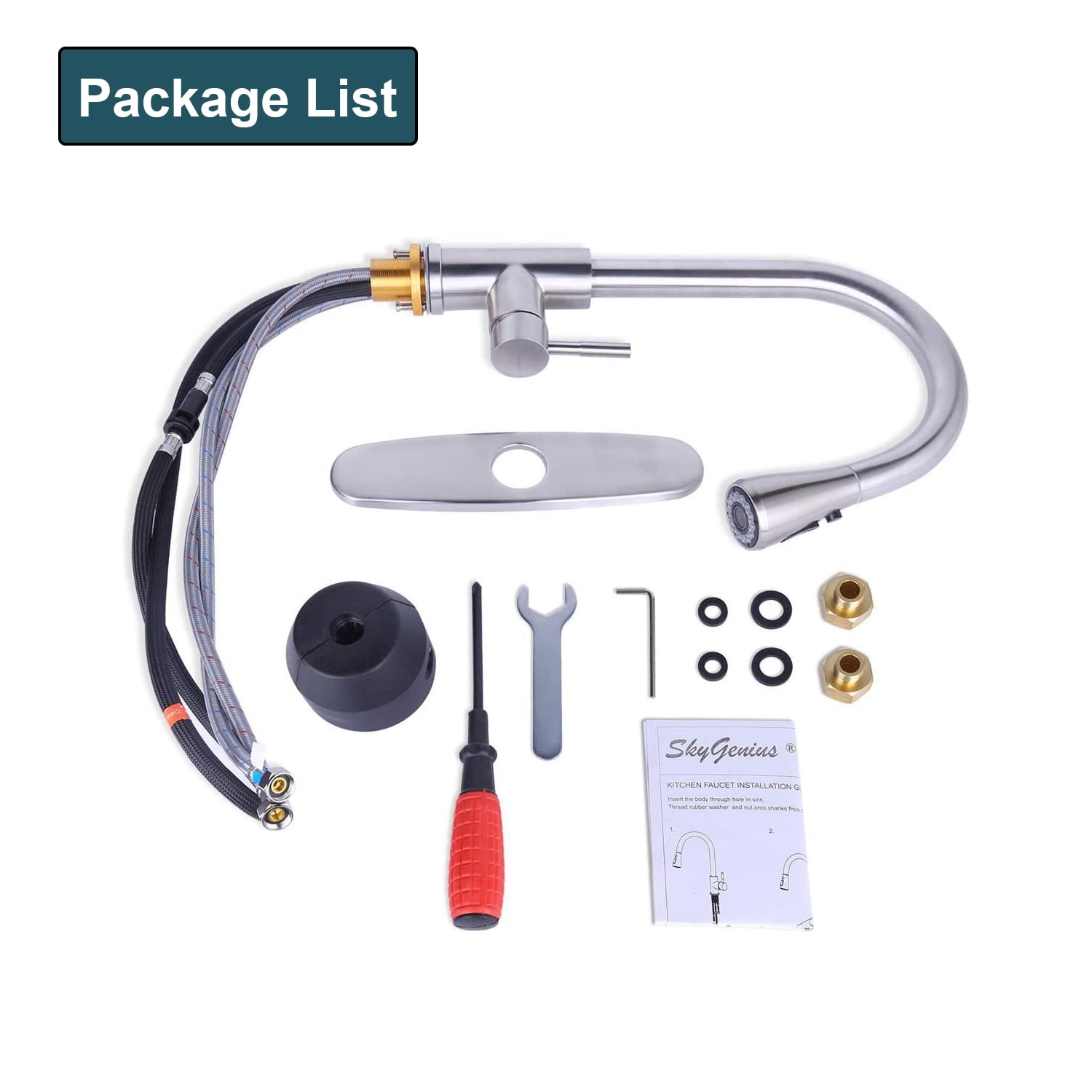 SkyGenius Single Handle Kitchen Sink Faucet with Pull Down Sprayer Brushed Nickel with Deck Plate Features Attractive Quality but Inexpensive: Made of premium 304 stainless steel (brushed nickle finish, not too bright but strong corrosion resistance) with classic ceramic single lever, rust-resistance and leak-proof 3 way spray settings: Multi-functional outlet water effect(STREAM/ SPRAY/ PAUSE) – stream for filling water, spray for rinsing, pause for avoiding splashing in multitask mode. Easy Installation: 1, 2 or 3-hole installation, with all mounting hardware, deck plate also included. Easy to Maintenance: Superior corrosion & rust-resistant finish prevent dirty from sticking to faucet surface. Specifications Installation Type: Deck Mounted(1 or 3 holes installation) Mounting hole: 1.37-1.5 inches Max Deck Thickness: 1.6 inches Hot/cold inlet hose length: 24 inches Finish: Brushed Nickel Main Body Material: Stainless steel Valve: Ceramic Valve Water Mode: Stream/Spray/Pause Water Feature: Mix Hot and Cold Package Included 1x Single Handle Kitchen Faucet 1x Weight Ball 1xDeck Plate 1xScrew Driver 1xHexagon Wrench (3mm) 2×3/8 to 1/2 Copper Connecting Nut 2xSeal ring (19mm*11mm*3mm) 2xSeal ring (14mm*8mm*3mm) 1xInstallation Instruction Note You may find residual water inside your brand new faucet since SkyGenius faucets are 100% tested with pressured-water at factory If you have any questions about our products, please feel free to contact us