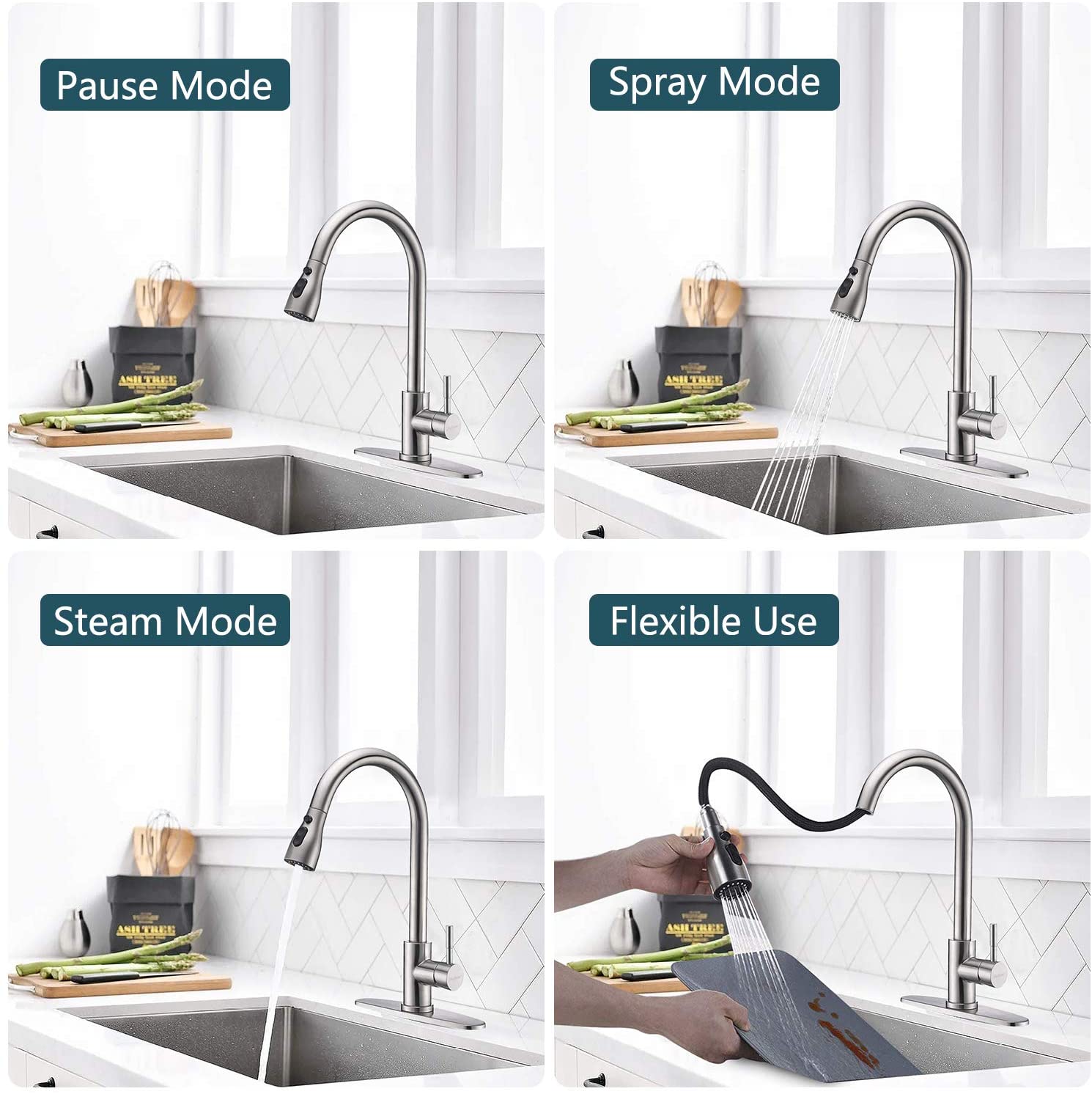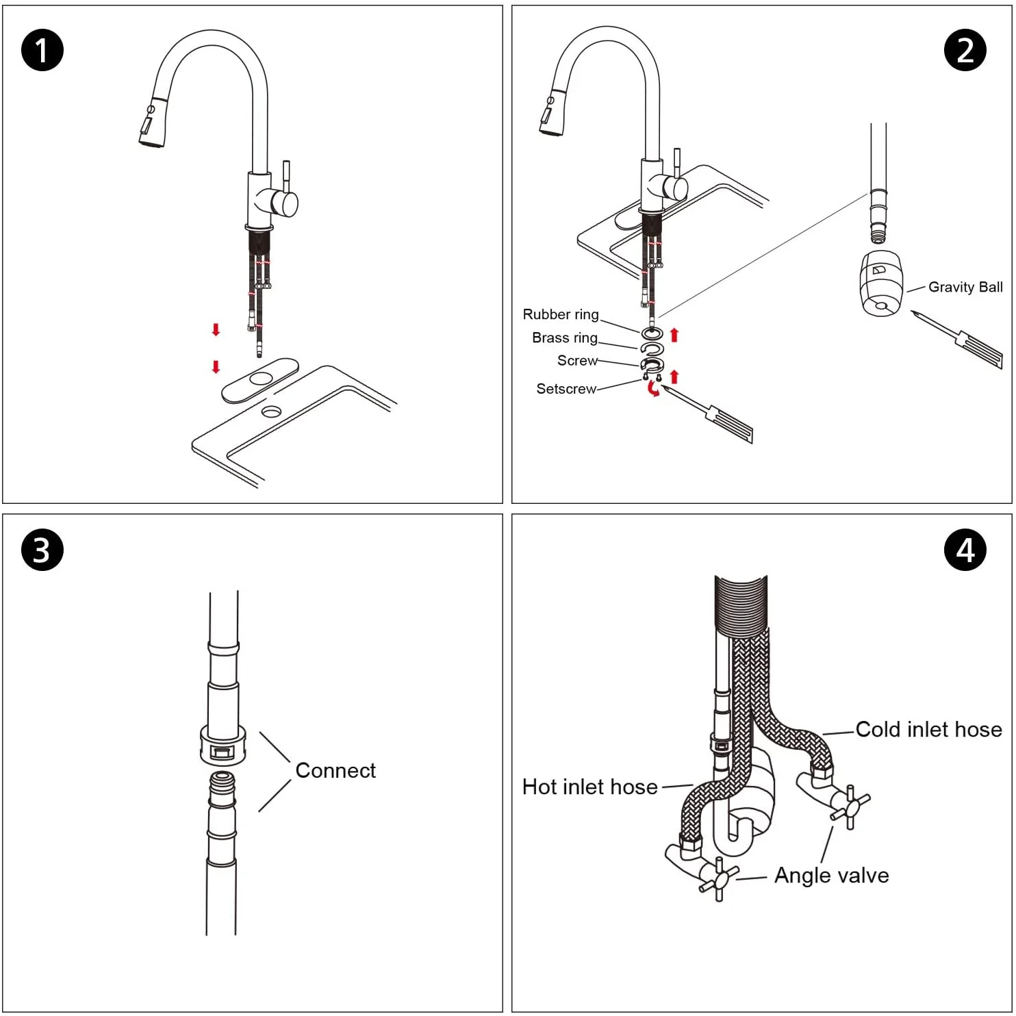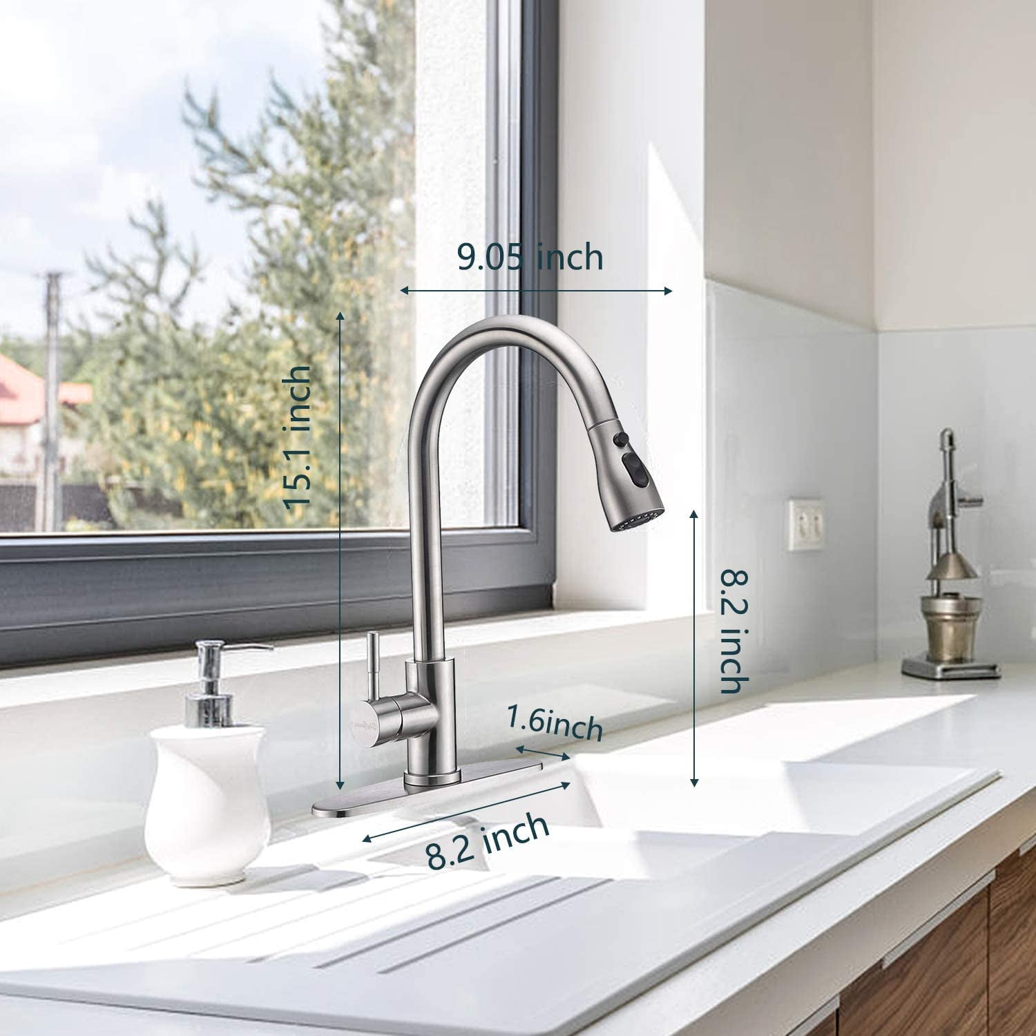 SkyGenius Single Handle Kitchen Sink Faucet with Pull Down Sprayer Brushed Nickel with Deck Plate Features Attractive Quality but Inexpensive: Made of premium 304 stainless steel (brushed nickle finish, not too bright but strong corrosion resistance) with classic ceramic single lever, rust-resistance and leak-proof 3 way spray settings: Multi-functional outlet water effect(STREAM/ SPRAY/ PAUSE) – stream for filling water, spray for rinsing, pause for avoiding splashing in multitask mode. Easy Installation: 1, 2 or 3-hole installation, with all mounting hardware, deck plate also included. Easy to Maintenance: Superior corrosion & rust-resistant finish prevent dirty from sticking to faucet surface. Specifications Installation Type: Deck Mounted(1 or 3 holes installation) Mounting hole: 1.37-1.5 inches Max Deck Thickness: 1.6 inches Hot/cold inlet hose length: 24 inches Finish: Brushed Nickel Main Body Material: Stainless steel Valve: Ceramic Valve Water Mode: Stream/Spray/Pause Water Feature: Mix Hot and Cold Package Included 1x Single Handle Kitchen Faucet 1x Weight Ball 1xDeck Plate 1xScrew Driver 1xHexagon Wrench (3mm) 2×3/8 to 1/2 Copper Connecting Nut 2xSeal ring (19mm*11mm*3mm) 2xSeal ring (14mm*8mm*3mm) 1xInstallation Instruction Note You may find residual water inside your brand new faucet since SkyGenius faucets are 100% tested with pressured-water at factory If you have any questions about our products, please feel free to contact us