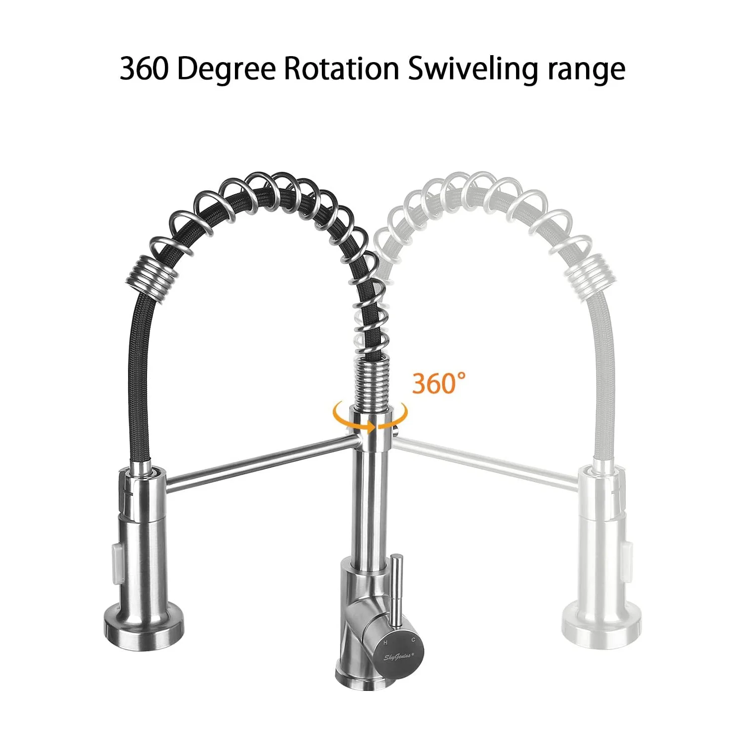 Features Commercial Design with Flexible Hose: Compact 16.2-inch height fits underneath almost any kitchen cabinet, flexible sprinklers can be rotated at 360 degrees, allowing you to easily reach areas of your sink 360 degree rotation: 360° degree rotation spout and nozzle is suitable for any single bowls or double bowls. Dual-function Spray head, Stream & spray mode: Multi-Flow-Two function spray wand allows you to easily and ergonomically switch from spray to stream to a high water flow-lasting powerful flow. Specifications Material: Stainless Steel, Ceramic Finish: Brushed Nickel Faucet height: 16.2 inch Spout Height: 4.5 inch Spout Reach: 9.6 inch water supply hoses: 32.0 inch Max deck thickness: 1.8 inch Mounting hole: 1.37-1.5 inch Valve connection: 3/8inch Package Included 1x Kitchen Sink Faucet 1x Screw Driver 1x Wrench 1x Hexagon Wrench 1x Installation Instruction