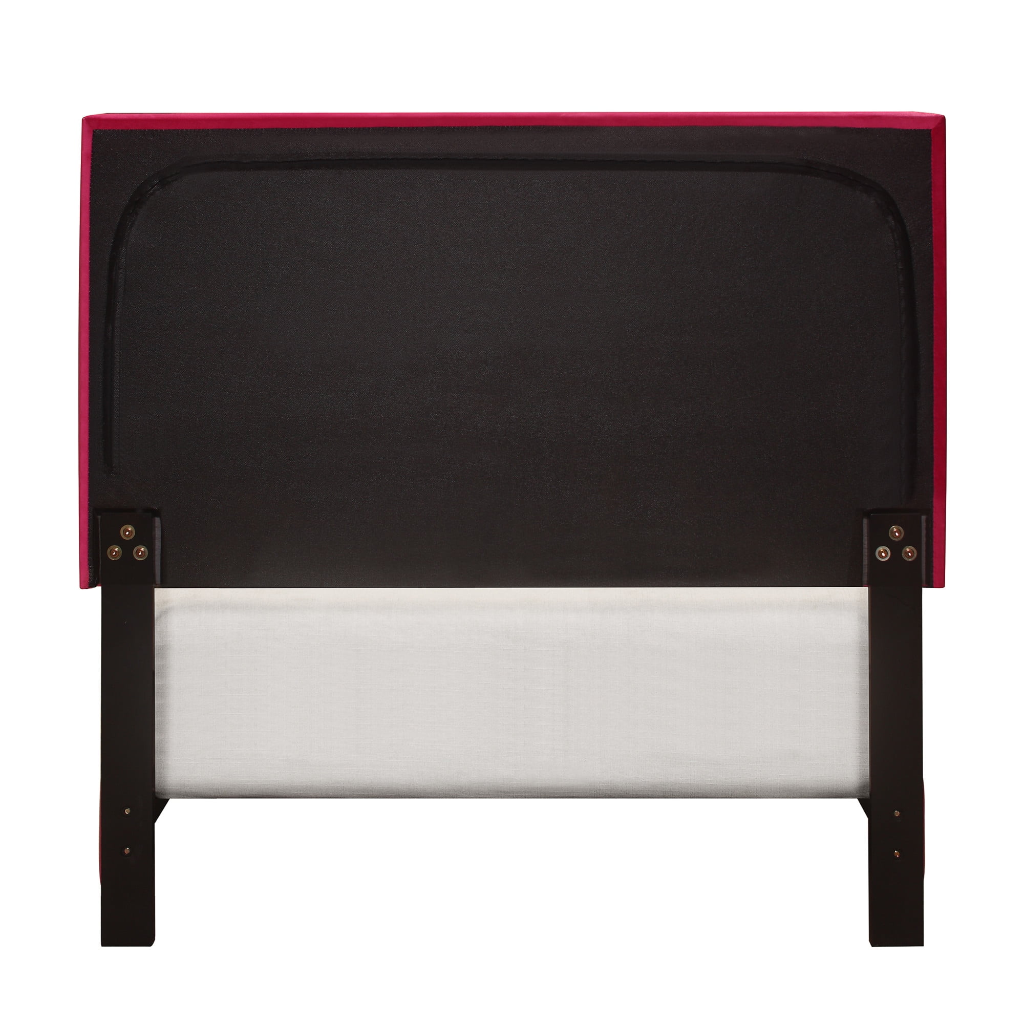 Sleek design twin platform bed, for Teen/Child Features an upholstered headboard with nail head trim Espresso finished wood legs Dimensions: 79.8L x 42W x 40H 100% Polyester fabric 10 inch mattress recommended, not included Item will ship in one box Bed includes: headboard, footboard, rails, slats Footboard/Side Rails Depth: 8.5 In. For residential use Assembly required