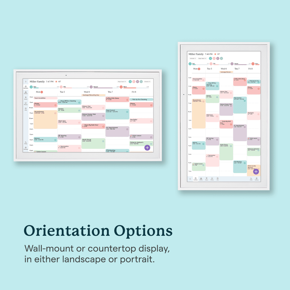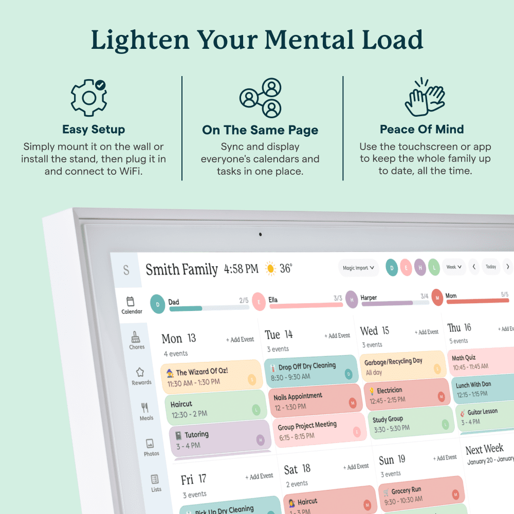 Enjoy a 15-inch touchscreen digital display that can be mounted on the wall or displayed on a high-quality metal stand (included). Connect the device to your home’s WiFi network and sync it with your Google, iCloud, Outlook, Cozi, or Yahoo calendars to keep your family’s schedule organized. Add and edit events, chores, and meal plans directly on the touchscreen display or through the free mobile app, making it easy to stay on top of your family’s activities. Utilize the interactive chore chart to encourage healthy habits and independence, and never wonder “what’s for dinner?” again with the built-in meal planning feature. Download the Free App to Stay Informed From Anywhere: Access and manage everything on your Skylight Calendar through the mobile app. The Basic Plan offers core features like Meal Plans, Sync Online Calendars, and a Chore Chart. For additional tools, the optional premium Plus Plan provides features such as Magic Import, Photo and Video Screensaver, and advanced Meal Planning, replacing the single-slot Dinner Plans for more flexible meal management Backed by a 3 year warranty, this all-in-one family calendar and chore chart is the perfect solution to keep your household organized and running smoothly.