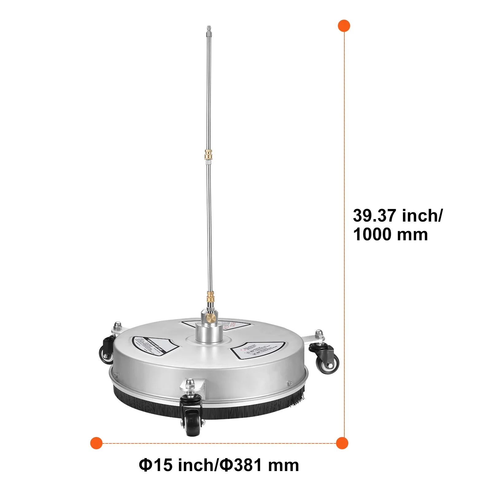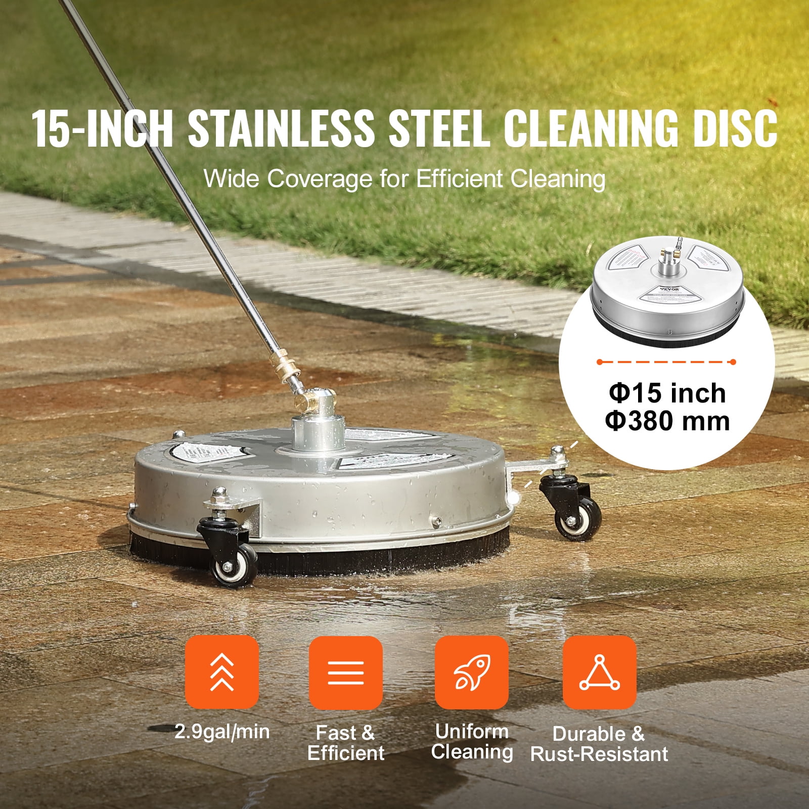 Product Description SKYSHALO Pressure Washer Attachment-Makes Cleaning a Breeze The φ15-inch stainless steel cleaning disk makes cleaning a breeze. With quick connection and built-in rotating nozzles, dirt is no longer a problem. The robust stainless steel material makes the product more sturdy and durable, while also being rust-resistant. Thorough Cleaning With a maximum 4000 PSI high water pressure, it solves tough cleaning challenges in one go. The dirt has nowhere to hide, making your cleaning tasks more efficient. Stain Removal Made Easy Whether it’s mud stains, bird droppings, or brick stains, they can all be cleaned in one go, without the need for repeated cleaning. No more struggling with stains, no more worries about dirt issues. Dual Nozzle Design Dual Nozzles, with 0°/15°/25°/40°/65° spray angles, provide wider coverage and more comprehensive cleaning. The bidirectional nozzle design directs water pressure in all directions, ensuring dirt has nowhere to escape. Multiple Accessories Comes with a variety of professional accessories, including 2 quick-connect extension poles to help you get into cleaning faster, 1 unclogging needle to address blockage issues as needed, and additional wrenches and screws. You can refer to the instruction manual for installation details. Large Cleaning Area No need to move small cleaning tools back and forth. The φ15-inch cleaning disk can sweep large areas in one go, bringing efficiency to your cleaning tasks. Time and Energy Savings Equipped with a powerful 4000 PSI water pressure and a 2.9 gallons per minute cleaning force, achieving ideal results only requires one cleaning session, saving you a significant amount of valuable time and energy. Specifications Item Model Number: DD15S-1 Main Material: Stainless Steel Net Weight (with all Accessories): 8.38 lbs / 3.8 kg Item Dimensions: Φ15 in x 39.37 in / Φ380 x 1000 mm Cleaning Disc Outer Diameter: φ15 in / 380 mm Maximum Allowable Pressure: 4000 psi Water Flow Rate: 2.9 gal/min ±5% Package Content Pressure Washer Surface Cleaner x 1 Nozzles x 2 Extra Nozzles x 5 Extension Wands x 2 O-Rings x 4 Teflon Tape x 1 Cleaning Needle x 1 Swivel Wheels x 3 M6 Nuts x 6 M6*15 Screws x 7 Open-End Wrench x 1 Hex Key x 1 User Manual x 1