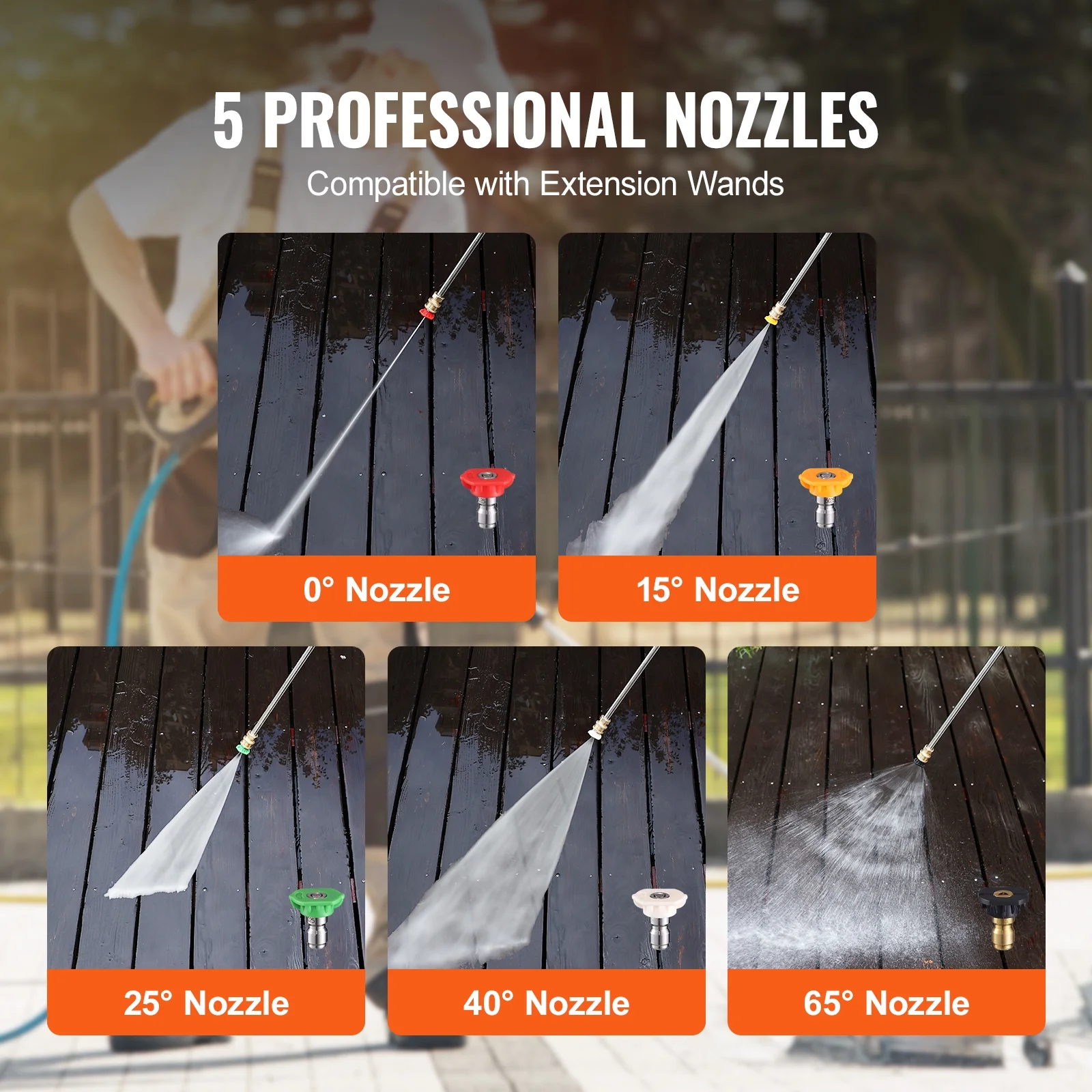 φ15 Inch Fast and Efficient: With a high flow rate of 2.9 gallons per minute, it ensures even cleaning, leaving no inch of the ground untouched. Whether it’s a large-scale task or everyday cleaning, the φ15-inch cleaning disk can handle it with ease. Enjoy efficient cleaning that saves you time and effort. 4000 PSI High Water Pressure: Rated at 3000 PSI, with a maximum water pressure of up to 4000 PSI, and featuring a 360° rapid dual-nozzle rotating cleaning technology at the bottom, it quickly eliminates mud and dirt. Say goodbye to struggling with stubborn stains. 1/4″ Quick Connector: Equipped with a standard 1/4-inch quick connector, ensuring a seamless connection. The connector is sturdy and durable, detachment-resistant, and the 180° rotation feature provides you with greater flexibility in operation. Clean Every Nook and Cranny: The smart design of the brush ensures that your cleaning work is clean and comfortable. The built-in rotating nozzle ensures thorough cleaning without any missed spots, effortlessly covering every inch of the surface. Whether it’s mud stains, bird droppings, or brick stains, they can all be cleaned in one go, achieving ideal results. Professional 5 Nozzles: With different spray angles of 0°, 15°, 25°, 40°, and 65°, you can easily tackle various cleaning scenarios, helping you handle everyday household cleaning tasks with ease.