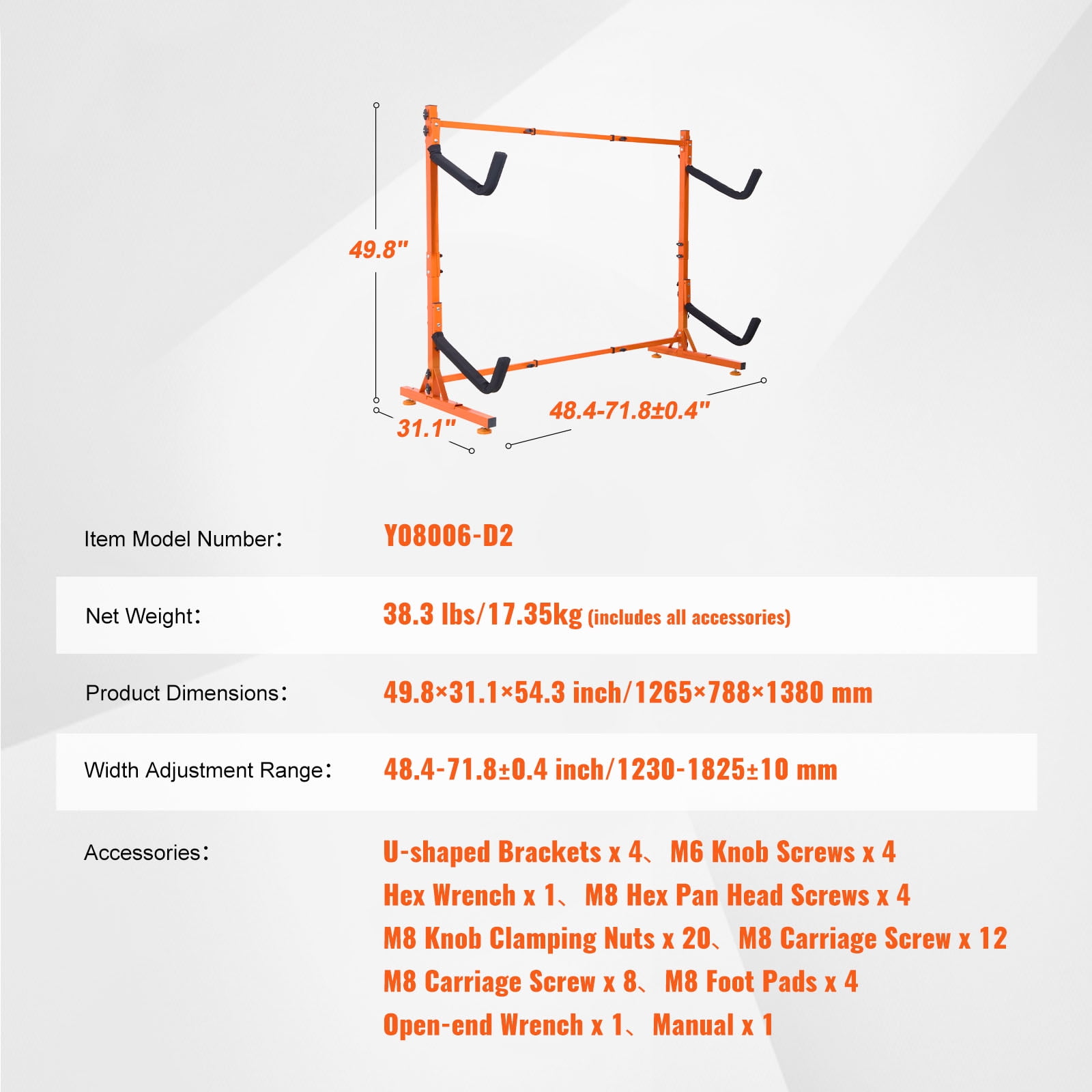 Elevate your kayak storage with our robust freestanding rack, designed to support up to 175 lbs (79.45 kg) and accommodate two kayaks effortlessly. This kayak storage rack features a high-quality, non-rusting spray coating, ensuring it withstands the corrosive effects of saltwater. Each support arm has a non-slip rubber sleeve, effectively preventing your kayaks from slipping off and offering additional protection against scratches. This kayak storage stand allows quick adjustments without the need for tools. Its width can be adjusted from 48.4″” to 71.8″” (1230-1825 mm) to accommodate a wide range of water sports equipment, including kayaks, small canoes, and paddleboards. Our canoe storage stand features a triangular base, minimizing the risk of your kayak tipping. This stable design ensures the safety of your vessel, preventing wear and tear. The support arms also have waterproof rubber sleeves to protect your boat’s surface from scratches and damage. Constructed from industrial-grade steel, the kayak stand is designed for heavy-duty use. Its thickened pipes enhance load-bearing capacity, ensuring it remains reliable and resistant to deformation or fractures over long-term use. The freestanding kayak stand’s portability allows it to be easily relocated indoors or outdoors. Whether you place it in a garage, boat dock, kayak rental shop, or campground, this stand enables neat and secure kayak storage in various settings. Featuring a rust-resistant spray on its surface, the kayak stand is built to withstand harsh conditions, including saltwater, sun, and rain exposure. This durable coating ensures the stand remains in excellent condition, free from rust and corrosion, even in outdoor environments. Equipped with all necessary mounting hardware, including screws, bolts, and wrenches, the freestanding kayak rack can be assembled quickly following the detailed instructions provided. The inclusion of hand screws simplifies the assembly process, making installation easier and more user-friendly. Item Model Number: Y08006-D2 Capacity: 2 pcs Load Capacity: 175 lbs/79.45 kg Material: Q235B Support Arm Length: 21.2 inch/535.94 mm Width Adjustment Range: 48.4-71.8??0.4 inch/1230-1825??10 mm Product Dimensions: 49.8??31.1??54.3 inch/1265??788??1380 mm Net Weight: 38.3 lbs/17.35kg (includes all accessories) 1 x Kayak Storage Stand 4 x U-shaped Brackets 4 x M6 Knob Screws 1 x Hex Wrench 4 x M8 Hex Pan Head Screws 20 x M8 Knob Clamping Nuts 12 x M8 Carriage Screws 8 x M8 Carriage Screws 4 x M8 Foot Pads 1 x Open-end Wrench 1 x Manual