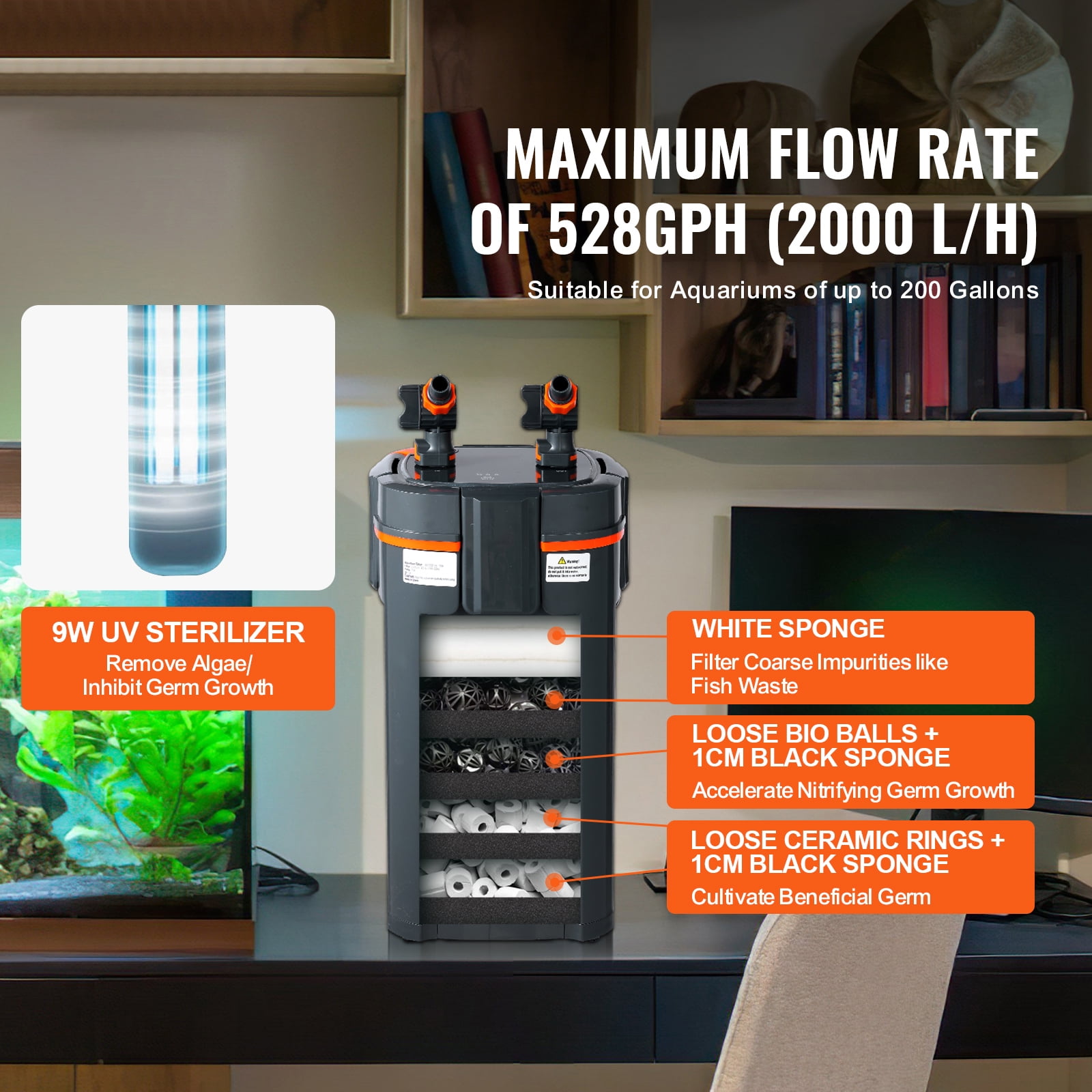 Efficient Filtration: This pump is designed with a maximum flow rate of 528GPH (2000 L/H) and a power of 20W. It is recommended for use in 200-gallon freshwater pools, turtle tanks, and fish tanks. The water flows through the media layer to filter the water and ensure that the water looks clean. Each layer has a sponge to hold it in place and comes with ceramic rings and bio balls. Silent Operation: Equipped with pure stainless steel filter, the filter works very quietly. There is no air inside the filter, ensuring low power consumption and low noise flow. The noise is less than 50 decibels, so your home life will not be disturbed while effectively purifying water quality. User Friendly: The UV light is an upgraded version of the timer, providing 4/8/24 hours automatic on/off settings. It also includes a flow regulating valve that adjusts the water flow from high to low and shuts off completely when needed. The design of the quick-release head makes it easy to clean and maintain, and there is an oil film removal device at the inlet to ensure sufficient oxygen in the fish tank. High Sealing: The quick-release connection design enhances the sealing of the port, greatly improves the efficiency of disassembly and cleaning, and optimizes the simple design. Thickened and reinforced silicone ring design enhances leak resistance. The rotor structure has been optimized and both ends of the rotor are integrated for longer service life. General Purpose: This aquarium filter first removes residue and waste from fish and turtles in the aquarium, keeping the water clear and healthy. Suitable for fish farming and can be used in a variety of environments, including home ponds, aquarium display ponds, flower and bird market ponds, etc. This is one of the most important purchases for aquarists.