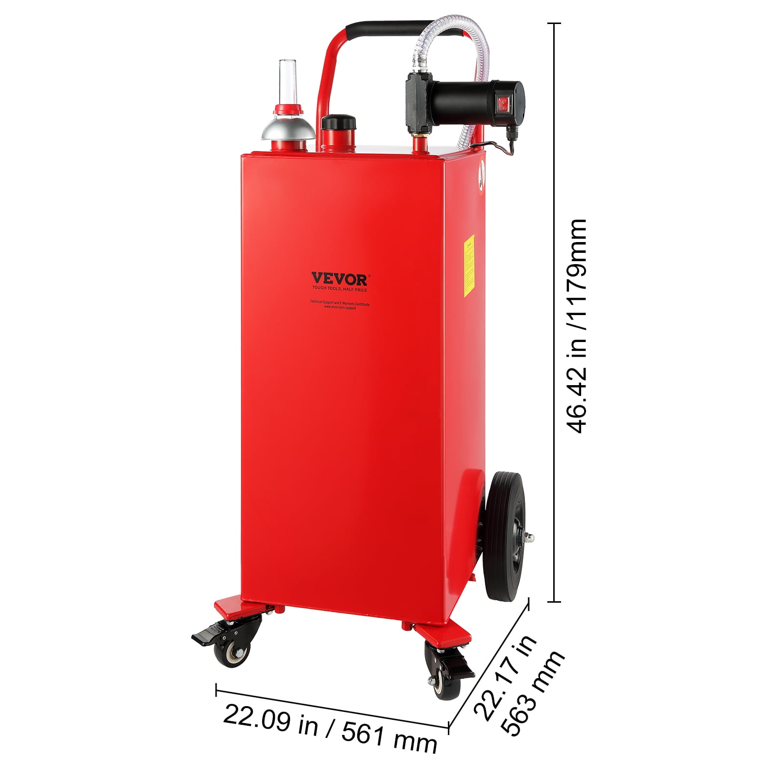 Product Description 30 Gallon Portable Fuel Caddy This 30-gallon high-capacity PE fuel caddy saves you the hassle of going back and forth to refuel at multiple locations and is ideal for gasoline, lubricating oil, and machine oil. This gas caddy features 2.5″ universal wheels(front), 10″ rear wheels, and a metal wire hose, which refuels faster and more efficiently! 30 Gallon Large Capacity With a large 30-gallon capacity, this fuel caddy can store enough fuel for multiple vehicles, saving you the time and effort of going back and forth when refueling at multiple locations and increasing work efficiency for gasoline, diesel, and machine oil! Durable Rubber Wheel This gas caddy is equipped with 2.5″ universal wheels(front) and 10″ rear wheels that can be easily moved to any refueling point. The rubber wheels will not rust, ensuring long-lasting use and providing you with reliable service. High-Quality Electric Pump This electric pump’s high-quality wire hose and high-power design ensure fast and stable oil delivery. The 5 m/16.4 ft head and 6.2 gal/min oil discharge speed help you to complete the oil transfer more efficiently. User-Friendly Design This gas caddy with pump is made of carbon steel material, durable and corrosion-resistant, which can avoid the damage of direct sunlight to the oil to a certain extent and ensure the quality of the oil. Wide Application The portable fuel tank can be easily placed in truck trunks, garages, stores, scrap yards, and tool kits and is ideal for use in cars, motorcycles, boats, lawn mowers, and snow blowers for fast and reliable transfer of liquids. Ball Valve This refueling truck is built with a ball valve that protects against leaks and ensures that the refueling process works in a neat and orderly manner. Specifications Item Model Number: JGC30E Capacity: 30 Gallon / 113.6 L Pump Power: 180W Pump Input Voltage: 12V DC Fuel Type: Diesel, Lubricating Oil, Machine Oil Max. Flow: 23.5 L/min Hose: ?19 mm (Inside Diameter) x 250 cm Rubber Wheel: 2.5″ Universal Wheel(Front); 10″ Rear Wheel Finish: Plastic Spray Color: Red Main Material: Carbon Steel (Cold Rolled Steel) Product Weight: 66.73 lbs / 30.28 kg(All accessories included) Product Dimensions: 22.09 x 22.17 x 46.42 in / 561 x 563 x 1179 mm Power Cord: 2 Core x 1.5 mm? x 130 cm Head: 16.4 ft / 5 m Package Content 1 x PTFE Tape 1 x User Manual