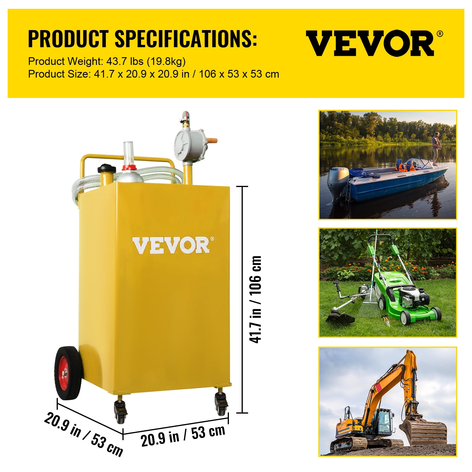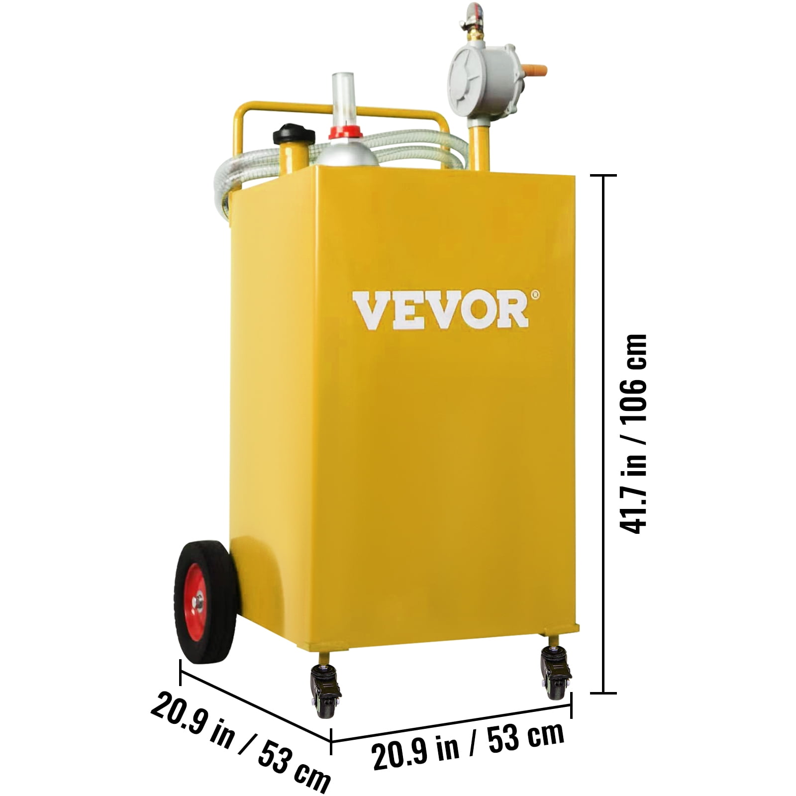 Product Description Large 35 Gallon Fuel Tank No matter what you’re refueling, our portable gas tank is designed to handle the job. The versatile caddy is approved to safely store and dispense up to 30 gallons of gasoline, diesel, and kerosene fuels. Rotary Manuel Pump The efficient bi-directional pump dispenses or siphons fuel by changing the rotation of the crank handle, allowing you to eliminate overfilling tanks by pulling excess gas or diesel back into the caddy. Designed just for you The gas caddy has a premium structure. It includes 8″ large wheels and 2″ small wheels, an anti-static ground clamp, filler neck with gas cap, handy tube holder, and an easy leverage push handle.All these designs will support efficient and secure work. High-Strength Steel Tank The 35 gallon diesel tank is made of high-quality 201 stainless steel material, offering extreme resistance against mechanical damage and corrosion. Such premium material will ensure long-time use. Secure & Efficient to Fill 9.8 FT automotive-grade rubber hose facilitates efficient and safe fueling. The heavy-duty nozzle supports fast fuel delivery. Just open the clip and let it flow. You can quickly fill your fuel tank in minutes. Wide Application Use The portable gas tank is designed to transport diesel or gasoline fuel to your job site. It is ideal for tanker trucks, ships, outdoor industries, construction industries, and more. Specifications Model: 35 Gallon Fuel Caddy Tank Size: 41.7 x 20.9 x 20.9 in/ 106 x 53 x 53 cm Fuel Type: Gasoline, Diesel, Kerosene Pump Type: Two Way Rotary Pump Hose Length: 9.8 ft/ 3 m Material: 201 Stainless Steel Big Tire Diameter: 8 in/ 20.3 cm Small Tire Diameter: 2 in/ 5.1 cm Product Color: Yellow Package Content 1 x Fuel Caddy