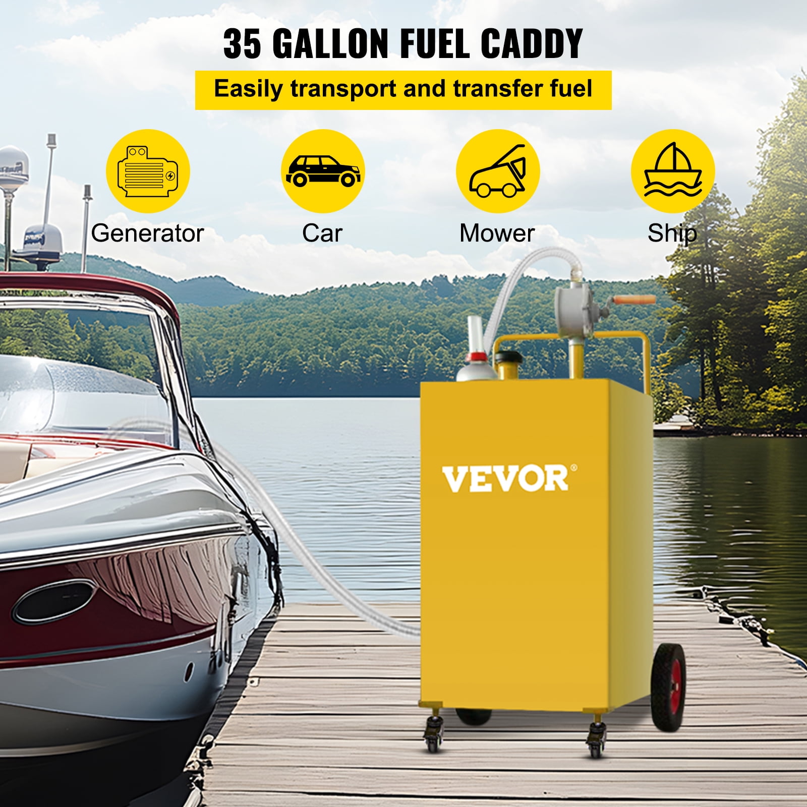 SKYSHALO 35 Gallon Gas Caddy, Fuel Storage Tank with 4 Wheels, Portable Fuel Caddy with Manuel Transfer Pump, Gasoline Diesel Fuel Container for Cars, Lawn Mowers, ATVs, Boats, More, Yellow