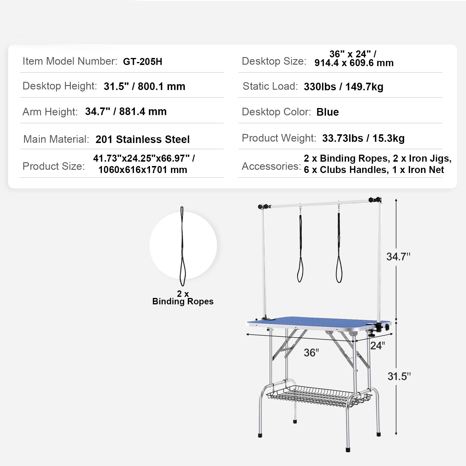 Product Description SKYSHALO Pet Grooming Table – Meeting Various Pet Grooming Needs Crafted entirely from stainless steel, ensuring enhanced durability and strength. The tabletop is coated with a waterproof, non-slip, heat-resistant layer, providing a stable platform for pet grooming and care. Perfect for medium-sized pets, this table is suitable for both home and professional pet grooming shops. Durable Pet Grooming Table This pet grooming table is constructed entirely from stainless steel, ensuring stability and robust weight-bearing capacity. Additionally, the aluminum alloy edging enhances table strength, and the reinforced metal tray remains deformation-free and securely attached. Clamp-Adjustable Grooming Arm The pet grooming table features a clamp-adjustable grooming arm design, allowing for overall height adjustment and reducing the need for bending. The adjustable H-shaped arm further enhances stability. Thoughtful Details Our pet grooming table boasts several thoughtful design details, including a foldable anti-bend support frame that stays sturdy, dual dog leash design for secure pet restraint, and non-slip, heat-resistant rubber foot pads that prevent sliding, ensuring a convenient and safe experience for your pet. Simple and Quick Installation Installation is straightforward and quick, requiring no professional expertise. Even non-professional pet groomers or beginners can easily complete the installation independently, without the need for tools. Wide Application The table is covered with a waterproof, non-slip, heat-resistant coating, providing a stable platform for various pet grooming activities such as bathing, trimming, drying, brushing, and other pet care tasks. It’s particularly suitable for medium-sized pets. Convenient Storage Shelf The mesh storage tray with four hooks hangs on the lower support frame and can accommodate leashes, dog toys, brushes, clippers, and other grooming supplies and accessories. Each side has two hooks for secure attachment, and the tray can be easily removed when not in use. Specifications Model: GT-205H Desktop Size: 36″ x 24″ / 914.4 x 609.6 mm Desktop Height: 31.5″ / 800.1 mm Static Load: 330lbs / 149.7kg Arm Height: 34.7″ / 881.4 mm Desktop Color: Blue Main Material: 201 Stainless Steel Product Weight: 33.73lbs / 15.3kg Product Size: 41.73″x24.25″x66.97″ / 1060x616x1701 mm Package Content 1 x Pet Grooming Table 2 x Binding Ropes 2 x Iron Jigs 6 x Clubs Handles 1 x Iron Net