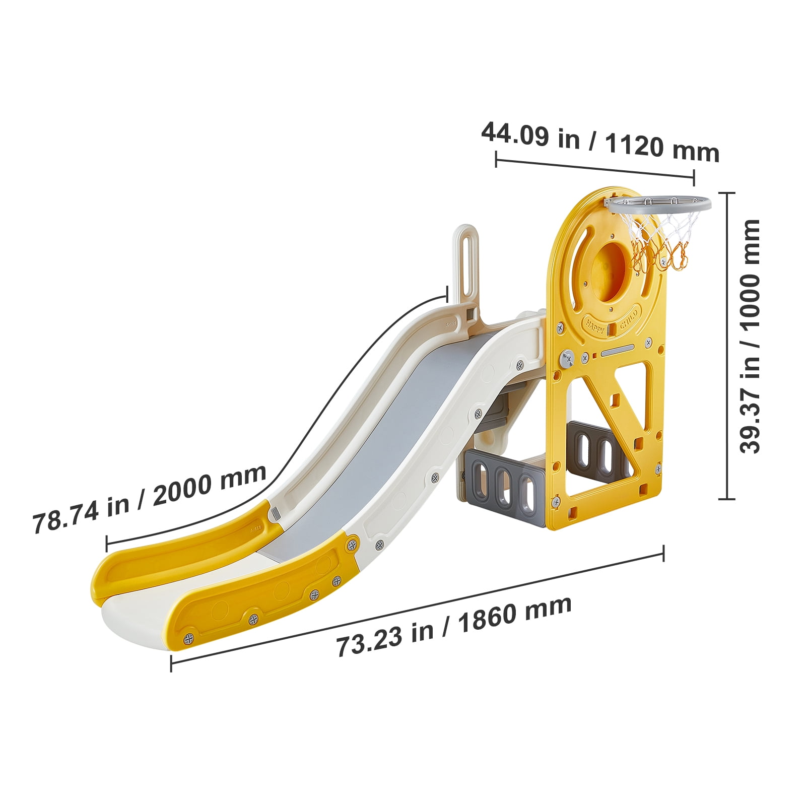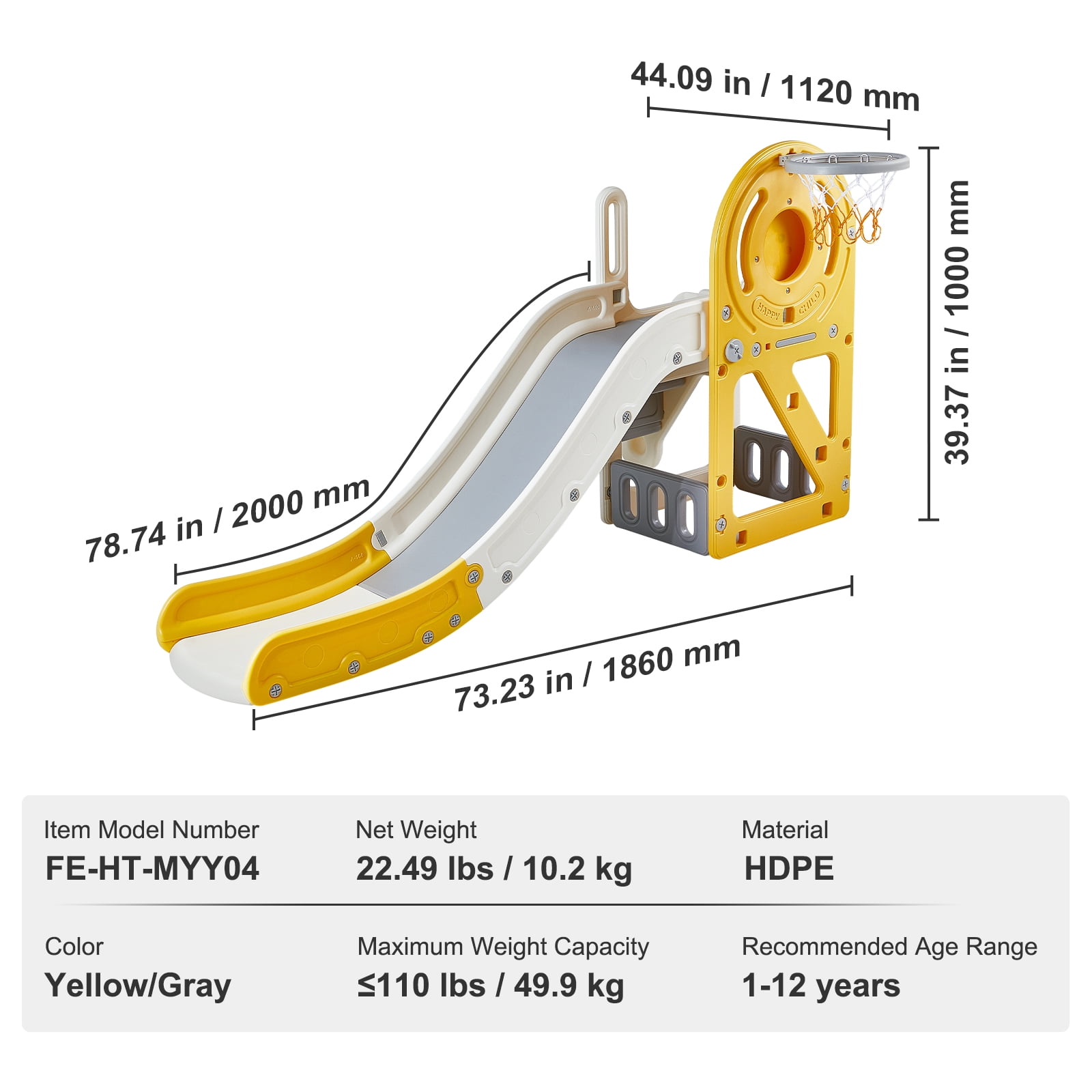 Product Description Indoor Toddler Children’s Fun Space Do not need to go out to pay for the amusement facilities. Let children feel at ease to play at home! Thoughtfully equipped with a buffer zone, the maximum bearing capacity of 110 lbs. Create a secure place for your children. 4 in 1 kids slide The SKYSHALO indoor Toddler slide features 4 activity areas including rock climbing, slide, shooting hoop and storage space, allowing babies to do a series of coherent movements such as running, jumping, bowling, climbing, sliding, which is much more fun than a single sport. And can develop coordination and sense of adventure in the game, while improving physical fitness and burning excess energy. Security Guard The slide is equipped with U-shaped anti-rollover base and slide buffer to protect children from falls. 360° rounded treatment and raised handrails, to provide children with a full range of fun. Enjoy the Fun of playing The combined play slide can cultivate children’s physical strength and brain power, but also invite children from the neighborhood to play together. Hassle-free Installation We have prepared the installation kit for you, no additional purchase, screws, instructions, basketball rack, and basketball. The simple installation allows you to have more fun. HDPE Safety Material Strictly selected HDPE material, the slide is not easy to break deformation, 360° all-round grinding without burrs to protect the baby’s tender skin. With Non-Slip Pads Equipped with 2 anti-slip pads, self-adhesive to the bottom of the slide, no matter what, the floor material can increase friction and safeguard the slide from shifting to cause accidents. Specifications Item Model Number: FE-HT-MYY04 Item Dimensions: 73.23 x 44.09 x 39.37 in / 1860 x 1120 x 1000 mm Net Weight: 22.49 lbs / 10.2 kg Material: HDPE Colors: Yellow/Gray Maximum Weight Capacity: ≤110 lbs / 49.9 kg Slide Length: 6.56 ft / 200 cm Recommended Age Range: 1-12 years Package Content Screw Kit x 1 Anti-slip Pads x 2 Basketball Hoop x 1 (with net) Basketball x 1 User Manual x 1