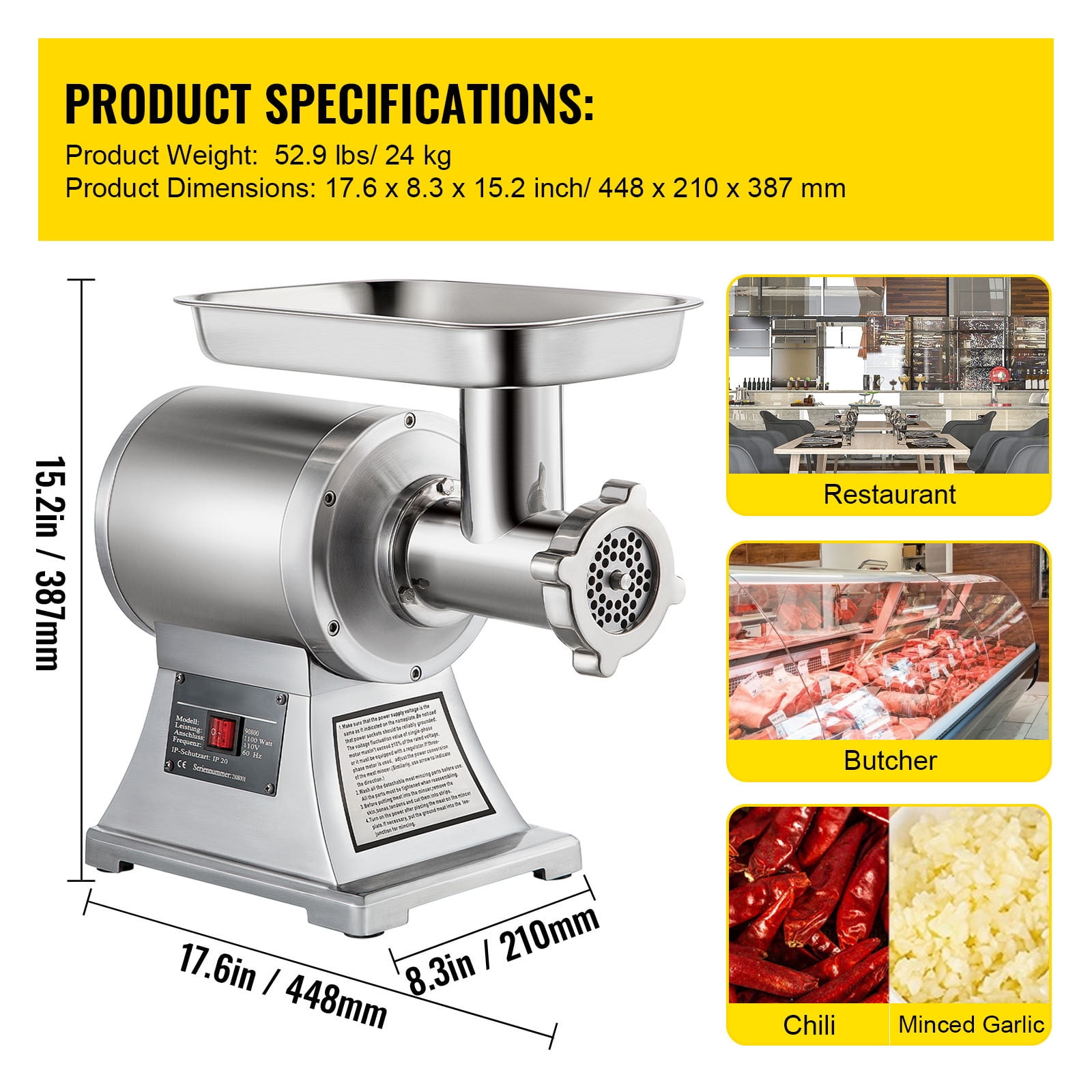 PREMIUM QUALITY- Made of food-grade stainless steel, wear-resistant, and rust-proof, including the outer casing, top tray, and blades. Our commercial meat grinder is easy cleaning and stands up for a longer working period. POWERFUL PERFORMANCE- Featuring 1100W power motor, the meat grinders can reach a speed of 193r/min and grind approximately up to 250 kg/550lbs of meat per hour, able to grind meat fast and conveniently. EASY TO USE- Simple to operate this electric meat grinder with just one button. The feeder tube is 54 mm/2.1inch in wide so that fine chopping of meat is not required before grinding. WELL-DESIGNED DETAILS- Equipped with a meat tray, provides an ideal place to keep meat pieces at hand, ready for grinding. A meat pusher is included for convenient stuffing of meat. Besides the 6 mm grinding plate mounted on the machine, we also offer you a grinding plate in 8 mm for coarse or fine grinding. WIDE APPLICATION- In addition to meat, the commercial grinder machine can also be used to grind fish, chili, vegetables, etc. Suitable for various situations including home kitchens, hotel restaurants, and company use. Commercial Meat Grinder-Our electric meat grinder is a fast, convenient way to make perfect ground meat. Constructed of the food-grade stainless steel material, healthy and durable to use. With the 1100W powerful motor, it can grind the meat up to 250 kg/550lbs per hour. The simple operation effectively saves time and energy. Two grinding plates(6 mm,8 mm) supplied for the coarse or fine grinding. Suitable for various situations including home kitchens, hotel restaurants, and company use. Specifications Material: Stainless Steel Motor Power: 1100 W Speed: 193 r/min Productivity: 250 kg/550 lbs per hour Product Size: 448 x 210 x 387 mm/17.6 x 8.3 x 15.2 inch Package Size: 520 x 295 x 452 mm/20.4 x 11.6 x 17.8 inch Gross Weight:24 kg/52.9 lbs Package Content 1 x Commercial Meat Grinder 1 x Meat Pusher 1 x Course Grinding Plate 1 x Fine Grinding Plate 2 x Blades