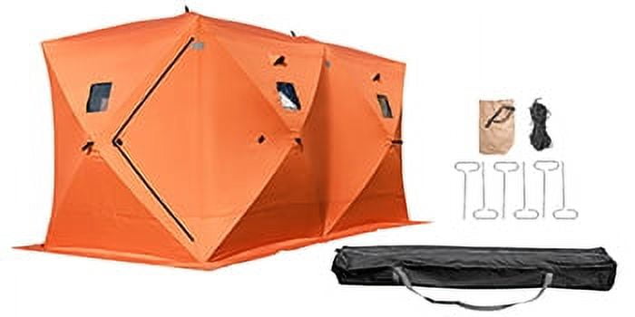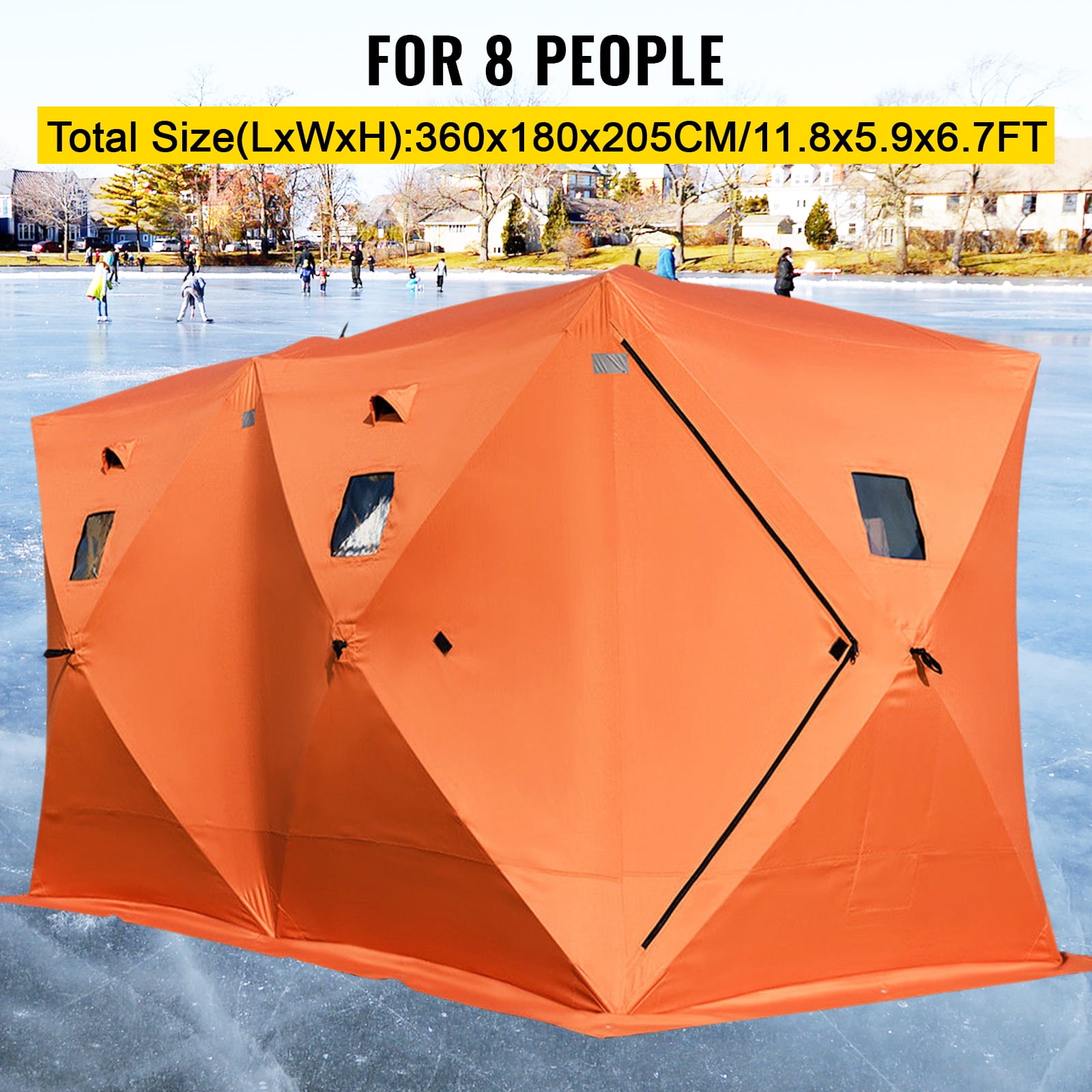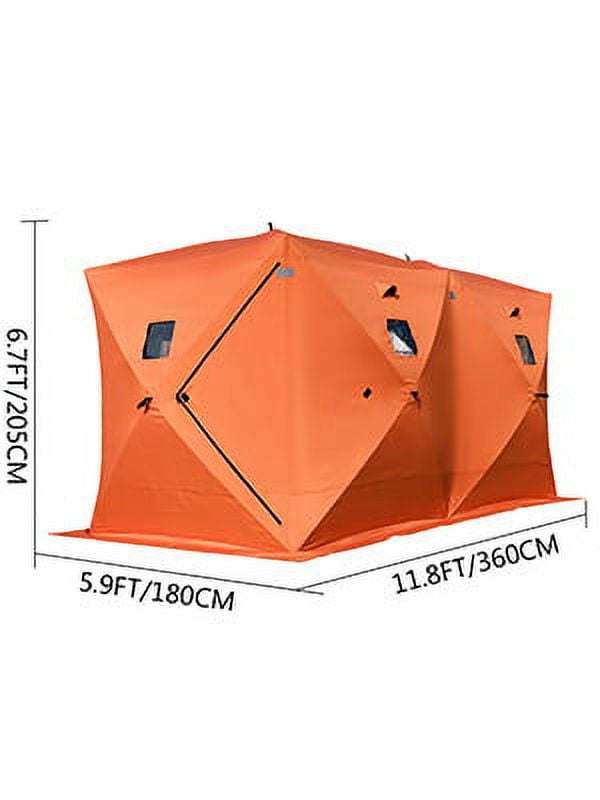 SKYSHALO 8 Person Ice Fishing Shelter, Pop Up PortableTent with Insulated Waterproof Oxford Fabric Quick Setup: This ice fishing tent features a hub design that allows for easy setup in just 60 seconds. Simply pull out each side and the roof hub for a hasslefree experience Durable Construction: Made from 300D Oxford fabric, this shelter is waterproof, windresistant, and designed to withstand cold temperatures, ensuring a comfortable fishing experience Convenient Carry Bag: The included carry bag makes transportation and storage easy. When folded, the tent fits perfectly in the bag, which measures 130 x 25 x 25 cm (4.2 x 0.8 x 0.8 ft) Spacious Design: This ice shelter can accommodate up to 8 people, providing ample space for fishing with friends. Unfolded dimensions are 360 x 180 x 205 cm (11.8 x 5.9 x 6.7 ft) Thoughtful Features: Equipped with two doors featuring double head zippers, two air vents for ventilation, and detachable windows for optimal visibility. Eight web handles facilitate easy setup and movement