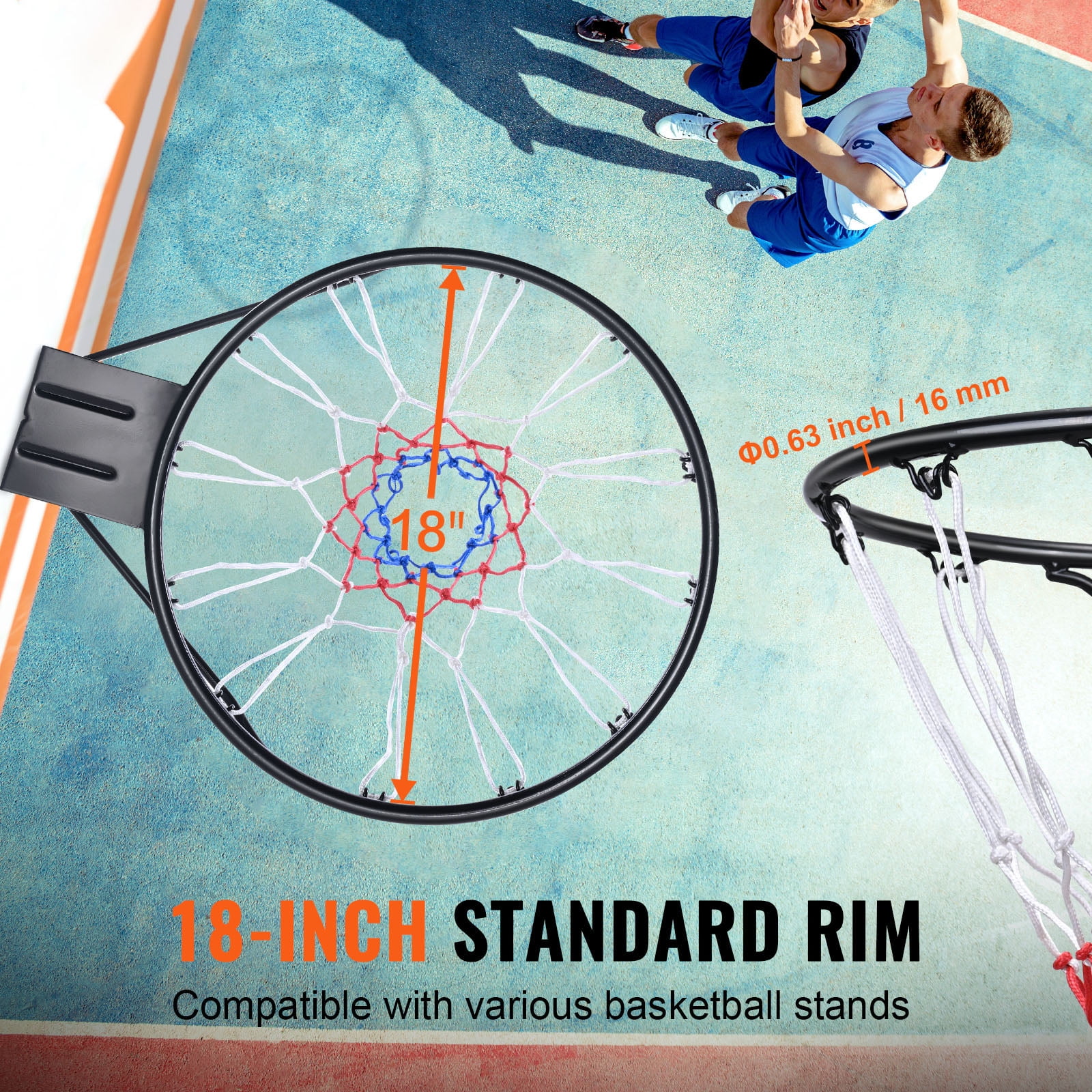 Universal size: This basketball rim is an 18-inch standard rim, making it an excellent replacement for any worn or damaged basketball hoop. This design typically conforms to standard basketball game rules and dimensions, suitable for various games and recreational activities, including both indoor and outdoor venues, meeting different usage needs. Sturdy structure: This basketball hoop features an integrated carbon steel structure, which is robust and durable. The net is made of >75g nylon, known for its high resilience and excellent elasticity. Even with long-term use, it remains resistant to deformation. Dual compression springs: This significantly reduces the impact sensation of the basketball hoop, and it can still return to its original position even after bearing heavy loads. Easy installation: This wall-mounted basketball hoop is easy to install and doesn’t require professional installers. You can follow these four simple steps: First, mark the positions of the four installation holes. Second, drill holes using nails or a drill. Third, screw in the expansion bolts into the holes. Fourth, install the basketball hoop. It takes just a few minutes to complete the assembly. Wide applicability: This heavy-duty breakaway basketball rim is highly suitable for beginners’ training and basketball enthusiasts’ games, whether in driveways, backyards, or even indoors. You can install it on any stable vertical surface where you want to play basketball, including walls, doors, or other suitable locations. Specifications Item model number: M-R1S Basket size: Solid, Outer diameter: Φ19.09 inch / 485 mm Tube diameter: Φ0.63 inch / 16 mm Basket material: Q235 Surface treatment: Oil spray Color: Black Mounting holes: Universal (adjustable on all four corners) Net: 75g tri-color nylon net Main material: Q235 Product weight: 8.60 lbs / 3.9 kg Product dimensions: 23.43×19.09×4.72 inch / 595x485x120 mm Package Content 1 x Basketball rim 2 x M8x80 expansion bolts 2 x Springs 2 x M8x150 bolts 4 x M8x45 bolts 1 x Net