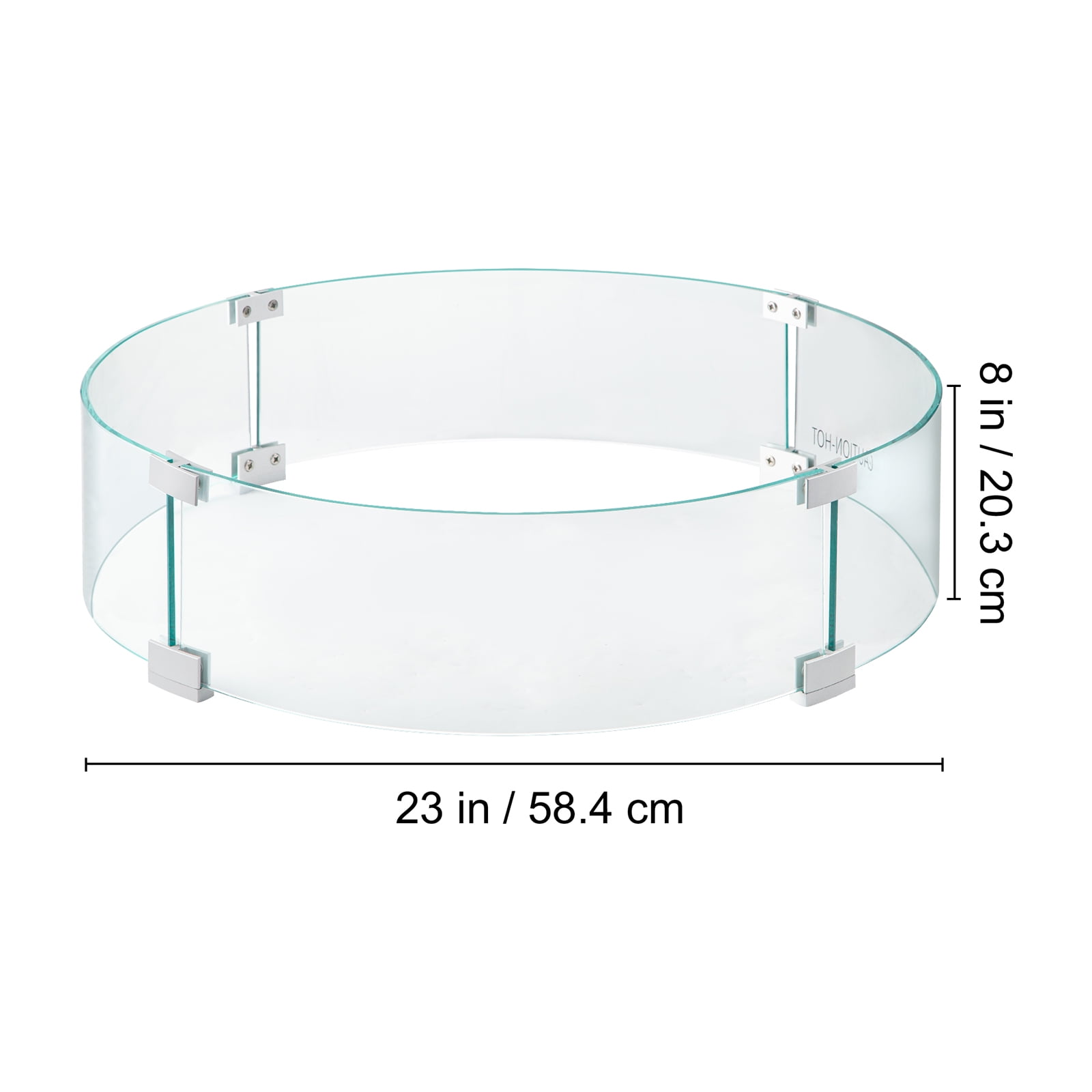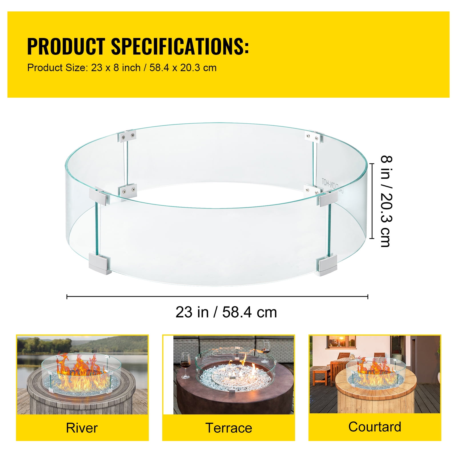 Product Description Fire Pit Wind Guard A fire pit flame guard effectively reduces wind contact with the fire in your pit or table and excellently fits in your patio or garden. It shelters the flame while providing a barrier for users along with polished edges.Easily set and use it with necessary accessories. Long-lasting durability is guaranteed with our tempered glass and aluminum alloy corner brackets. Gather everyone around the fire, and create an atmosphere that will be remembered for a lifetime. Enjoy watching flames dance as you laugh with your loved ones for years to come. Perfect For Outdoor Fire Pits Tempered transparent glass windproof fence is compatible with fire desks smaller than 23 x 8 inches. This type of fire pit screen is very suitable for various outdoor fire pits. Durable Tempered Glass It is made of 0.24-inch thick tempered glass and aluminum brackets, forming a rock solid windshield structure and providing a better visual experience. Enjoy A Steady Flame This type of glass windproof fence can block the breeze, maintain a lower flame height, and consume less fuel. It also provides reliable security for children, families, and guests. Stability Ensured The height of the anti slip feet is 0.4 inches, ensuring consistent and smooth airflow. The feet can also keep the windshield stable and prevent it from shaking. Complete Accessories This fire pit windproof cover includes 4 tempered glass pieces, 8 retainers, and some foot pads. You can quickly wipe it all clean with a cloth. Meanwhile, you can install a glass fire pit meter within a few minutes. Wide Usage This powerful flame protection device has a dancing flame and light bounce effect, complementing your outdoor fire pit and immediately decorating it with a more modern and exquisite appearance. Specifications Model: VV-FPWG-Y-23*8 Item Dimension: 23 x 8 inch/ 58.4 x 20.3 cm Boards Material: Tempered Glass Brackets Material: Aluminum Alloy Glass Thickness: 0.24 inch/ 0.6 cm Color: Clear Item Weight: 15.4 lbs/ 6.98 kg Package Content 4 x Glass Boards 8 x Brackets 1 x Pack of Accessories