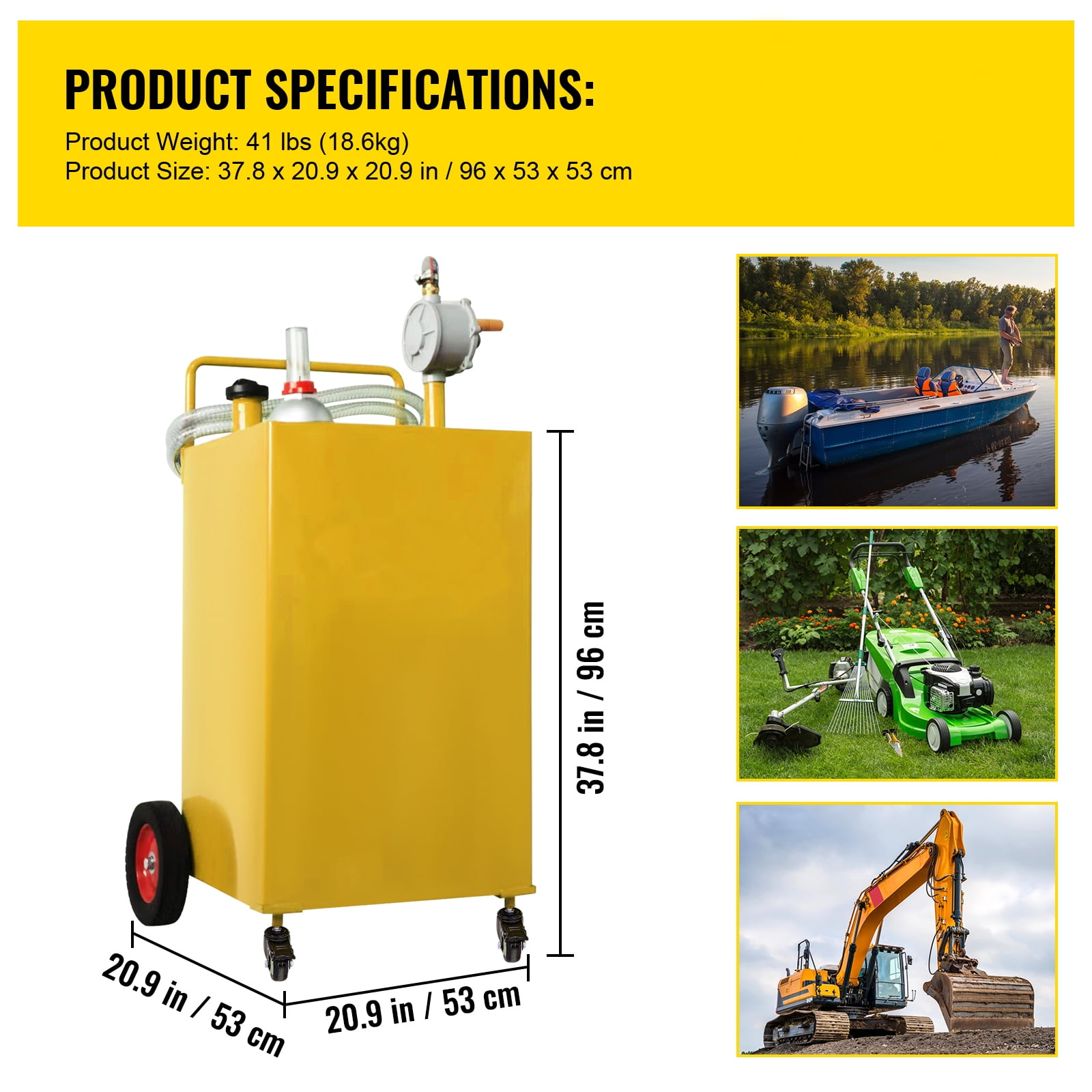 Product Description 30 Gallon Fuel Caddy This large-capacity 30-gallon fuel tank is easy to handle, allowing for efficient and easy refueling in a variety of applications while reducing fuel spills and waste. It is an ideal device for automotive repair, farm, garden, small engine, motorcycle/ATV, marine use and more. This fast, clean tank is easy to carry. No matter the situation, our caddies will always be by your side. Large 30 Gallon Fuel Tank No matter what fuel youre looking for, our portable fuel tanks have you covered. This versatile tank is approved to safely store and dispense up to 30 gallons of gasoline, diesel and kerosene fuel. Rotary Manuel Pump ????????????????????????????????????????????????????? Designed just for you The gas tank has quality construction. It includes large 8-inch wheels and small 2-inch wheels, anti-static ground clamp, oil filler neck with gas cap, convenient tube holder and simple lever push handle. All these designs will support efficient and safe work. High-Strength Steel Tank The 30-gallon diesel tank is made of high-quality 201 stainless steel material, which is extremely resistant to mechanical damage and corrosion. This high-quality material will ensure long-term use. Secure & Efficient to Fill 9.8 FT automotive grade rubber hose facilitates efficient and safe refueling. Heavy-duty nozzles support fast fuel delivery. Just open the clamp and let it flow. You can quickly fill up the water tank in just a few minutes. Wide Application Use Portable fuel tanks are designed to transport diesel or gasoline to your job site. It is ideal for tank trucks, marine, outdoor industry, construction industry and more. Specifications Model: 30 Gallon Fuel Caddy Tank Size: 37.8 x 20.9 x 20.9 in/ 96 x 53 x 53 cm Fuel Type: Gasoline, Diesel, Kerosene Pump Type: Two Way Rotary Pump Hose Length: 9.8 ft/ 3 m Material: 201 Stainless Steel Big Tire Diameter: 8 in/ 20.3 cm Small Tire Diameter: 2 in/ 5.1 cm Product Color: Yellow Package Content 1 x Fuel Caddy