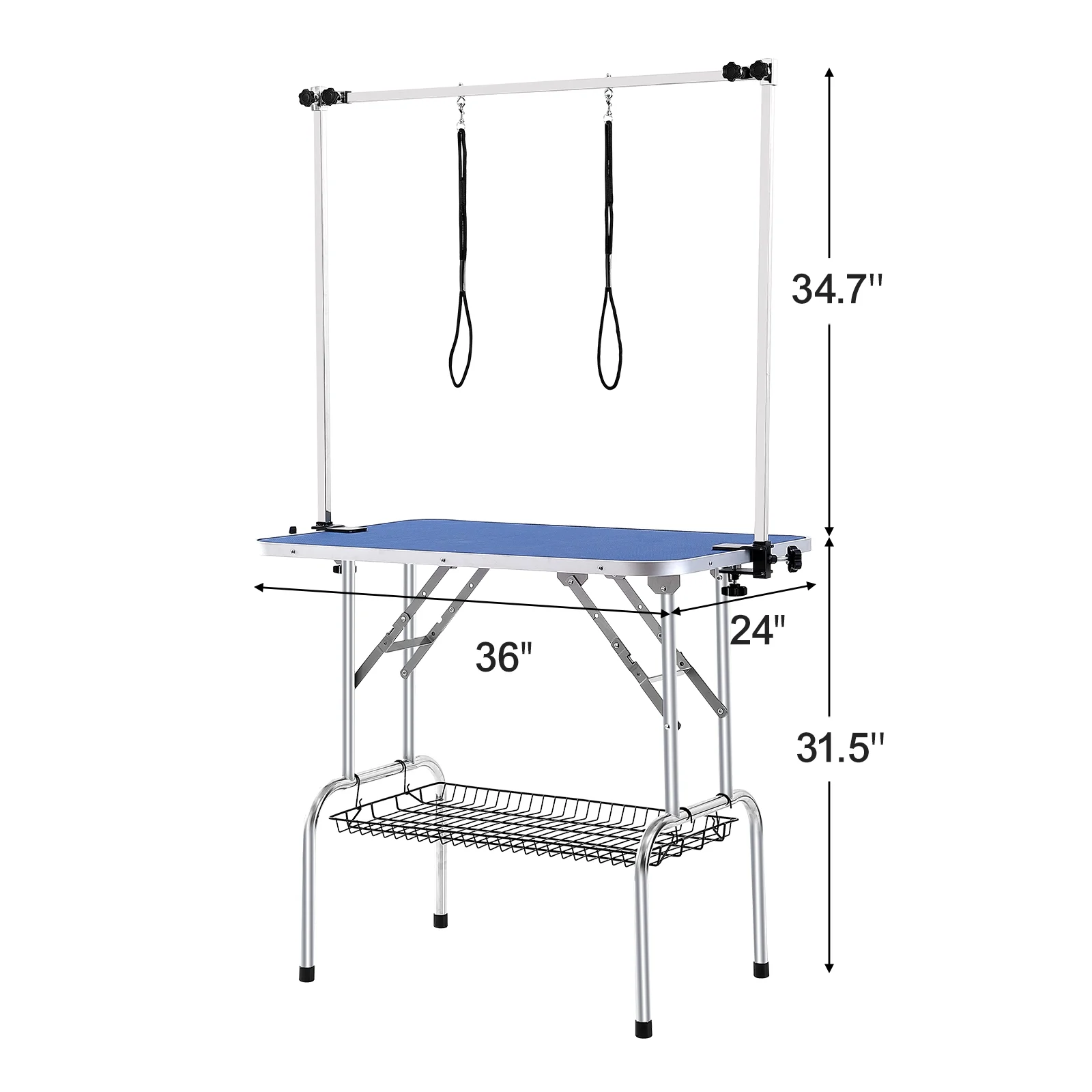 Product Description SKYSHALO Pet Grooming Table – Versatile Solution for Pet Grooming Requirements Constructed with utmost precision using premium stainless steel, guaranteeing unparalleled durability and resilience. The surface of the table is skillfully coated with a waterproof, non-slip, and heat-resistant layer, ensuring a secure and steady foundation for pet grooming and nurturing. Ideal for medium-sized pets, this table caters to the needs of both domestic and professional pet grooming establishments. Sturdy Pet Grooming Table Crafted entirely from stainless steel, this pet grooming table offers exceptional stability and a robust weight-bearing capacity. The table’s strength is further enhanced by the aluminum alloy edging, while the reinforced metal tray remains securely attached and free from deformation. Adjustable Grooming Arm with Clamp Featuring a clamp-adjustable grooming arm design, this pet grooming table allows for easy height adjustment, eliminating the need for bending. The H-shaped arm adds extra stability to the table, ensuring a comfortable grooming experience for your pet. Innovative Design Features Our pet grooming table incorporates several innovative design features to enhance usability. The foldable anti-bend support frame provides exceptional sturdiness, while the dual dog leash design ensures secure pet restraint. The non-slip, heat-resistant rubber foot pads prevent sliding, offering convenience and safety for your pet. Quick and Easy Installation Installing this pet grooming table is a breeze, requiring no professional expertise or tools. Even non-professional pet groomers or beginners can effortlessly complete the installation independently. Versatile and Reliable With its waterproof, non-slip, and heat-resistant coating, this table provides a stable platform for a wide range of pet grooming activities, including bathing, trimming, drying, brushing, and other essential pet care tasks. It is particularly suitable for medium-sized pets. Convenient Storage Solution Equipped with a mesh storage tray and four hooks, this pet grooming table offers a convenient storage solution for leashes, dog toys, brushes, clippers, and other grooming supplies and accessories. The tray can be easily removed when not in use, and each side has two hooks for secure attachment. Specifications Model: GT-205H Desktop Size: 36″ x 24″ / 914.4 x 609.6 mm Desktop Height: 31.5″ / 800.1 mm Static Load: 330lbs / 149.7kg Arm Height: 34.7″ / 881.4 mm Desktop Color: Blue Main Material: 201 Stainless Steel Product Weight: 33.73lbs / 15.3kg Product Size: 41.73″x24.25″x66.97″ / 1060x616x1701 mm Package Content 1 x Pet Grooming Table 2 x Binding Ropes 2 x Iron Jigs 6 x Clubs Handles 1 x Iron Net