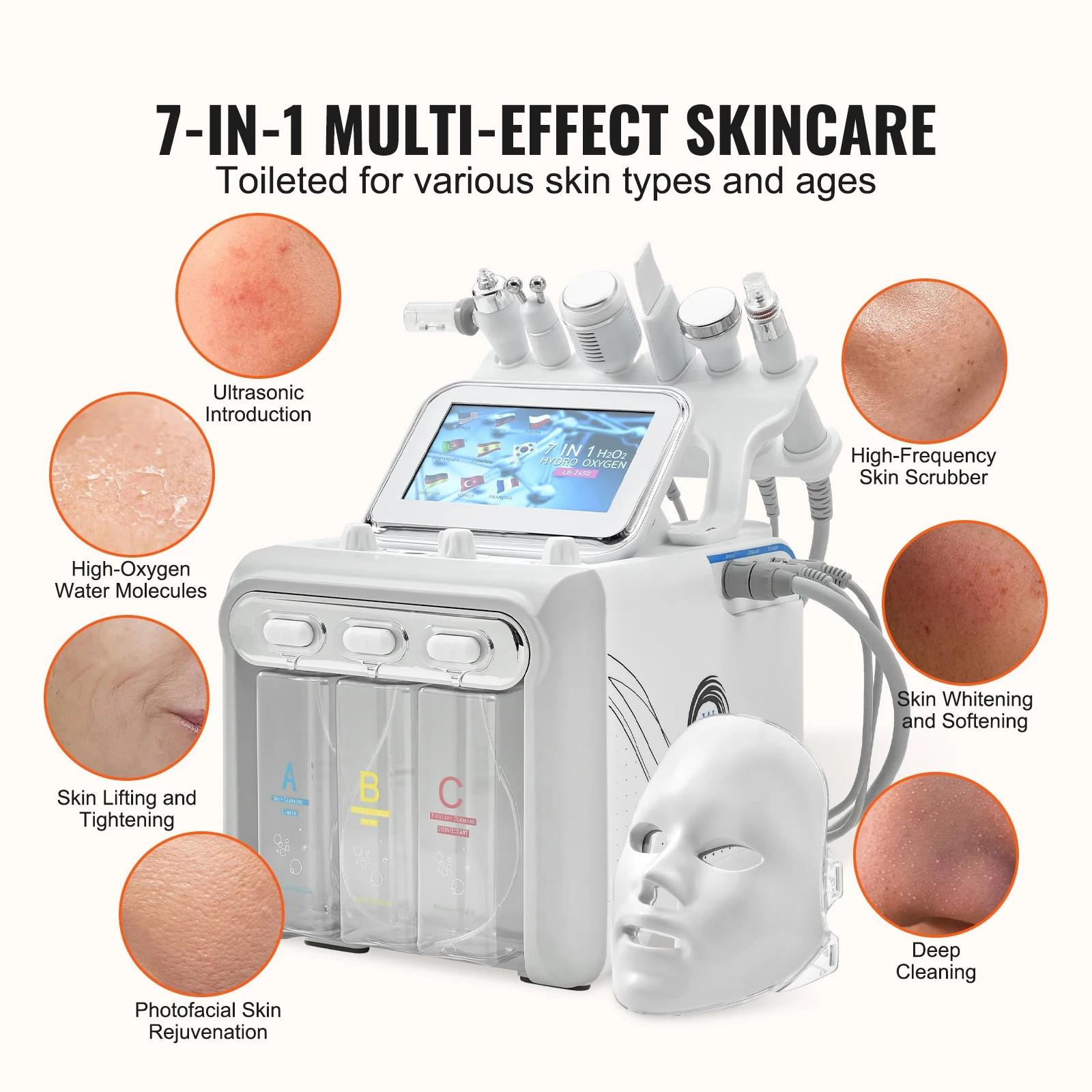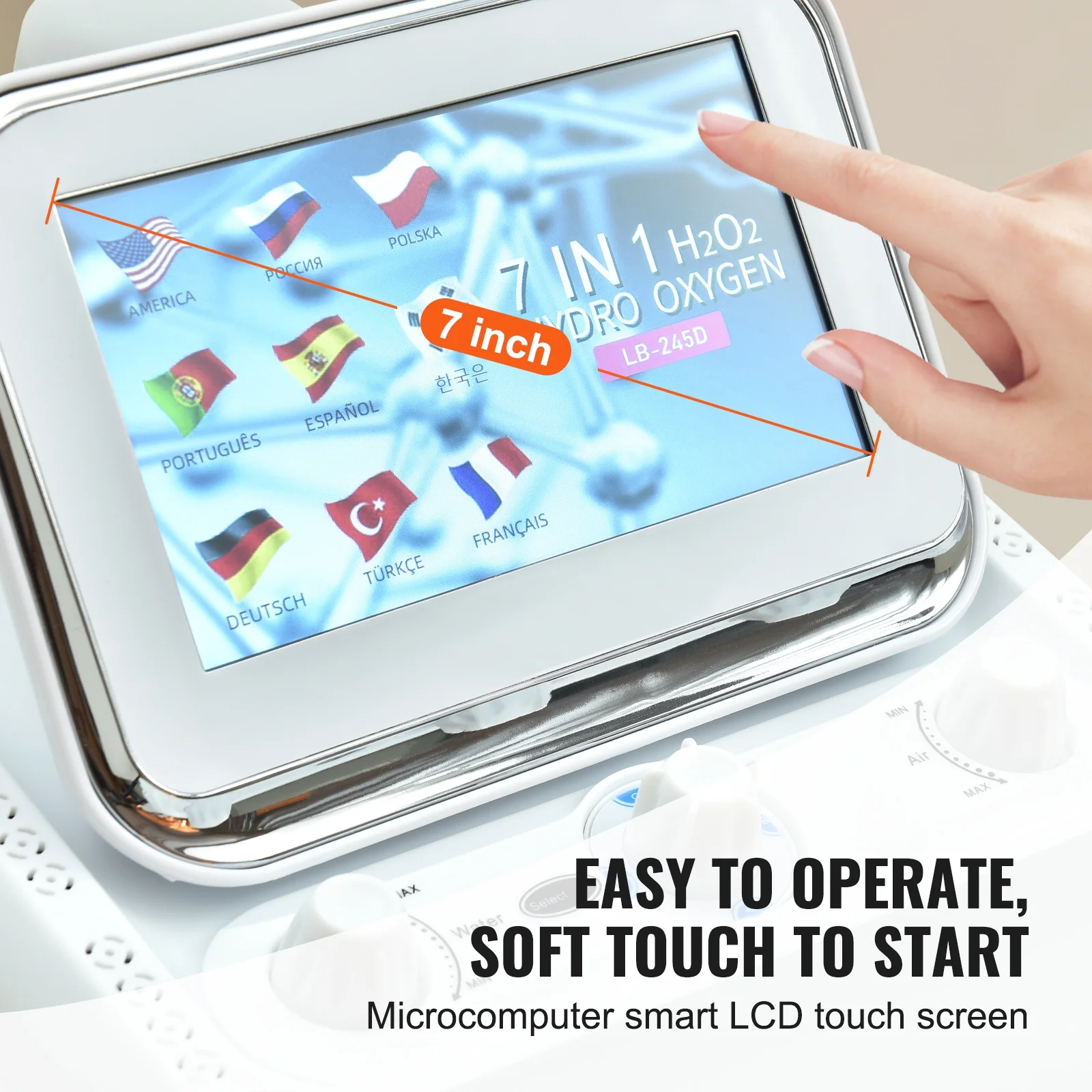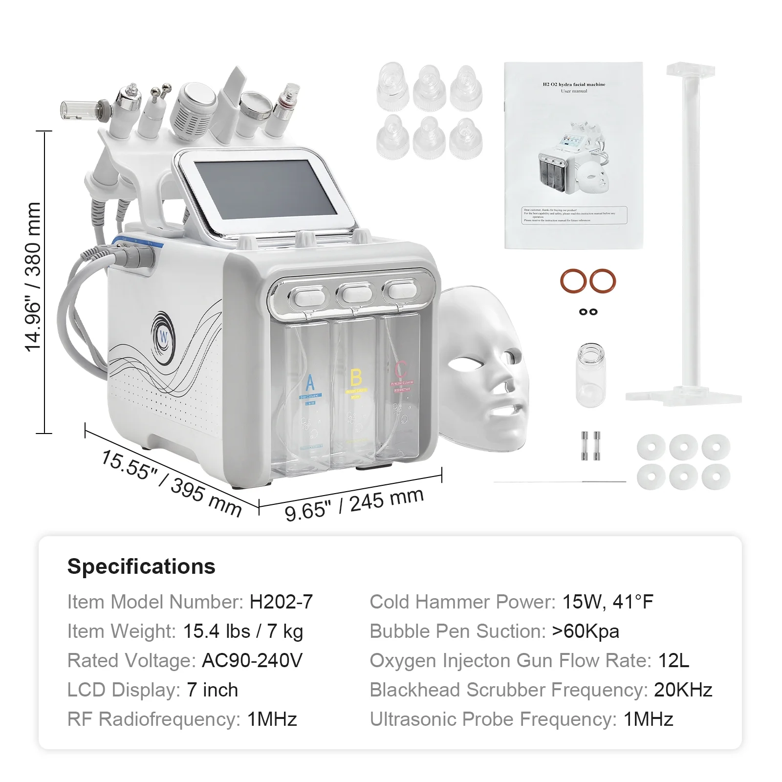 Product Description SKYSHALO 7 in 1 Hydrogen Oxygen Facial Machine Rediscover your beauty with SKYSHALO’s 7-in-1 Hydrogen Oxygen Facial for estheticians. It covers everything from deep cleansing and hydration to skin firming. Use the high suction Hydrogen Oxygen Cleansing Pen and Ice Hammer to revitalize your skin and leave you glowing. Deep Cleansing Achieve clear skin and promote skin renewal through deep cleansing and hydration for a brighter, smoother complexion. Anti-Aging Marvel Experience firmer, younger looking skin through the combined benefits of cryogenic ice hammer and radiofrequency radiofrequency, targeting under-eye bags, crow’s feet, and more. Continuous Nourishment Enhance your skincare routine by adding beauty serums to the ABC Function Bottle. Use them with the Hydroxy Cleansing Pen to remove impurities and improve skin texture. Effortless Operation Easily adjust suction and flow rates with intuitive touchscreen and knob controls that save you time and effort. Suitable for All Skin Type This all-in-one solution caters to a wide range of skin types and ages, offering a comprehensive range of cosmetic treatments. Hassle-Free Setup Follow our detailed installation guide for a quick and hassle-free installation to ensure a safe and enjoyable grooming experience. Specifications Item Model Number: H202-7 Rated Voltage: AC90-240V LCD Display: 7 inch RF Radiofrequency: 1MHz Cold Hammer Power: 15W, 41°F Bubble Pen Suction: >60Kpa Oxygen Injection Gun Flow Rate: 12L Blackhead Scrubber Frequency: 20KHz Ultrasonic Probe Frequency: 1MHz Beauty Mask: 7-Color Light Waves Item Weight: 15.4 lbs / 7 kg Package Content 1 x Hydrogen Oxygen Facial Machine 1 x 7-Color Face Mask Bracket 1 x Spray Gun Ampoule 1 x Unclogging Needle 2 x Fuses 6 x Hydrogen Oxygen Cleaning Pen Heads 6 x Filter Cottons 2 x Large Sealing Rings for Cleaning Pen 2 x Small Sealing Rings for Cleaning Pen 1 x User Manual
