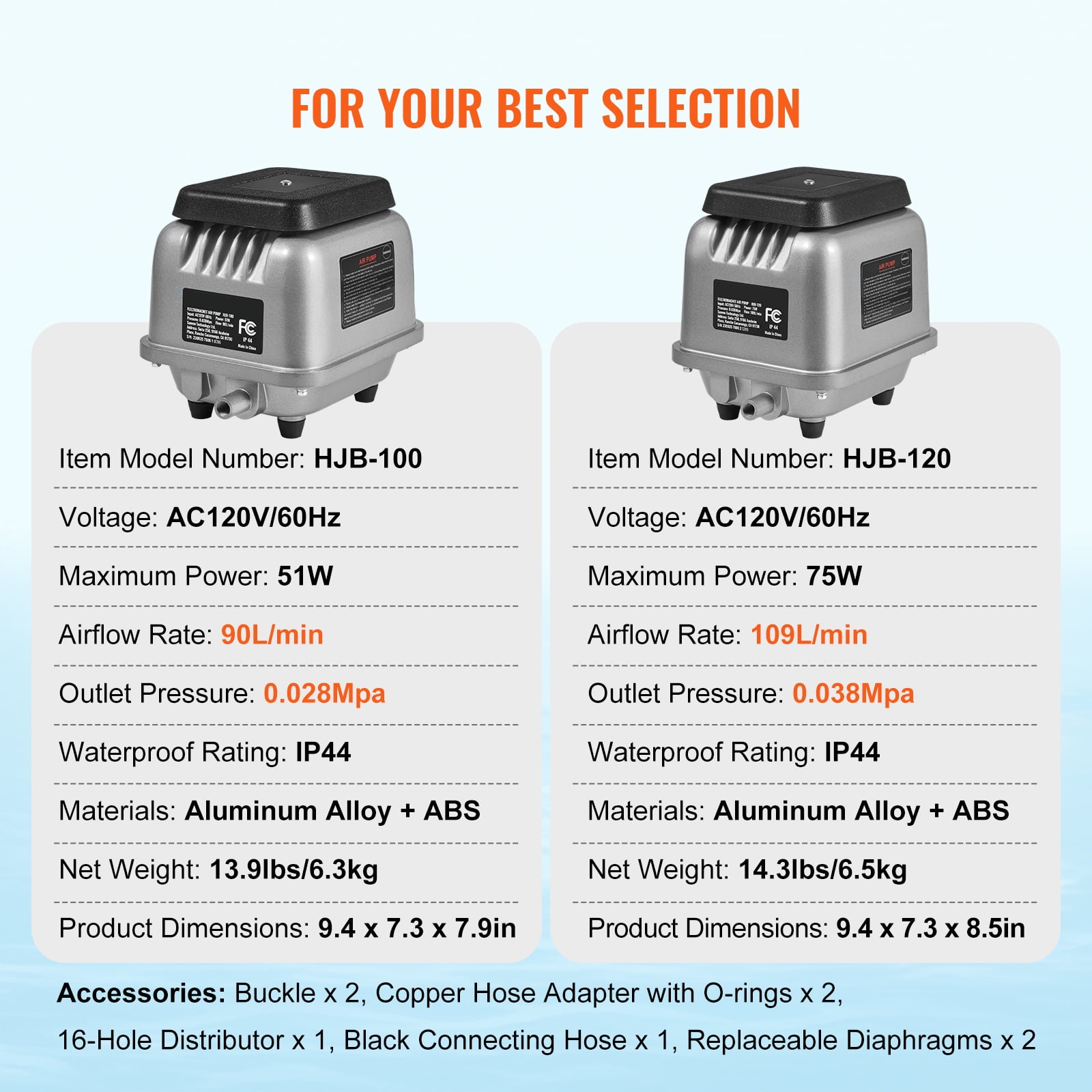 Product Description Efficient Air Pump Our septic tank air pump provides a generous airflow of 90 L/Min. It boasts a sturdy construction and is designed to be IP44 waterproof. Unleash Unmatched Performance Experience the pinnacle of performance with our cutting-edge SKYSHALO linear aeration pump. Boasting an astonishing airflow of 90 L/Min, this powerhouse is designed to deliver unrivaled results. Crafted with an aluminum alloy chassis, it guarantees exceptional wear resistance. Its innovative internal heat dissipation design and IP44 waterproof rating ensure seamless operation in any weather condition. Unyielding Flow for Maximum Efficiency Introducing our SKYSHALO septic tank aerator, engineered with a robust high-flow design. With a staggering power output of 51W, it generates a formidable airflow of 90 L/Min and an outlet pressure of 0.028Mpa. Effortless Installation, Seamless Operation Revolutionize your aeration system with our SKYSHALO air pump. Equipped with a convenient air diffuser featuring 16 outlets, installation becomes a breeze. Designed for easy connection to other hoses (airline tubing and air stones available separately), our pump simplifies your setup process. Ingenious Design for a Smarter Experience Discover the brilliance of our compact aeration pump, meticulously crafted for your convenience. Its lightweight and portable design allows for effortless transportation. Equipped with an internal air filter, it effectively eliminates gas impurities, reducing the risk of clogs. Unleash the Power of Versatility Unleash the power of our SKYSHALO linear air pump across various applications. Whether it’s water gardens, farm ponds, septic tanks, or sewage tanks, our versatile device provides essential ventilation. It guarantees crystal-clear pond water, maintains optimal oxygen levels, and fosters thriving fish populations. Embrace the versatility of our extraordinary air pump and witness the transformation in your aquatic ecosystem. Sleek and Portable Introducing our sleek and portable septic tank air pump, designed to elevate your outdoor space. Its novel and compact design adds a touch of modernity while ensuring reliable aeration. Specifications Item Model Number: HJB-100 Voltage: AC120V/60Hz Maximum Power: 51W Airflow Rate: 90 L/min Outlet Pressure: 0.028 Mpa Waterproof Rating: IP44 Materials: Aluminum Alloy + ABS Product Dimensions: 9.4 x 7.3 x 7.9 inches/238 x186 x 200 mm Net Weight: 13.9 lbs /6.3 kg Package Content 1 x Linear Air Pump 2 x Buckle 2 x Copper Hose Adapter with O-ring 1 x 16-Hole Distributor 1 x Black Connecting Hose 2 x Replaceable Diaphragms