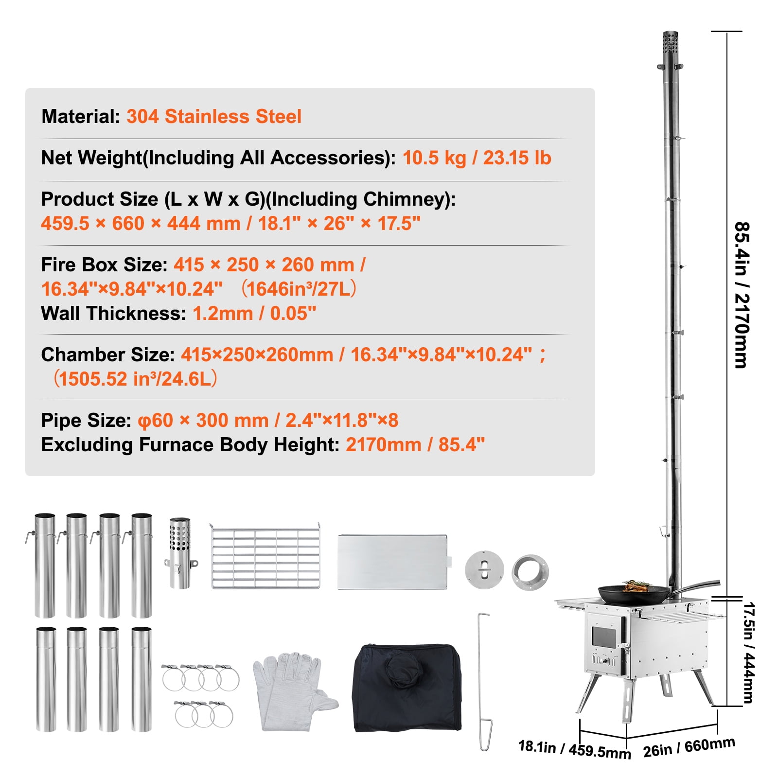 Product Description SKYSHALO Portable Camping Wood Stove Your ultimate outdoor heating companion, equipped with a 3000in³ large-capacity firebox for efficient heating. The damper and ventilation hole design ensures simple smoke and fire control, allowing you to fully enjoy the camping experience without the hassle of smoke. Portable and Multi-functional The ample 205 x 290 mm / 8″ x 11.4″ shelves serve multiple purposes. With the efficient heat conduction plate, you can dry clothes, cook meals, and boil water, saving valuable outdoor space. Professional Outdoor Accessories 9 included accessories meet all your outdoor needs. The lightweight stove makes it convenient for storage and transportation. Sturdy and Rust-Resistant The 3 mm / 0.12″ thick panels provide durability and prevent deformation. Made from corrosion-resistant alloy steel, this mini wood stove can withstand the challenges. Secure Heating Designed for various outdoor heating scenarios, the hot tent stove provides odorless heating without sparks flying around. Equipped with a fire grate to prevent overheating. Wide Range of Applications The wood stove heater is not only suitable for outdoor camping and cooking but also perfect for outdoor barbecues and winter fireplace warmth. Efficient Heat Conduction Plate With the high-performance heat conduction plate, food and water can be quickly heated and boiled, eliminating long waiting times. Specifications Item Model Number: WMCPS03 Material: Alloy Steel Net weight (Including All Accessories): 24.5 kg /54 lbs Product Size (Including Chimney): 590 x 790 x 2620 mm /23.23″ x 31.1″ x 103.15″ Chamber Size: 550 x 330 x 295 mm /21.7″ x 13″ x 11.6″, 49.2L Smoke Pipe Size: NO 1: φ 127, NO 2: φ 125, NO 3: φ 120, NO 4: φ 115 Exhaust Pipe Size: φ 127 mm; Wall Thickness: 0.6 mm Excluding Furnace Height: 1910 mm /75.20″ Firebox Size: 550 x 330 x 295 mm,1646in³ Wall Thickness: 1.5-3 mm Package Content 16 x M6 x 15 Hexagonal Socket Bolts 3 x M5 x 10 Half Round Bolts 3 x M5 Nuts 4 x Support Legs 1 x Chimney Base 1 x Flue Regulator 4 x Chimneys 1 x Chimney Lid 2 x Edge Networks 1 x Shovel 1 x Scraper 1 x Gloves 1 x Instruction