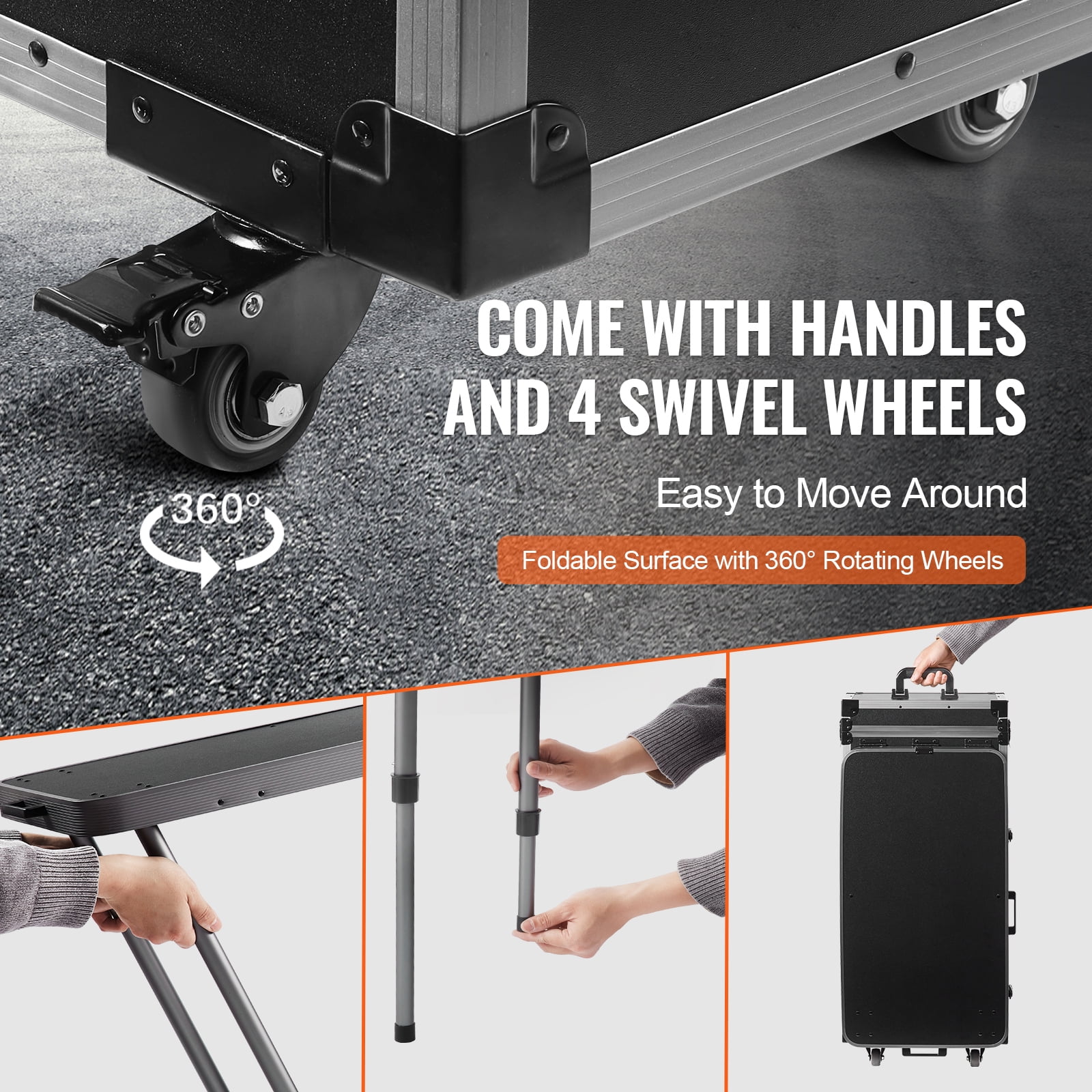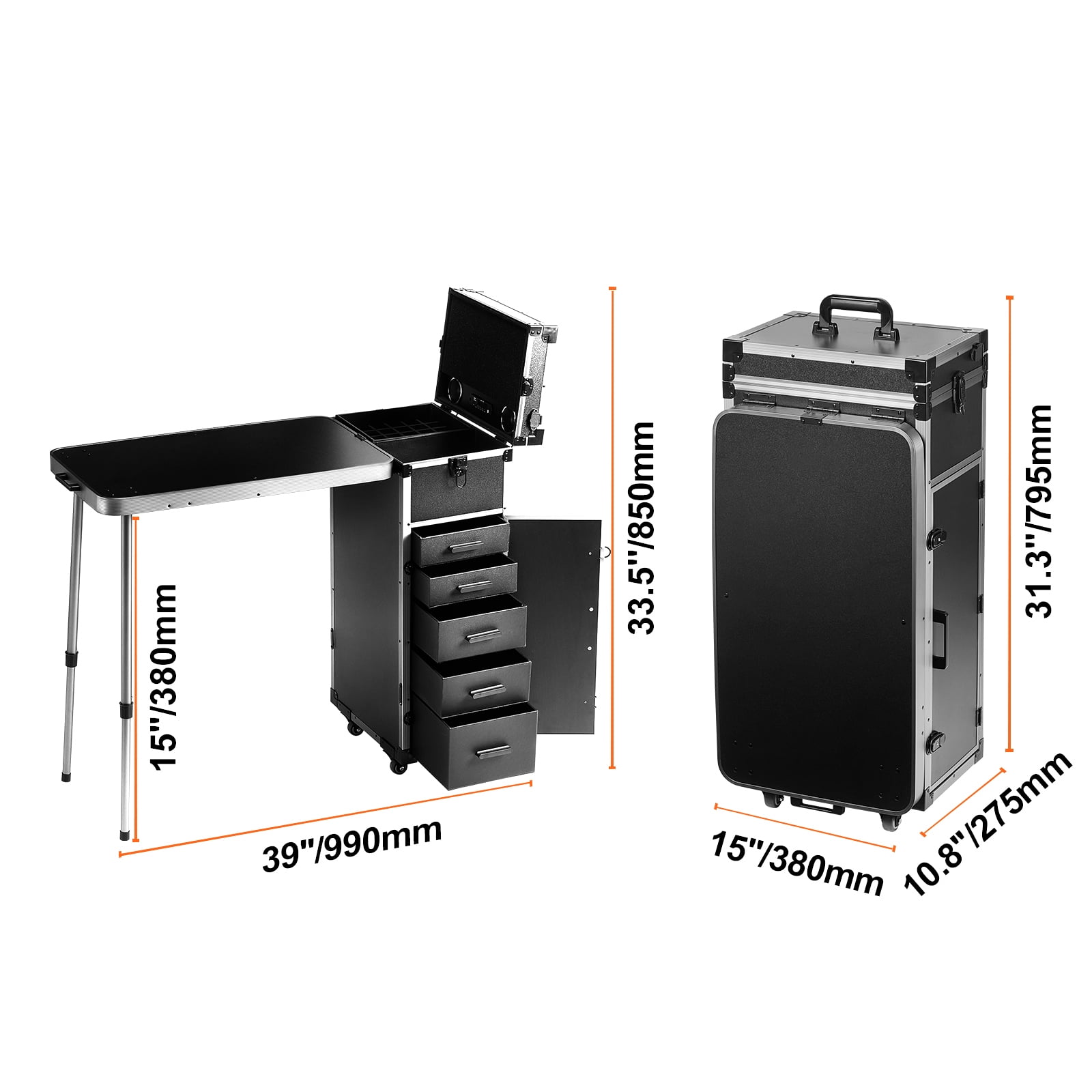 Storage Expert: Makeup case with unfolded dimensions of 39x15x33.5”/990x380x850 mm. The train case features a top compartment with dividers, making it convenient for storing nail polish and various cosmetics. The bottom part has 5 removable drawers for storing larger items like nail dryers, foundation, and makeup bottles. It offers a super-large capacity storage space, ensuring neat and organized storage. Sturdy and Durable: The main body of the makeup case is constructed from ABS+MDF board, which is highly durable and wear-resistant. The frame and corner connections are made of metal aluminum material, ensuring sturdiness and longevity. The workbench top with support legs can withstand weights of up to 66 pounds/30 kilograms, providing stable support and preventing it from easily shaking or tipping over. Easy to Move and Use: Our makeup case has a net weight of 32.9 pounds/14.94 kilograms and comes with large 360? rotating wheels for easy mobility. You can effortlessly place it in the trunk of your car, making it your mobile makeup workstation. Humanized design: Makeup case built-in full-screen mirror, space saving, clearly visible. It also has Bluetooth speakers for playing music and relaxing, a USB port for easy phone charging, and a latch design for protecting your belongings. Its user-friendly design ensures a comfortable and convenient user experience. Wide Range of Uses: This makeup box organizer can be used as a nail salon workstation, makeup studio, for wedding or event makeup, by hairstylists, makeup students, and fashion enthusiasts for makeup storage. It is also suitable for nail technicians, tattoo artists, and hairstylists for travel and work purposes.