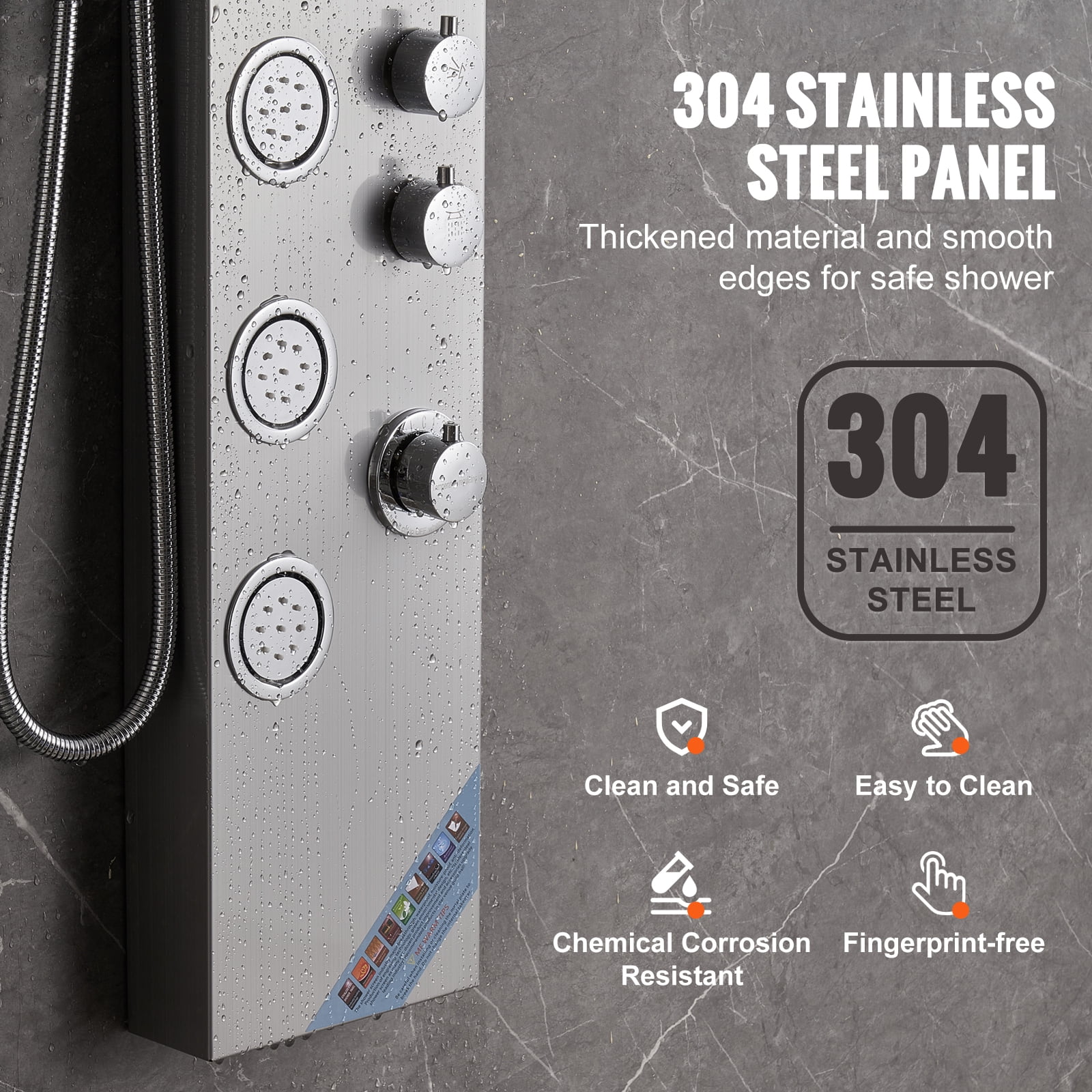 4-in-1 Shower System: Experience four invigorating shower modes—rainfall, waterfall, body massage jets, and a handheld shower head—all designed to enhance your spa-like shower experience. Effortlessly switch between modes and temperatures with a convenient knob control, delivering a delicate and abundant flow without harsh impacts. Please note: To ensure optimal performance, it is recommended to avoid using multiple modes simultaneously. SPA-Class Dual Top Spray Mode: Choose between rainfall or waterfall modes easily. Our 18.1”/460 mm top spray head extends your shower range, ensuring every inch of you is covered in comfort. Rainfall mode envelops your body in fine water droplets, while waterfall mode offers a refreshing rinse. Anti-Clog Nozzles: Our shower tower system boasts 5 angle-adjustable body massage jets and a 3-setting shower head, catering to users of all heights, including children. With silicone nozzles, you can effortlessly remove blockages using your fingers, ensuring effortless cleaning and eliminating any concern over scale blockage. 304 Stainless Steel Material: Crafted from high-quality 304 stainless steel for safety and durability. The shower panel tower is thick and resistant to fingerprints, rust, and corrosion. Ensuring easy cleaning for lasting beauty and hygiene. Wall-Mounted Shower Head System with Easy Installation:Equipped with a G 1/2″ interface, this wall-mounted shower head system ensures a consistent high flow rate and stable water pressure. The system includes a brass mixing valve, a PVC double explosion-proof pipe, and a robust 304 stainless steel braided nozzle for leak-proof performance. Detailed instructions are included for quick and easy assembly.