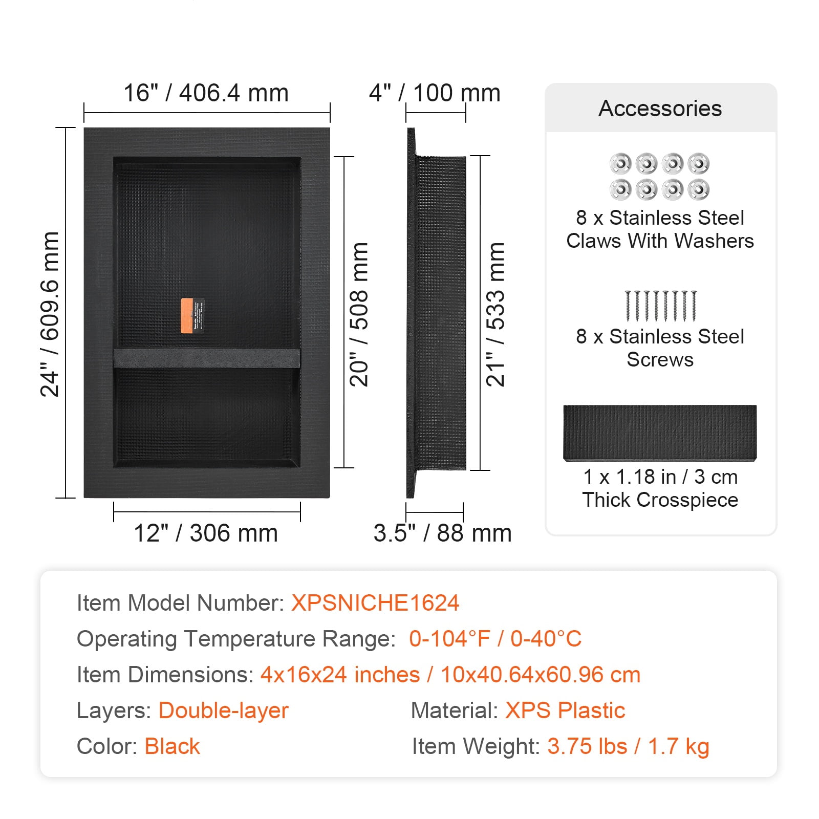 Product Description SKYSHALO Shower Niches – Organize Your Home with Ease Revolutionize your bathroom with SKYSHALO shower niches. Our innovative surface reinforcement process ensures exceptional load bearing capacity, making it perfect for any tile adhesive. Say goodbye to complicated tile laying and embrace simplicity. With our complimentary mounting kit, you can easily install it horizontally or vertically for a recessed look. Durable and Waterproof Shower Niche Introducing the SKYSHALO Waterproof Niche, a revolutionary shower niche that guarantees a leak-free shower experience. With its triple waterproof substrate, this niche ensures that water stays where it belongs – inside the shower. Say goodbye to moldy floors and hello to a dry and clean indoor environment. Long-lasting Integrated Structure Experience the durability of the SKYSHALO Shower Niche. Designed with an integrated structure, this niche is built to last. It is resistant to decomposition and rot, ensuring a longer service life for your shower niche. Invest in quality and enjoy the benefits for years to come. Enhanced Tile Adhesion Our SKYSHALO Shower Niche features a meshed rough surface that enhances tile adhesion during installation. This ensures that your tiles adhere tightly to the surface, reducing the risk of them falling off or becoming loose. Enjoy peace of mind knowing that your shower niche is secure and reliable. Flexible Installation Options Choose the installation style that suits your shower room layout and personal preferences with the SKYSHALO Shower Niche. This versatile niche can be installed horizontally or vertically, allowing you to customize your space according to your needs. Maximize your bathroom space by placing it inside the walls. Versatile and Practical The SKYSHALO Shower Niche is not limited to just the bathroom. It can be used in various settings such as the bedroom, study room, and more. Experience the convenience and functionality of this multi-purpose niche, adding style and organization to any space. Easy Installation with Mounting Accessories We provide a complete installation kit with the SKYSHALO Shower Niche. This kit is suitable for any backboard material, including xps, wood, and cement. Say goodbye to complicated installation processes and enjoy a hassle-free setup. Specifications Item Model Number: XPSNICHE1624 Operating Temperature Range: 0-104°F / 0-40°C Item Dimensions: 4x16x24 inches / 10×40.64×60.96 cm Layers: Double-layer Material: XPS Plastic Color: Black Item Weight: 3.75 lbs / 1.7 kg Package Content 1 x Shower Niche 8 x Stainless Steel Claws With Washers 8 x Stainless Steel Screws 1 x 1.18 in / 3 cm Thick Crosspiece