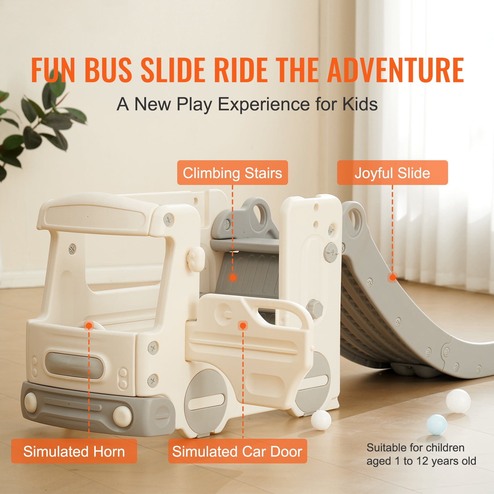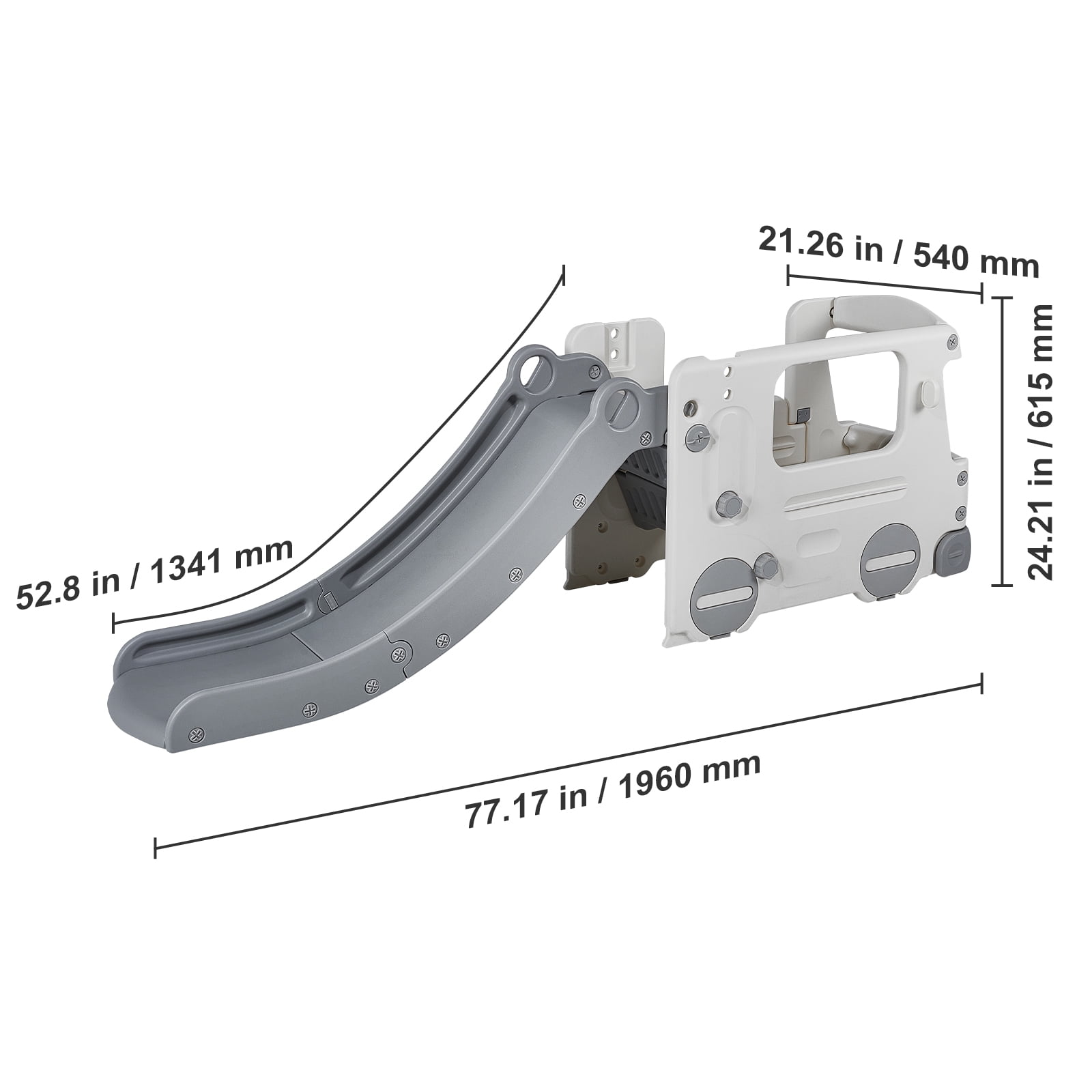 Product Description Indoor Toddler Children’s Fun Space Do not need to go out to pay for the amusement facilities. Let children feel at ease to play at home! Thoughtfully equipped with a buffer zone, the maximum bearing capacity of 110 lbs. Create a secure place for your children. Anti-rollover Structure The well-designed triangular structure of the slide ensures that the slide will not easily tilt or flip over when in use so that you can rest assured that the children can enjoy the play. Never Get Tired Of Playing The combined play slide can cultivate children’s physical strength and brain power, simulate the horn and the hatch like a realistic car, exercise children’s imagination, and allow them to enjoy themselves. Children’s Happy Corner You can create a mini play circle for the home, suitable for children’s bedrooms and family living rooms. Just need a small space to create laughter and memories with your child. Hassle-free Installation We have prepared the installation kit for you, no additional purchase, screws, instructions, basketball rack, and basketball. The simple installation allows you to have more fun. HDPE Safety Material Strictly selected HDPE material, the slide is not easy to break deformation, 360° all-round grinding without burrs to protect the baby’s tender skin. With Non-Slip Pads Equipped with 2 anti-slip pads, self-adhesive to the bottom of the slide, no matter what, the floor material can increase friction and safeguard the slide from shifting to cause accidents. Specifications Item Model Number: FE-HT-DBS01 Item Dimensions: 77.17 x 21.26 x 24.21 in / 1960 x 540 x 615 mm Net Weight: 20.77 lbs / 9.42 kg Material: HDPE Color: White Maximum Weight Capacity: ≤110 lbs / 49.9 kg Slide Length: 4.4 ft / 134.1 cm Recommended Age Range: 1-12 years old Package Content Screw Kit x 1 Rearview Mirrors x 2 Front Lights x 2 Anti-slip Covers x 5 Anti-slip Pads x 3 User Manual x 1