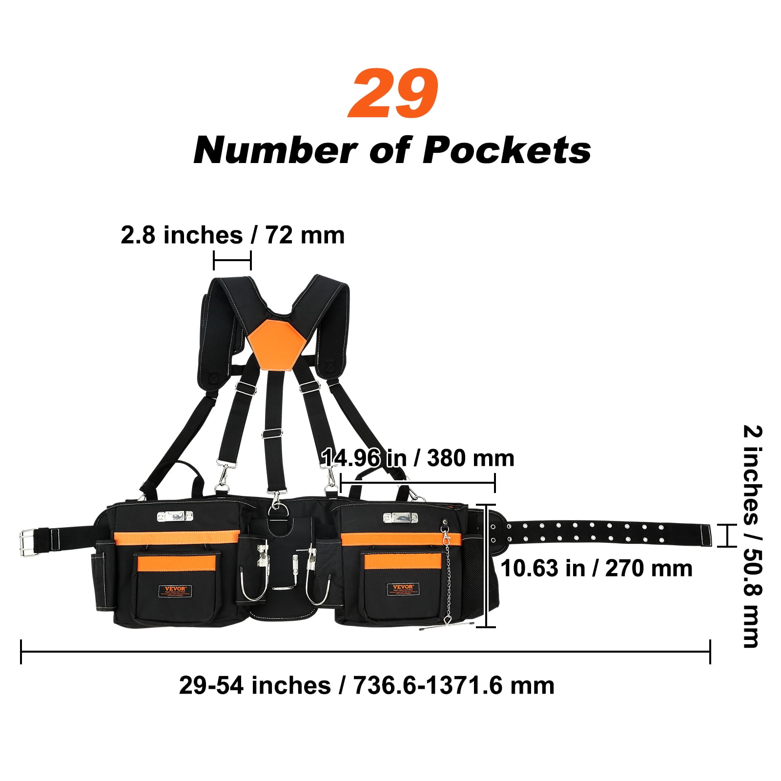 Product Description SKYSHALO Multifunctional Tool Belt with Suspenders Give your tools a home and make every task breezy! Our double-stitched connection between the pouch and tool sections means it’s built to last. And with reinforced bar-tack spots and 600D polyester fabric, this tool belt’s lifespan is no joke. Ergonomically Spot-On This tool belt with suspenders is all about comfort, tailored to your waist size, hugging your curves, and taking off the stress. Designed with you in mind, we’ve gone all out to ensure all-day comfort. Personalize Your Fit Whether you’re tall, short, slender, or broad, our adjustable waist design caters to all. The buckle is secured in place, and the D-rings help distribute the load. You’re unique, and so is the fit of this electrician tool belt! Pockets? We’ve Got Plenty Organize with ease using the tool pouch belt’s 29 pockets tailored for different tool types and sizes. Quickly grab what you need, work more efficiently, and say goodbye to endless searching. One Belt, Many Uses Perfect for builders, carpenters, framers, plumbers, and electricians. Whether you’re in a woodworking shop, construction site, renovation project, or up high fixing power lines, this tool belt pouch’s got your back. Adjustable Shoulder Straps Fit it to your frame! With the adaptable shoulder straps of this carpenter tool belt, wear your tools without the drag. Weight and pressure distribution is a dream, keeping your shoulders, neck, and waist strain-free. Double-Row Hole Structure Choose how you wear it. Adjust the construction tool belt’s length based on your waist, giving flexibility for all body types. Whether you’re working hard or taking a breather, finding the right fit is a cinch. Specifications Item Model Number: ZL-GJD-0215 Number of Pockets: 29 Waist Size: 29-54 inches/736.6-1371.6 mm Belt Width: 2 inches/50.8 mm Shoulder Strap Size: 2.8 inches/72 mm Stitching: Double Stitches + Local Bar-tack Main Material: 600D Polyester Product Weight: 4.3 lbs/1.95 kg Product Size: 14.96 x 10.63 inches/380 x 270 mm Package Content 1 x Tool Belt with Suspenders