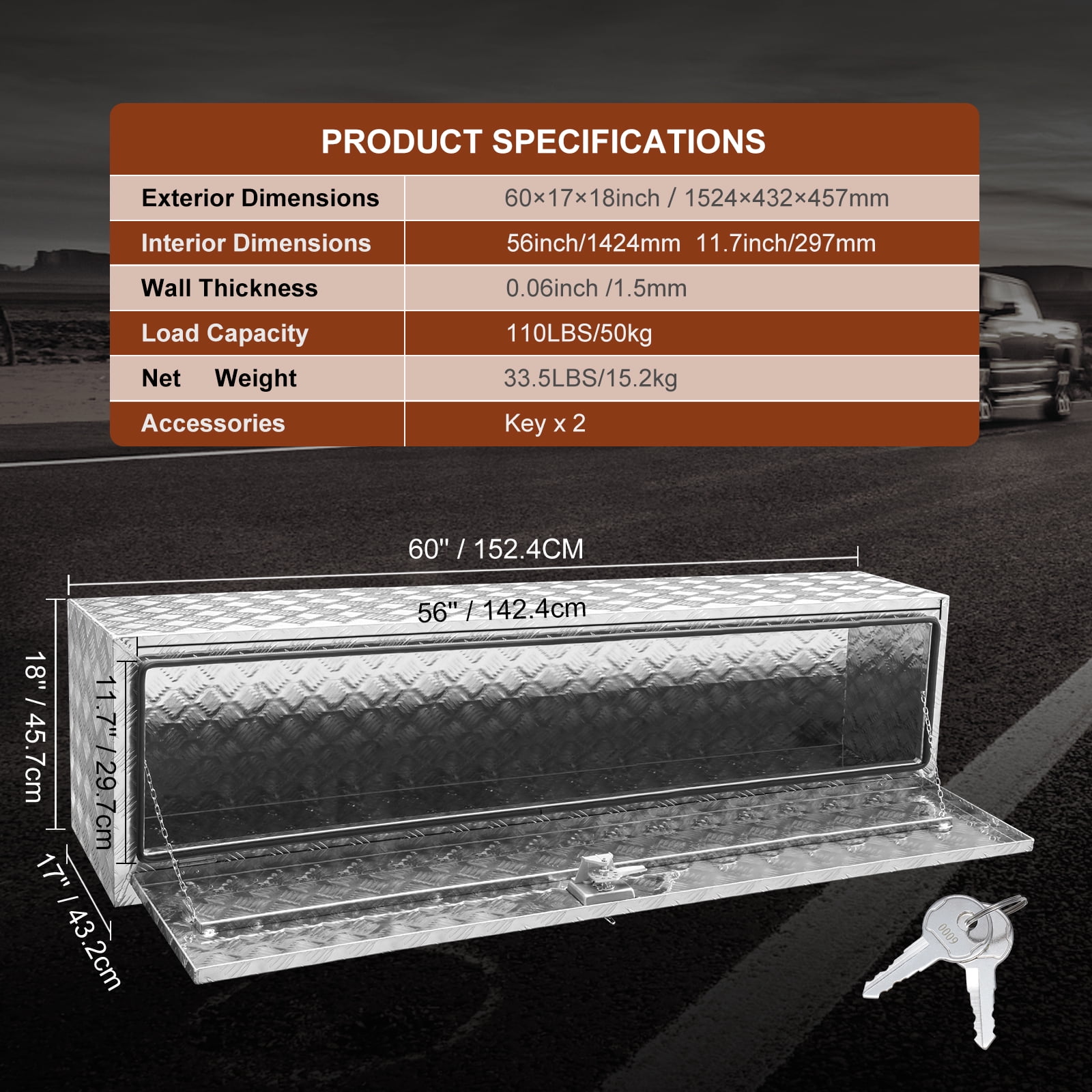 Product Description 60 x 17 x 18 inch Underbody Truck Box Are your items organized and easily accessible? SKYSHALO’s underbody toolbox expands the storage space of your truck, trailer, or other large vehicles. It’s made of high-quality, thickened aluminum alloy, which is waterproof, rust and corrosion-resistant, and can withstand bad weather and sand impact. Perfect for All Trucks Please measure the size of the underbody space before purchasing. Find the right size for your needs. You can purchase brackets for installation or complete DIY assembly by yourself. Hold All Your Needs SKYSHALO provides you with various sizes of toolboxes to meet your needs. Make full use of the space under your vehicle. Safely and orderly store all kinds of items. Stable and Durable This truck box is made of thickened aluminum alloy with scratch-resistant patterns on the surface, enhancing durability and hardness. Stand up to Weather The inside of the tool box is surrounded by a rubber sealing strip, ensuring that your tools remain dry on rainy days and preventing corrosion and rust. T-shaped Handle The underbody truck box adopts a recessed T-handle that reduces the scratch and impact caused by the protruding latch. And a built-in lock, stainless steel solid latch, and 2 exclusive keys, making it secure and pry-resistant. Hidden & Convenient Hinge A hinge is equipped on the truck box, allowing the box to open and close smoothly without jamming. Open at a wide angle of 80?-85? to access your tools freely. Specifications Item Model Number: UTTB-601718 Exterior Dimensions(W x D x H): 60?17?18 inch/1524?430?460 mm Interior Dimensions(W x H): 142.4 x 29.7cm/56″ x 11.7″ Wall Thickness: 0.06 inch/1.5 mm Load Capacity: 110 lbs/50 kg Net Weight: 33.5 lbs/15.2 kg Package Content 1 x Underbody Tool Box 2 x Keys
