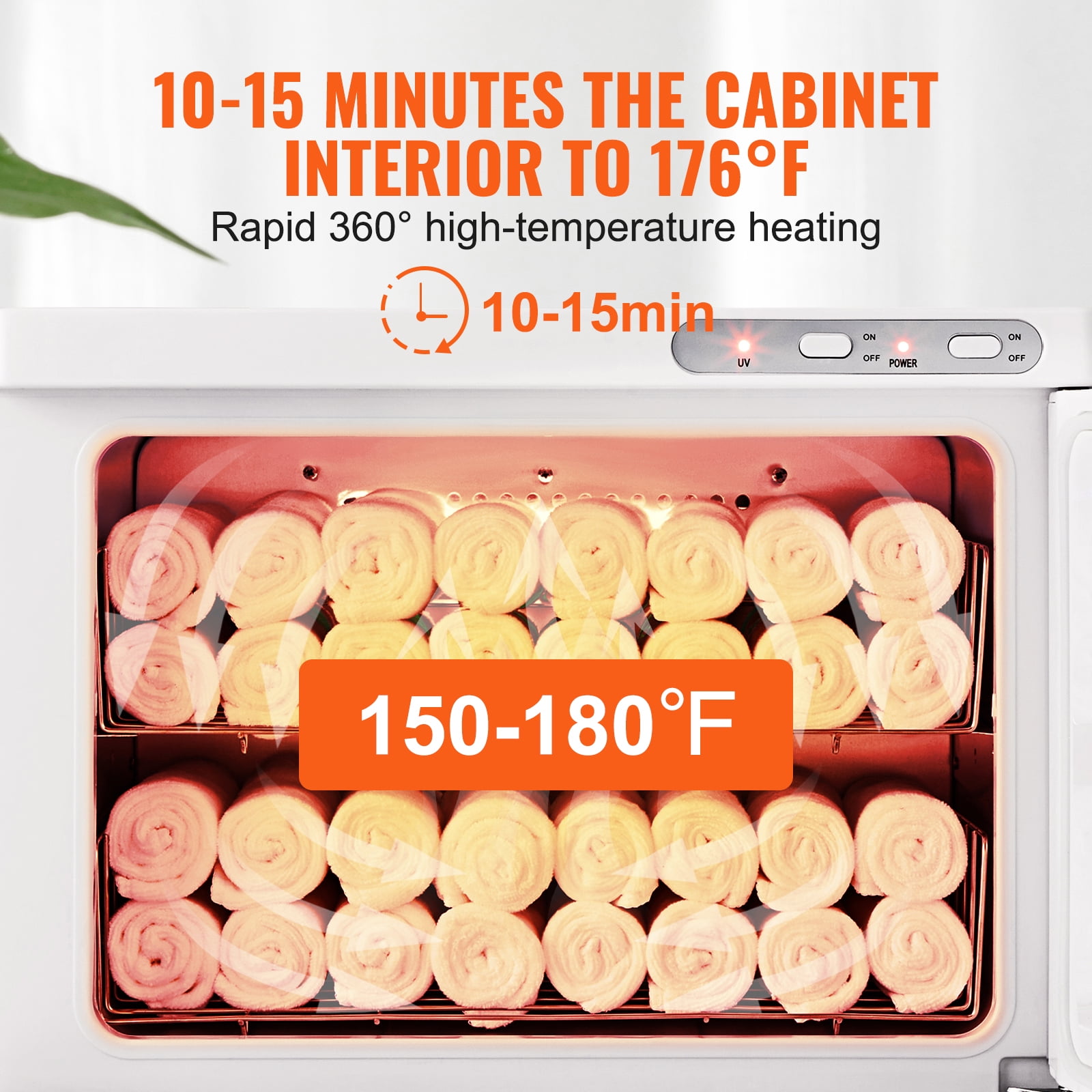 Item Model Number: RTD-23A Rated Power: 200W (+5%, -10%) Rated Voltage/Frequency: AC 110V-120V, 60Hz Capacity: 23L Stainless Steel Basket: 2 UV Light: Yes, Power: 6W Transparent Window: Yes, to Monitor Towel Quantity Temperature Range: 150-180℉ (65.55-82.22℃) Internal Heating: 4-Sided Heating Heating Efficiency: 10-15 Minutes to Warm Towels Overheat Protection: Yes, KSD301-P 10A 125V~ 80°C Color: White Main Material: Oxidized Aluminum Interior Product Size (L x W x H): 452x285x350 mm/17.79×11.22×14.77 inch Package Content:1 x Hot Towel Warmer, 1 x Towel Clip, 2 x Towel Basket, 1 x User Manual Spacious Capacity: Boasting an impressive 23L capacity, this hot towel warmer comes with 2 stainless steel racks, an instruction manual, and a clip. It can hold 40-50 standard-sized towels, allowing you to save time by avoiding multiple heating cycles Efficient Heating System: Features a uniform heating function that ensures towels are evenly warmed without any cold spots. In just 10 minutes, your towels can reach a cozy 150-180°F, setting a new industry standard for quick heating UV Light for Added Safety: Equipped with a powerful 6W UV light, this hot towel cabinet efficiently cleans towels deeply, leaving them softer and more comfortable to use Premium Interior Quality: The upgraded aluminum alloy interior improves heat conduction, ensuring that both traditional and disposable towels are heated evenly. Internal temperature control prevents overheating, providing towels with a proper temperature Versatile Applications: Suitable for heating face towels, bath towels, undergarments, nail tools, massage stones, and other beauty accessories. It’s an ideal addition to homes, spas, bathrooms, beauty salons, hotels, restaurants, and kitchens