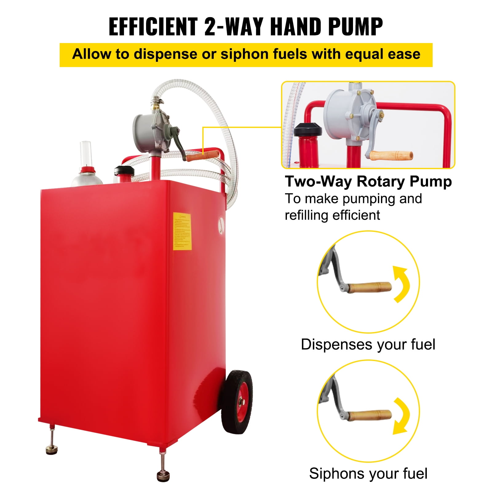 SKYSHALO VV-SYJYC-OI2, 30 Gallon Gasoline Diesel Portable Fuel Caddy Manuel TransferPump Red 30-Gallon Fuel Tank: Portable design allows for easy transport of fuel directly to your location, making cleanup quick and efficient. Suitable for storing gasoline, kerosene, or diesel, ideal for automotive repair, farm, lawn and garden, marine applications, and more Bi-Directional Rotary Pump: Manual rotary pump enables efficient dispensing or siphoning of fuel by simply turning the crank in either direction, allowing for faster refueling with less effort Easy to Transport and Use: Features an anti-static grounding clip to prevent electrostatic discharge, along with an accurate fuel gauge to monitor fuel levels and reduce over-refueling risks. Heavy-duty 8-inch wheels facilitate movement across various terrains Quick and Convenient Filling: Equipped with a 9.8-foot kink-free hose and spout for maximum flow and speed. The wide diameter neck allows for easy refueling without spills, and hose hooks provide convenient storage Ultra-Strong Steel Tank: Constructed from durable 201 stainless steel, this tank resists UV radiation and dents, ensuring a long service life even in changing weather conditions