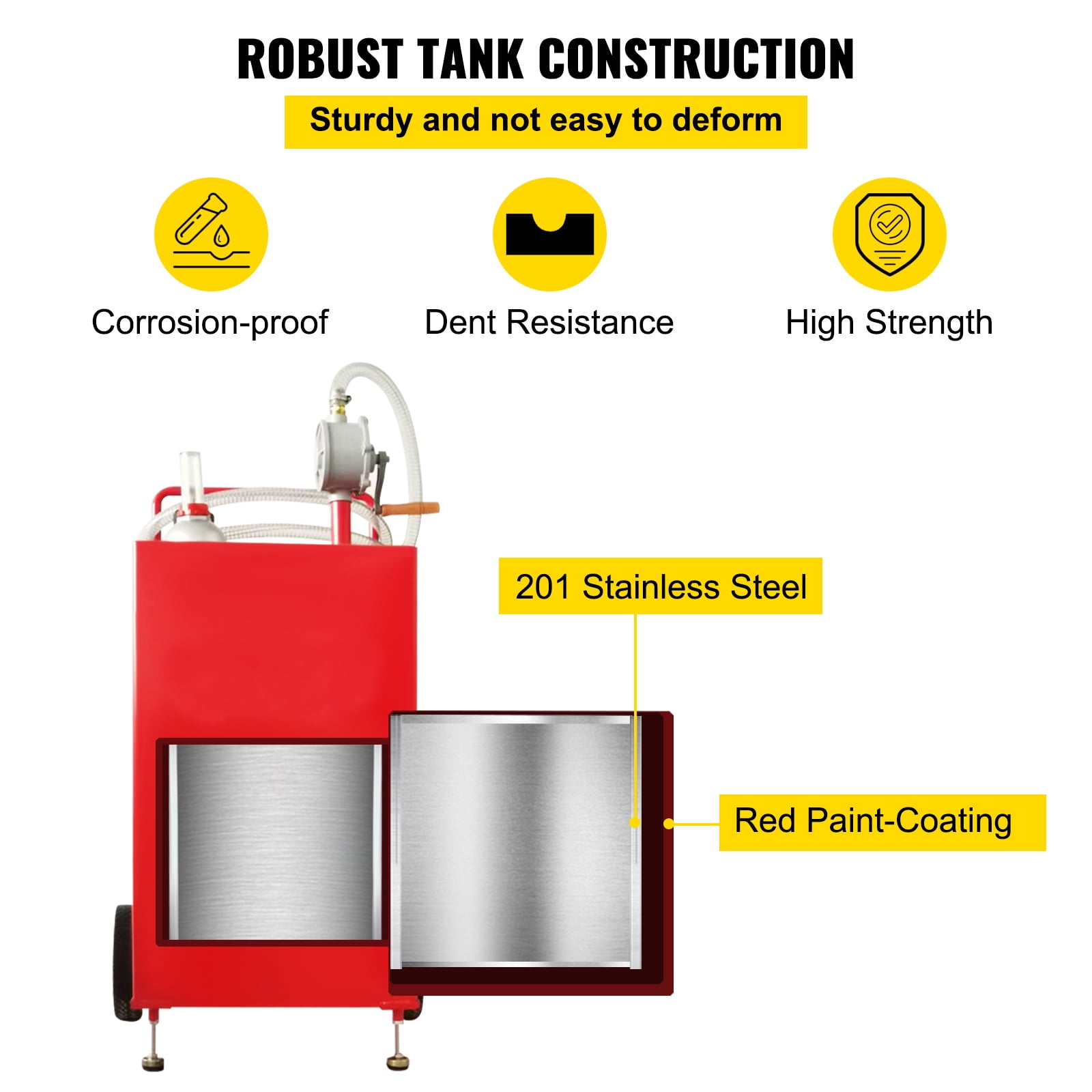 Product Description 30 Gallon Fuel Caddy This large 30-gallon fuel tank is easily portable for efficient and easy refueling in a variety of applications while reducing spills and fuel waste. It is an ideal device for automotive repair, farm, garden, small engine, motorcycle/ATV, marine use and more. This fast, clean fuel tank is easy to carry. No matter the situation, our caddies will always be by your side. Large 30 Gallon Fuel Tank No matter what fuel you’re looking for, our portable fuel tanks have you covered. This flexible tank is approved to safely store and dispense up to 30 gallons of gasoline, diesel and kerosene fuel. Rotary Manuel Pump The highly efficient bi-directional pump distributes fuel by varying the rotation of the crank handle or siphons, allowing you to eliminate excess fuel from the tank by sucking excess gasoline or diesel back into the tank. Designed just for you The gas storage tank has a main structure. It includes two large 8-inch wheels, an anti-static ground clamp, oil filler neck with gas cap, a convenient tube holder and a simple lever push handle. High-Strength Steel Tank The 30-gallon diesel tank is made of high-quality material 201 stainless steel, which is highly resistant to mechanical damage and corrosion. Such high-quality materials ensure long-term use. Secure & Efficient to Fill Automotive grade 9.8 FT rubber hose allows for efficient refueling and fuel transfer. Heavy-duty nozzles support fast fuel delivery. Just open the clamp and let it flow, and you can quickly fill up your tank in minutes. Wide Application Use Portable fuel tanks are designed to transport diesel or gasoline to your job site. It is ideal for tank trucks, containers, outdoor industries, construction industries and more. Specifications Model: 30 Gallon Fuel Caddy Tank Size: 37.8 x 20.9 x 20.9 in/ 96 x 53 x 53 cm Fuel Type: Gasoline, Diesel, Kerosene Pump Type: Two Way Rotary Pump Hose Length: 9.8 ft/ 3 m Material: 201 Stainless Steel Tire Diameter: 8 in/ 20.3 cm Product Color: Red Package Content 1 x Fuel Caddy