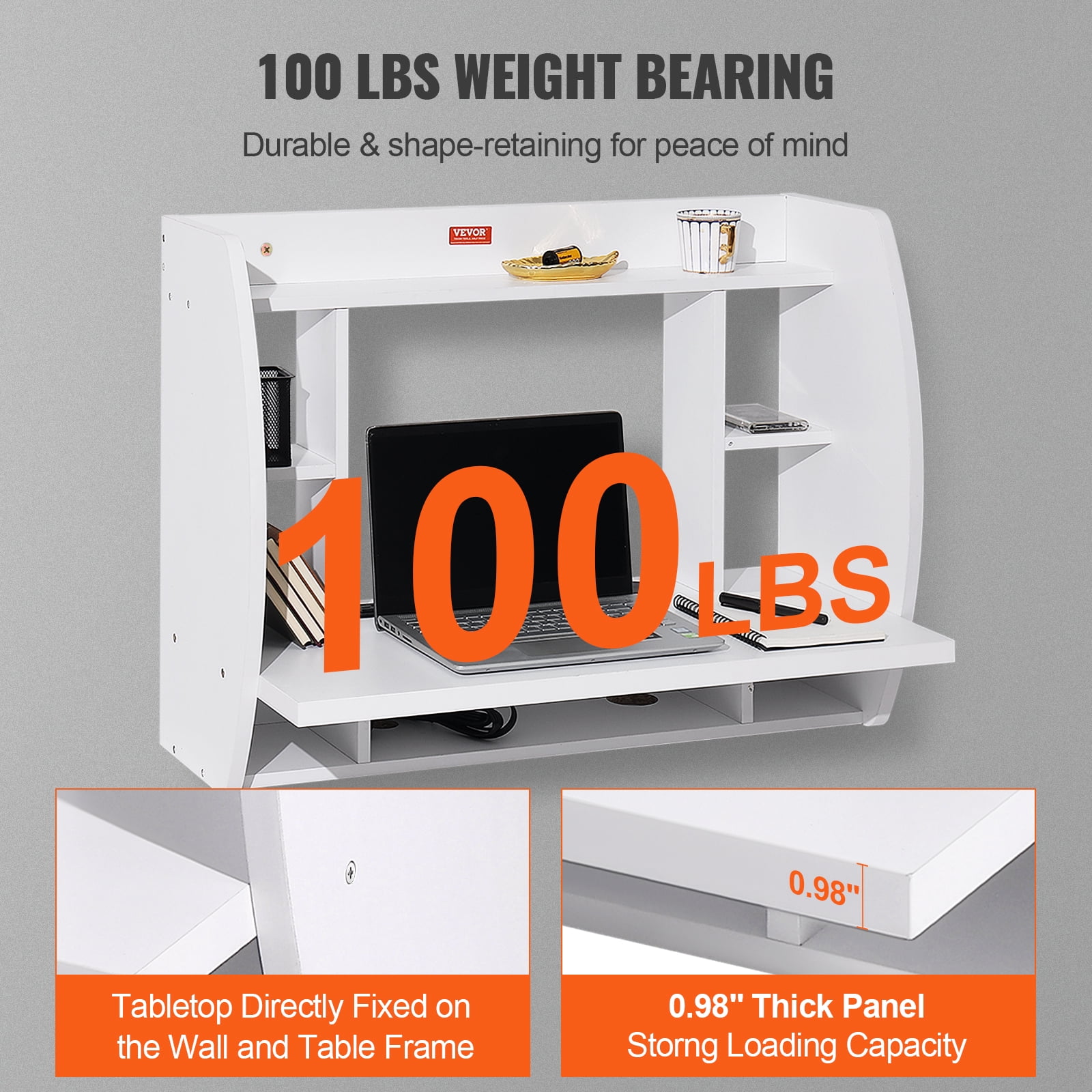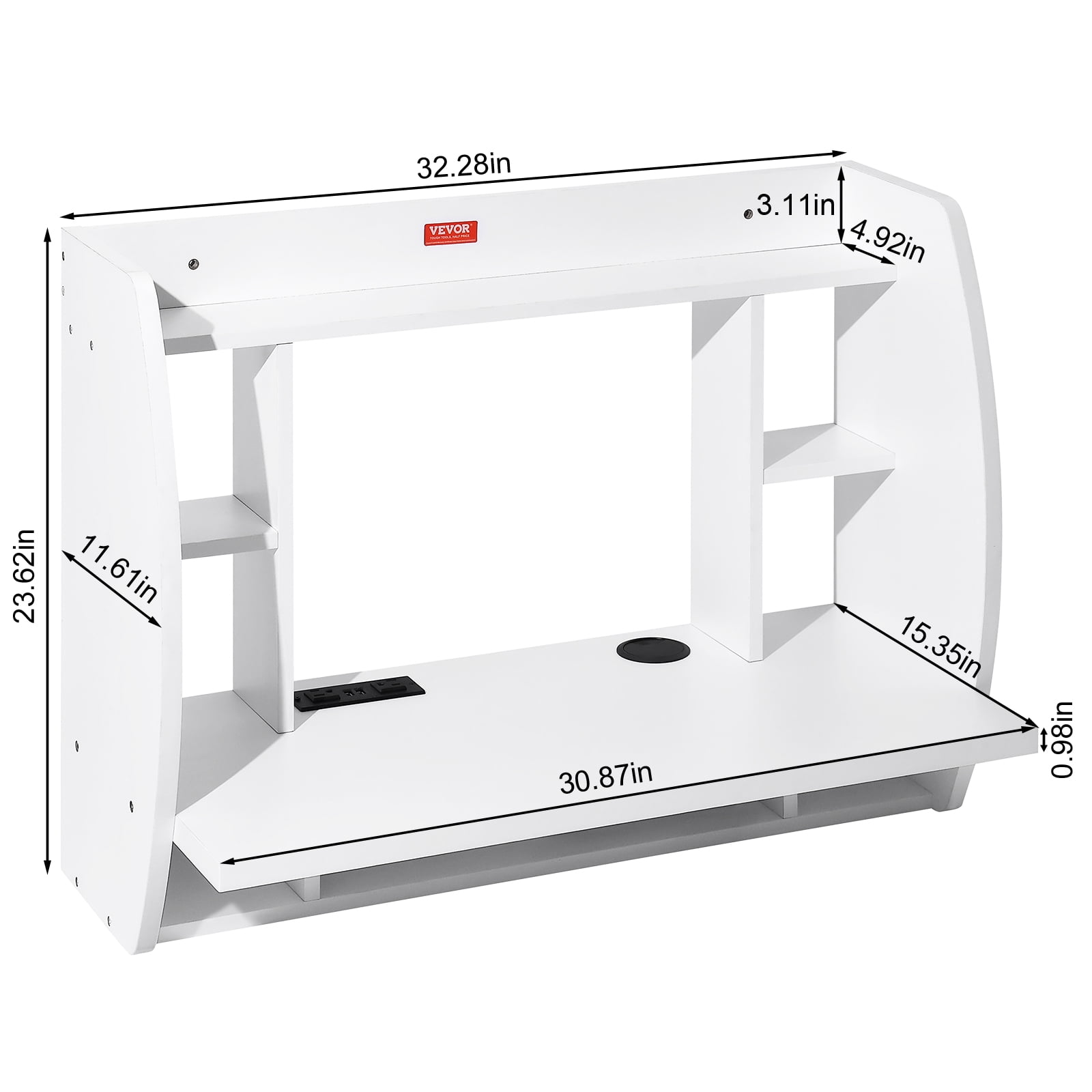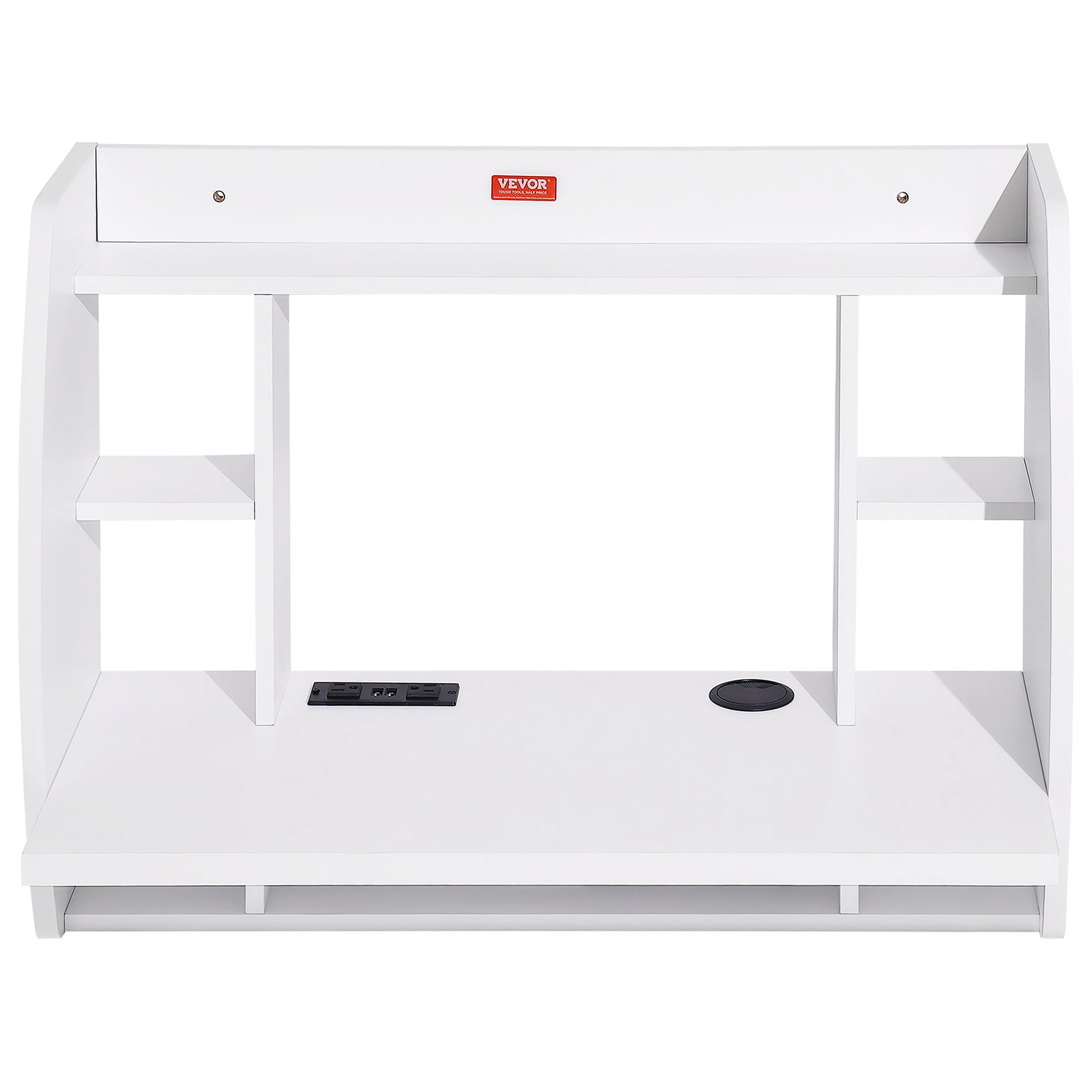 SKYSHALO Wall Mounted Floating Computer Desk with Power Socket and Storage Shelf, White Wall-Mounted Desk with Storage Space: Designed for versatile use, this high-quality floating desk serves as a study, dining, or display table. It features upper shelves and a lower cubby for ample storage, keeping your workspace organized 100 lbs Weight Capacity: Constructed with 1.18-inch panels of high-strength particle board, this desk ensures durability and minimal deformation. The desktop is securely attached to the wall, supporting up to 100 lbs for stability Convenient Design: Equipped with a power socket and a 70.9 in/1.8m power cord, this desk allows easy charging of devices like laptops and phones. It also includes a cable management hole for organized wiring, enhancing user experience Durable Eco-Friendly Material: Made from eco-friendly particleboard, this wall-mounted desk features a sturdy yet lightweight design. Its laminated surface resists water and oil stains for easy cleaning, while smooth, curved edges minimize impact and scratches Easy Installation: Comes with all necessary accessories for hassle-free installation, including an extra screw to prevent missing parts. Follow the provided instructions for quick assembly, making it user-friendly even for beginners