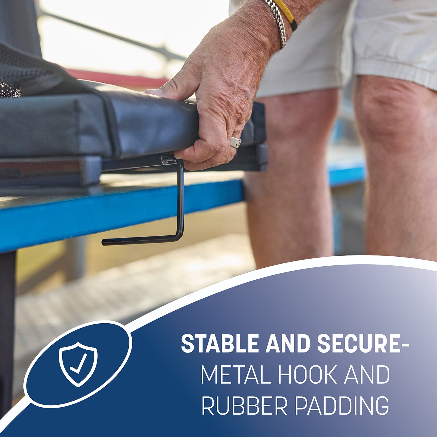 SUPERIOR COMFORT: High-density foam cushion provides the perfect amount of SUPPORT for your back, ensuring long hours of COMFORT while watching the game. DURABLE AND EASY TO CLEAN: Made with WATERPROOF Oxford Cloth, this stadium seat is built to withstand the elements and is easy to clean after any event. PORTABLE AND CONVENIENT: The FOLDABLE frame and removable shoulder straps make this stadium seat EASY TO CARRY to and from the game, offering hassle-free portability. SECURE ATTACHMENT: The bottom HOOK DESIGN ensures the seat stays securely attached to bleachers, providing STABILITY and peace of mind during use. PRACTICAL STORAGE: Includes a CUP HOLDER and a ZIP STORAGE POUCH for keys, cell phones, snacks, ponchos, or hand warmers, keeping your essentials within reach. AMPLE SPACE AND LIGHTWEIGHT: With dimensions of 16.9 inches in height, 16.9 inches in length, and 13.7 inches in width, and weighing only 7 lbs, this stadium seat offers ample space and is easy to carry.