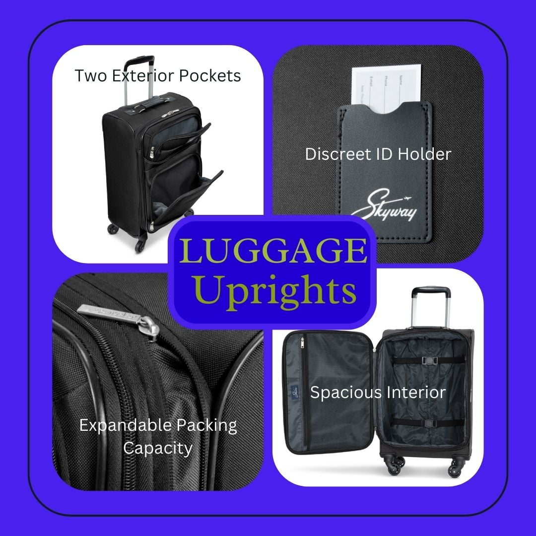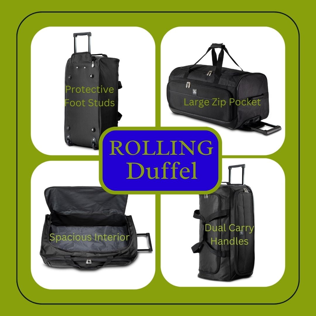 Luggage – Exterior Weather- and abrasion-resistant polyester Any-direction wheels Telescoping handle with comfortable grip Two spacious exterior pockets Top and side carry handles; bottom carry grip Discreet ID tag Lockable zippers (lock not included) Expandable packing capacityLuggage – Interior Spacious packing compartment Adjustable compression straps Zippered pocket in lid Medium Rolling Duffel Weather- and abrasion-resistant polyester Two smooth-rolling inline wheels Telescoping handle with comfortable grip and zip-close cover Large zip pocket Dual carry handles Side carry handle Protective foot studsBoarding Bag Weather- and abrasion-resistant polyester Dual top carry handles Adjustable shoulder strap Pass-thru trolly handle strap Easy-access zip pocket Qualifies as a personal itemToiletry Bag Weather- and abrasion-resistant polyester Zippered closure Side grab handle Wipe-clean interior