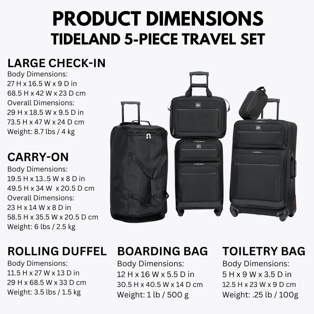 The Skyway Luggage Tideland Softside 5-Piece Travel Luggage Set has everything you need to travel in style and comfort. This versatile set includes a Carry-On, Large Check-In, Rolling Duffel, Boarding Tote, and Toiletry Kit, making it the perfect collection for any journey—whether it’s a weekend getaway with the family or a solo adventure. The generous capacity suitcases are equipped with a 360° spinner wheel system, offering smooth and effortless maneuverability. The rolling duffel features two in-line wheels for enhanced stability, while the boarding tote keeps your essentials easily accessible with its exterior pockets. The toiletry kit offers the ideal size for travel, keeping your toiletries organized and secure. Crafted from lightweight, durable 600 polyester fabric, the Tideland set resists abrasion and tearing, providing superior protection against the elements. Ready for any adventure, this set delivers the perfect balance of functionality, style, and durability for all your travel needs. Overall dimensions are as follows: Expandable Spinner Carry on: 19.5 in H x 13.5 in W x 8 in D Expandable Spinner Large Check in: 27 in H x 16.5 in W x 9 in D Rolling Duffel: 11.5 in H x 27 in W x 13 in D Toiletry Bag: 5 in H x 9 in W x 3.5 in D Boarding Bag: 12 in H x 16 in W x 5.5 in D.