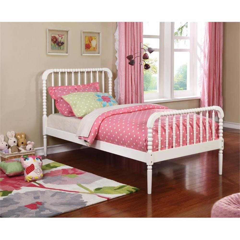 Includes: One (1) bed Wood finish: White Materials: Pine wood Add texture to a bedroom with this twin bed with a bobbin motif Traditional style with slender posts and bobbin-style slats Charming in a rustic or cabin-inspired bedroom Slat kit included Mattress ready Center rail: Yes