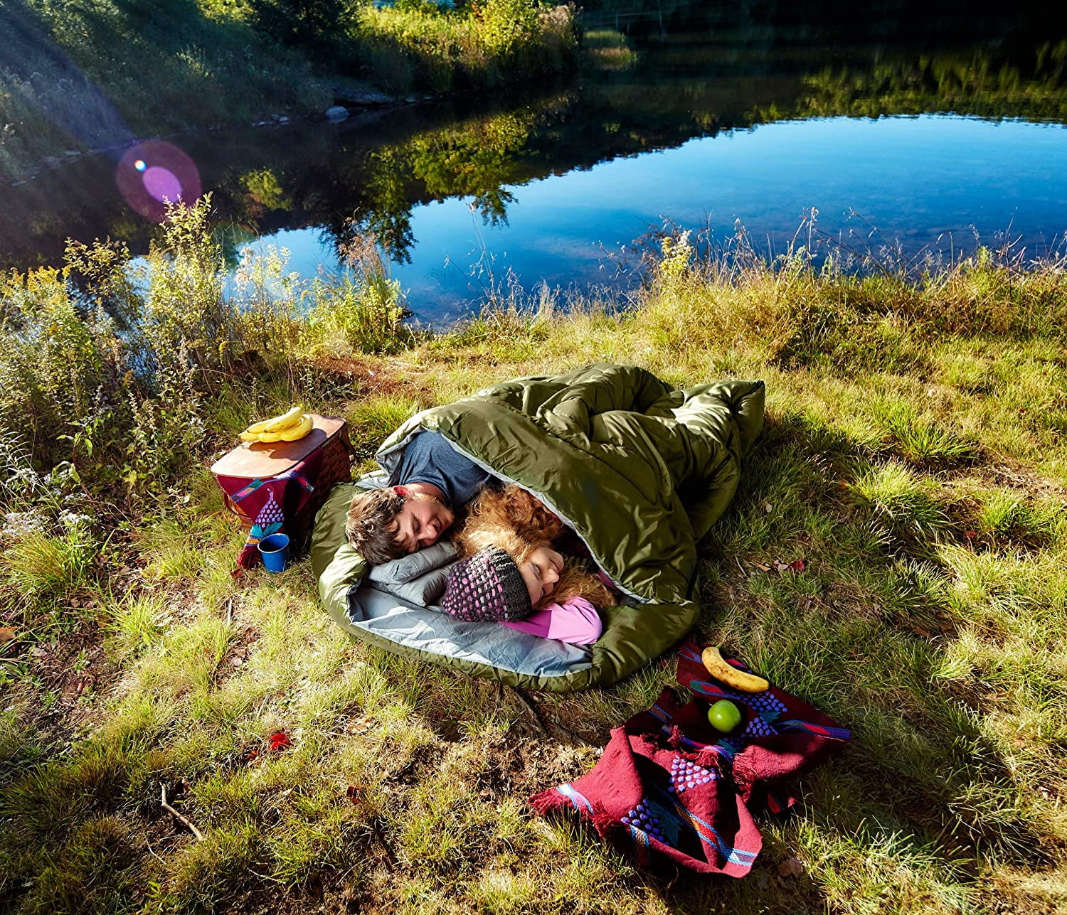 SUPER WARM AND MOST COMFORTABLE! YOU WILL LOVE THIS SLEEPING BAG! Want to sleep comfortably, anywhere? No need to suffer with a cheap, cold, tight sleeping bag! This quality, portable bag is perfect. Super sturdy and extremely comfortable. THIS SUPER SOFT, HUGE, WARM & COMFY SLEEPING BAG FEATURES A LIFETIME WARRANTY! – Economically and practically efficient; With an impressive size of 87″ X 59″ This sleeping bag sleeps two adults in ample and comfort. FOR COLD CLIMATE CONDITIONS [32° Up] PERFECT FOR HIKING, CAMPING, TRAVELING & MORE! No tearing due to tight conditions, No shivering due to heat loss, very convenient to carry. You’ll wish you found this years ago, comes with 2 traveling pillows! CAN BE USED AS TWO INDIVIDUAL SLEEPING BAGS! -Designed to be used as one large queen size sleeping bag or as two individual sleeping bags. Imagine the memories you’ll make with this. The outer shell is made of waterproof and camping grade polyester fabric, each square inch of fabric packs a 210 thread countThe inner lining is made of a textile combination of Tetr