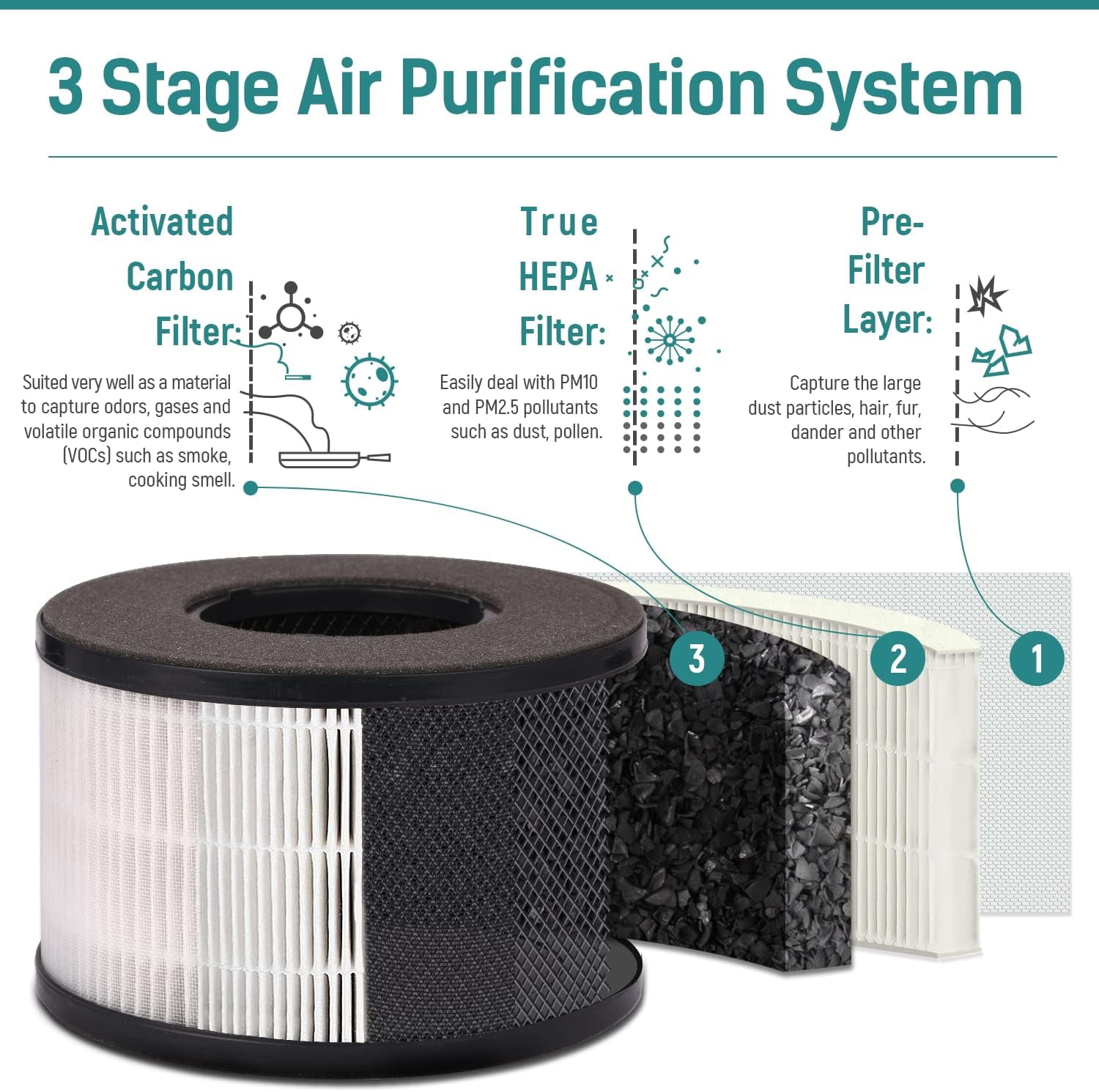 【Higher-Efficiency 3 Stage Filtration System】 Air purifiers for bedroom in home features a Pre-Filter, H13 True HEPA Filter, Activated Carbon work together to re-m0ve 99.97% of airborne particles 0.3 microns in size, such as dust, smoke, pollen, pet fur, odor etc. Relief sneezing itchy etc and it’s good choice for pets owner. 【Add Fragrance Design Sponge】HEPA air purifiers for home also has an aromatherapy addon where essential oils (not inculded) can be applied to the sponge material (inculded 5 pieces replacement sponge) below the purifier air outlet . You can add any scent you want to get the freshest smell for your room. 【Circular Design for 360° Coverage】Our air purifier with its cylindrical base, the unique top air outlet leaning on front for more direct air flow to users and increase 45% Circulation Spend than others. The cylindrical design is both pleasing to the eye and efficient. 【2024 New Updated – Energy Efficient】It is enough for this small air purifiers for pets to clean any spaces up to 450 square feet and only uses from 7 to 18 watts for power consumption. Noise Level: 24to50dB. You can use the air purifier 24/7 without worrying of the electricity bill. 【User-Friendly】①Pressing the child lock button for 3–5 seconds you’ll freeze the touch panel. This is definitely a useful function if you have curious children or pets at home. ②The Check Filter Indicator will let you know when it’s time for a fresh filter and the filter’s actual performance will depend on how often you run your air cleaner and how air quality level is. 【Warm Tip】If you need a filter after 3-6 months, please tell us via the order number