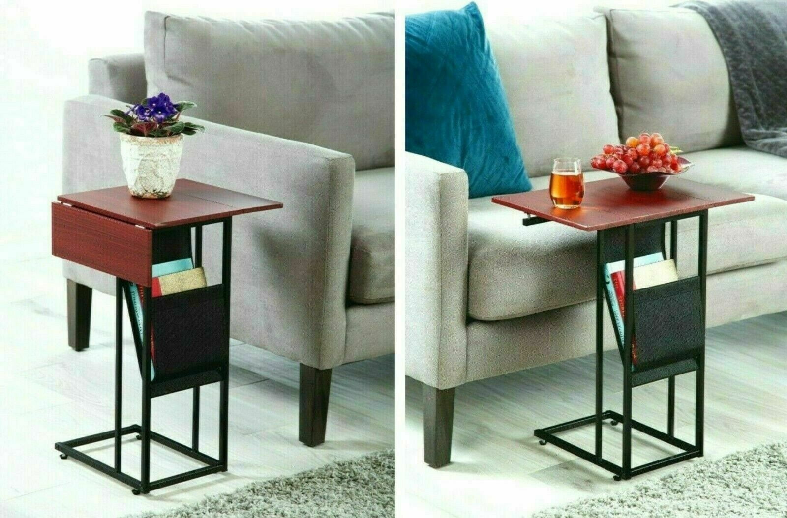 Slim Narrow End Table with Drink Cup Holders – Built-in Shelving- Magazine Shelf Rack-Cellphone Holder- Walnut Wood Finish Position this Slim End Table with Drink Holders next to your favorite armchair or sofa to add storage space and functionality. Two jumbo cup holders are built into the tabletop to hold a couple of beverages without fear of spilling. The base of the wooden table features built-in shelving. You can use it around the home in the family room, living room, or by your home office desk. Wooden. Assembly required; assembly hardware included.