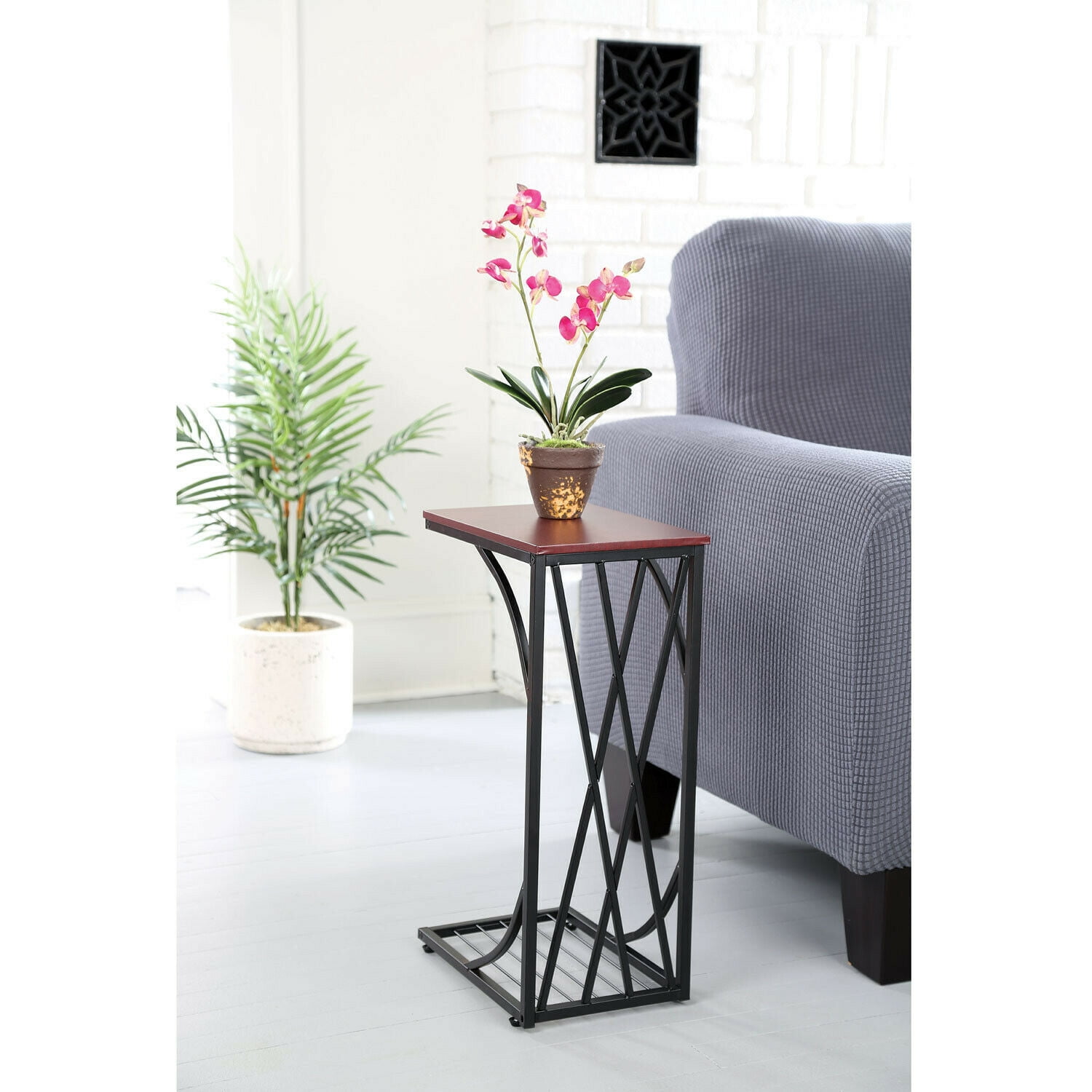 This sleek, slender end table is the ideal companion to your contemporary sofa Great for small living rooms thanks to a slim profile and rectangular design Includes two cup holders that are removable for easy cleaning Included shelving provides convenient storage for books, magazines and more Material: Wood with Stainless Steel Cup Holders Dimensions: 21.25 H X 17 W X 8 D