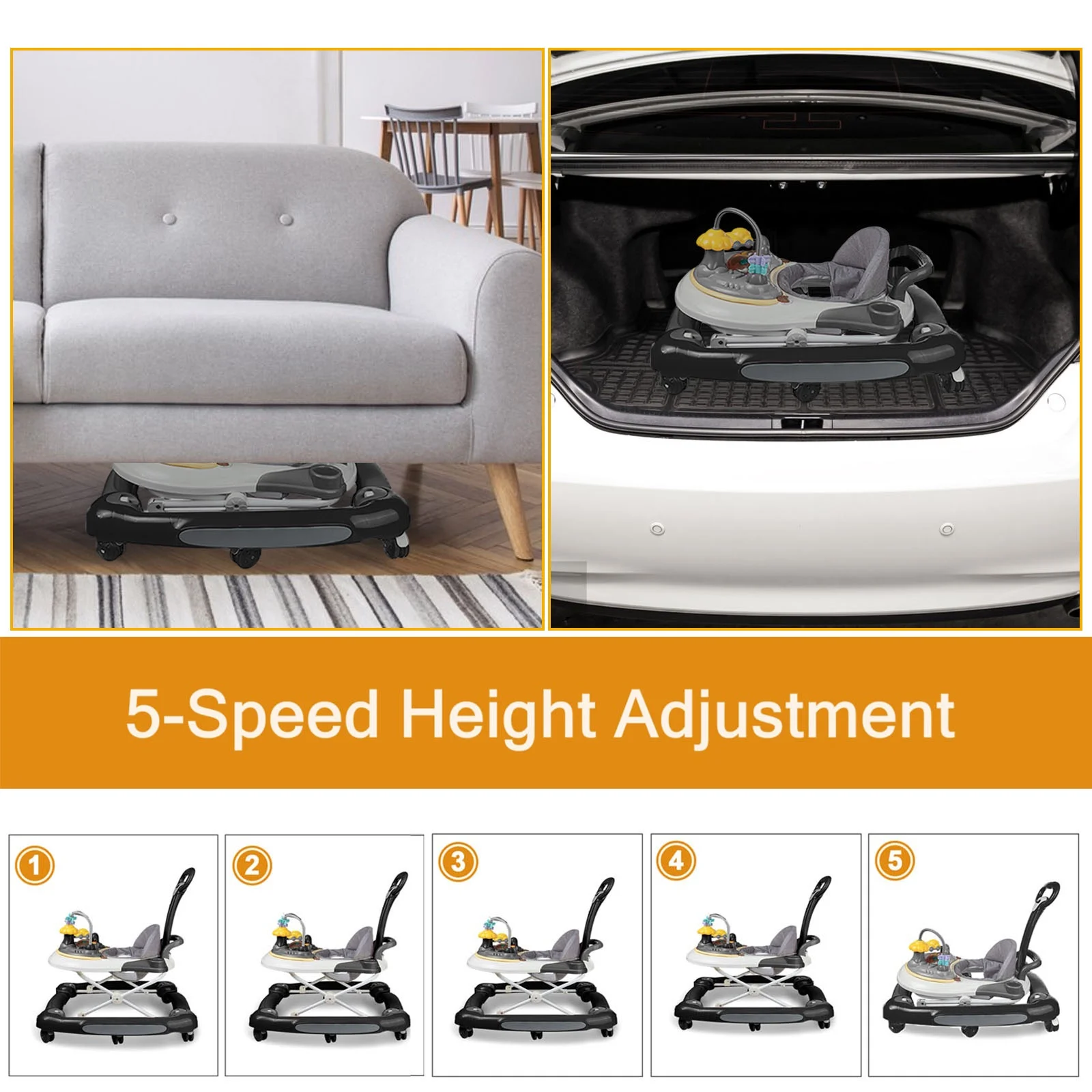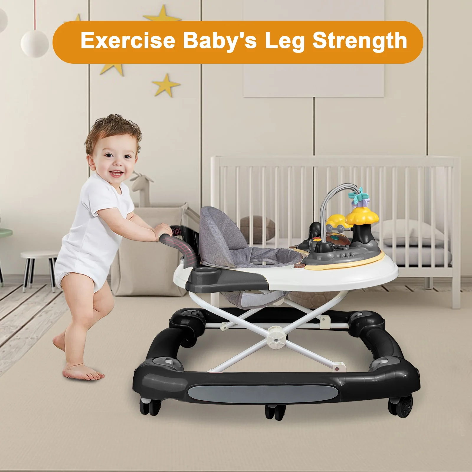 【High quality】Baby walker made of Eco-friendly original raw material plastic, High quality cushion, safer and Non-toxic easy to care for, Wearable cushion, portable and breathable & comfortable design for babies. 【Height Adjustment】5 walker heights, Suitable for Baby of Different Heights. Grows with your baby to make sure your child stay safe as They begin to crawl and Explore.Baby maximum Load 15 kg. 【Multi-function – Mode】This baby’s early education walker has four uses. The toddler function, walking assistance function, horse rocking function, and dining table function make the baby happy and the mother rest assured. 【Unique design】- The baby stroller is equipped with a fun music box, detachable sunshade, and adult pusher. The chassis is widened without touching the feet, making baby walking more stable. 【Wheels and Legs】Square design. The baby walker with 8 wheels work on floors easy moving. 4 sturdy crossed stainless steel legs allow babies to play safely and securely. Material: Plastic Type: SLLINGLUO Unisex Baby Walker Color: more colors for choice Style: Cartoon Packing: 1 piece Size: 28.35“*26.38”