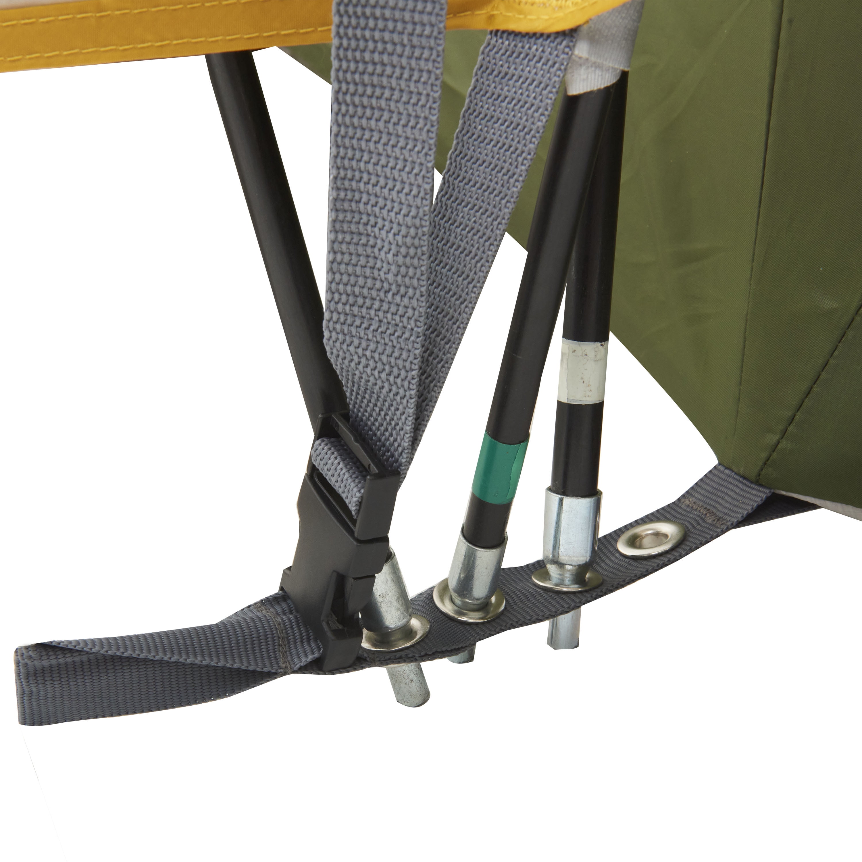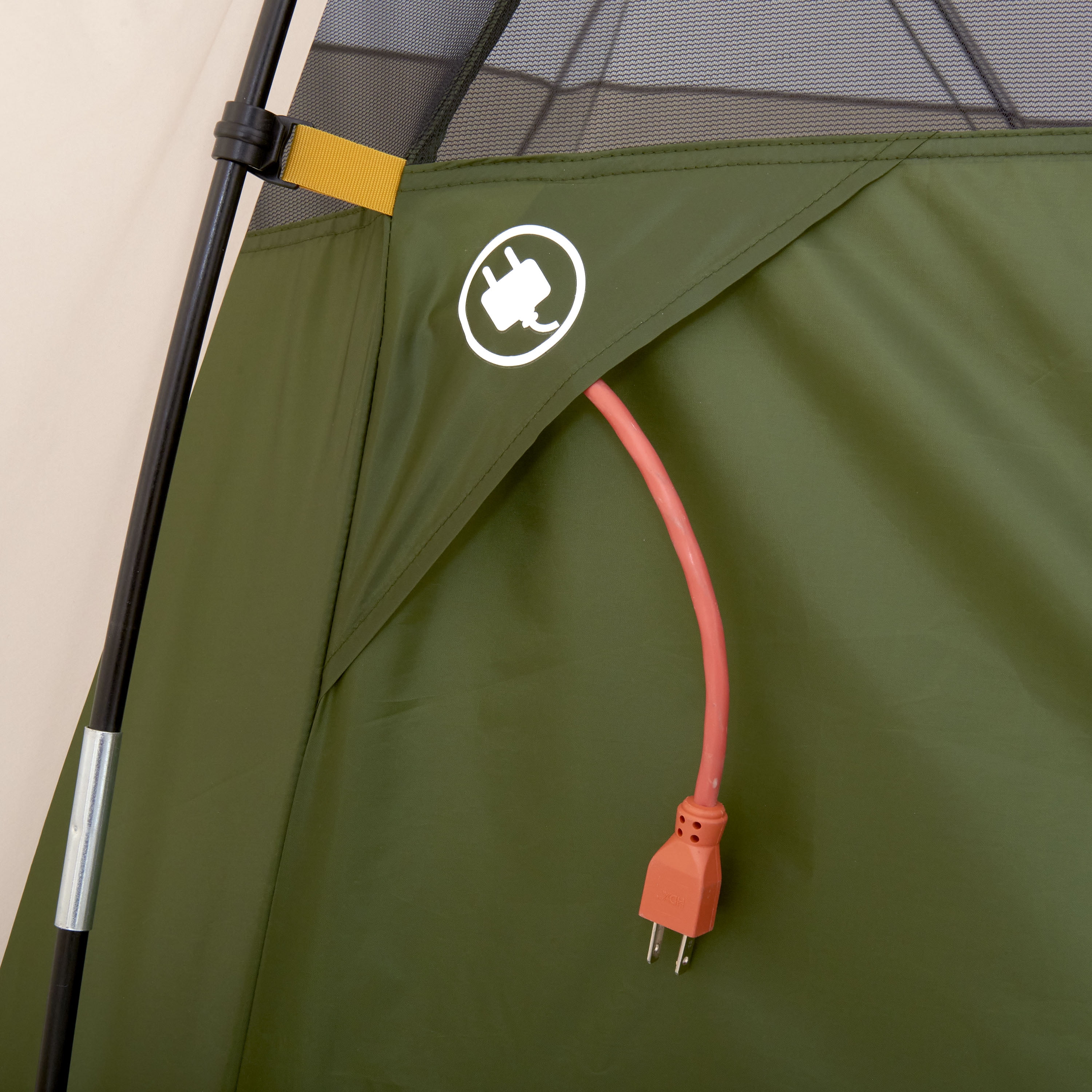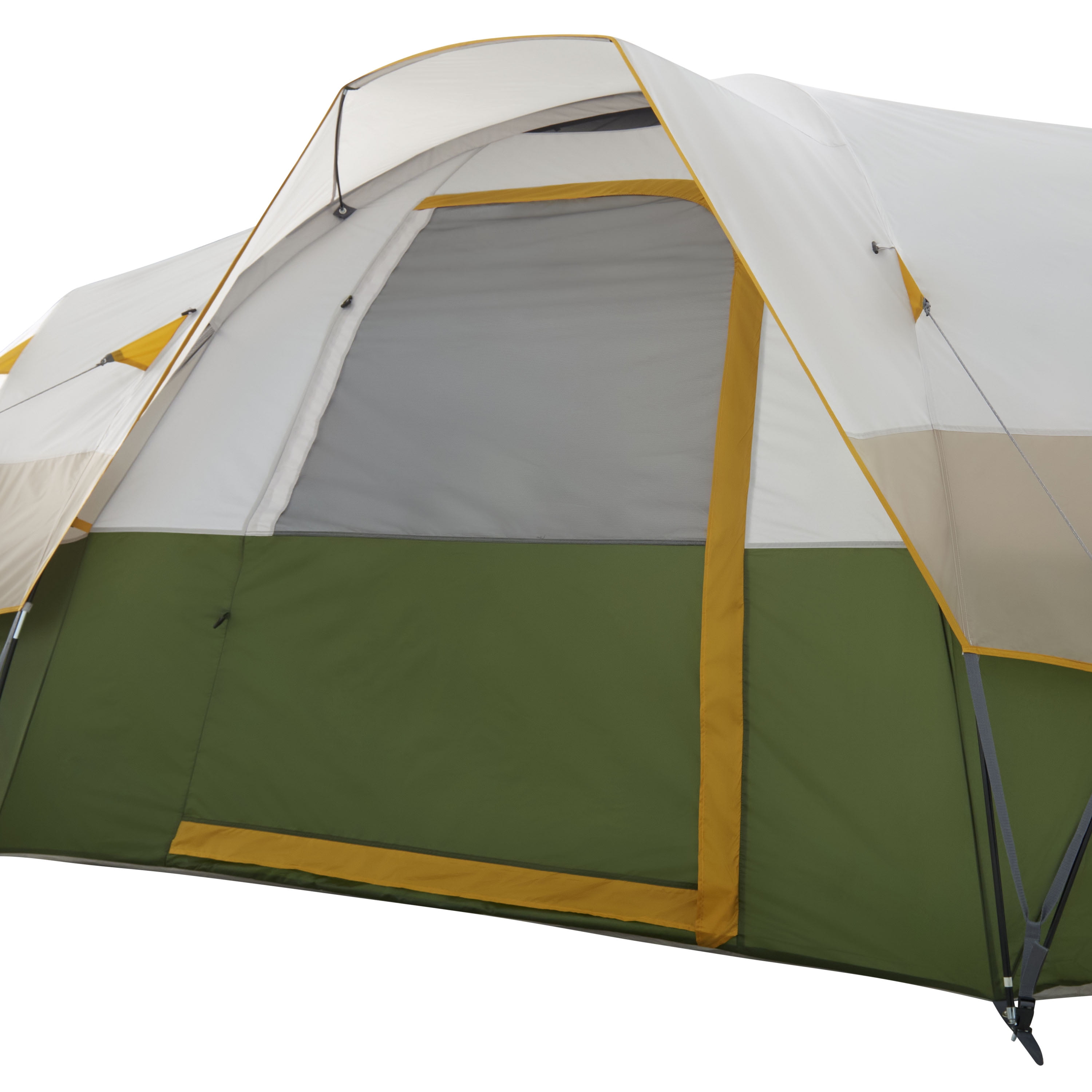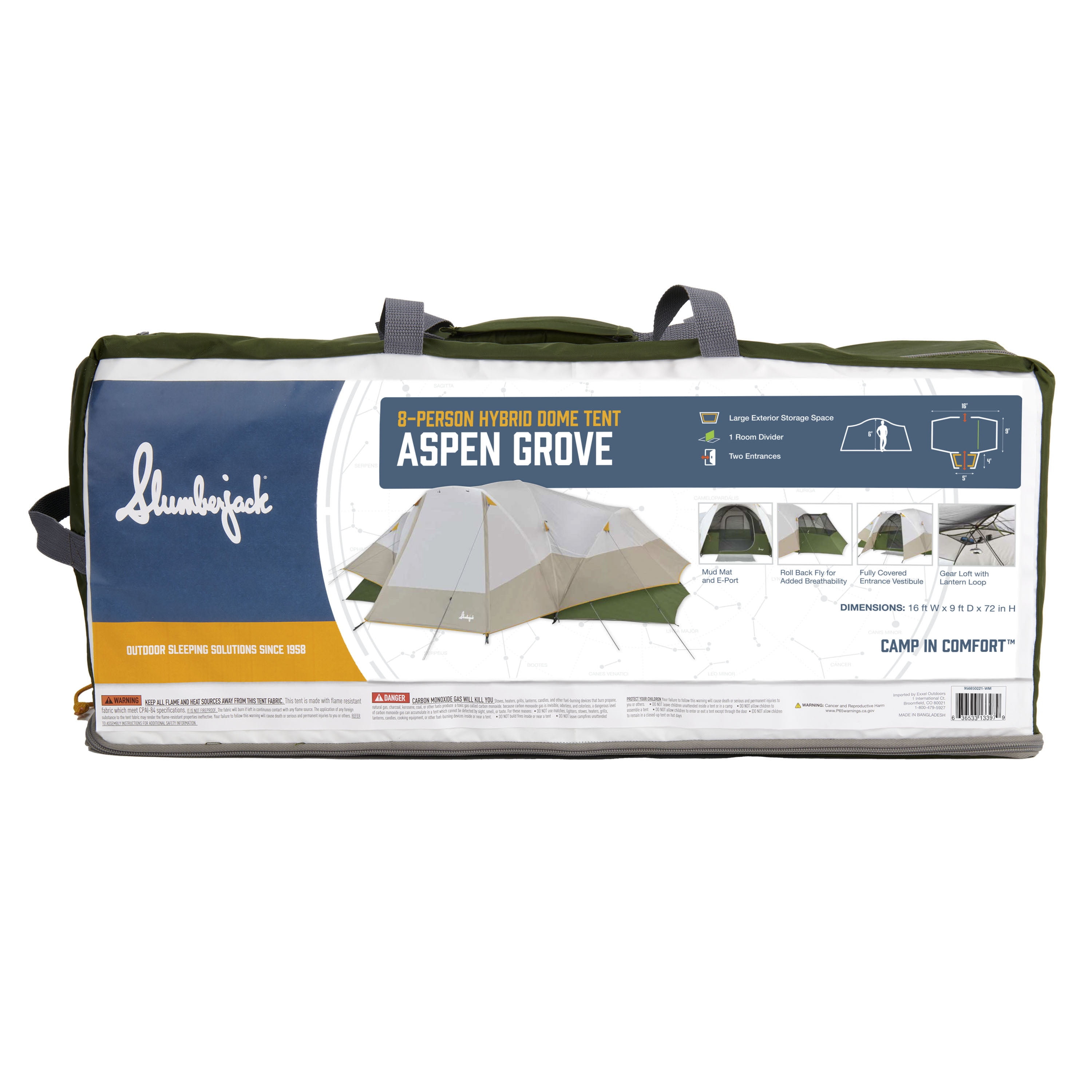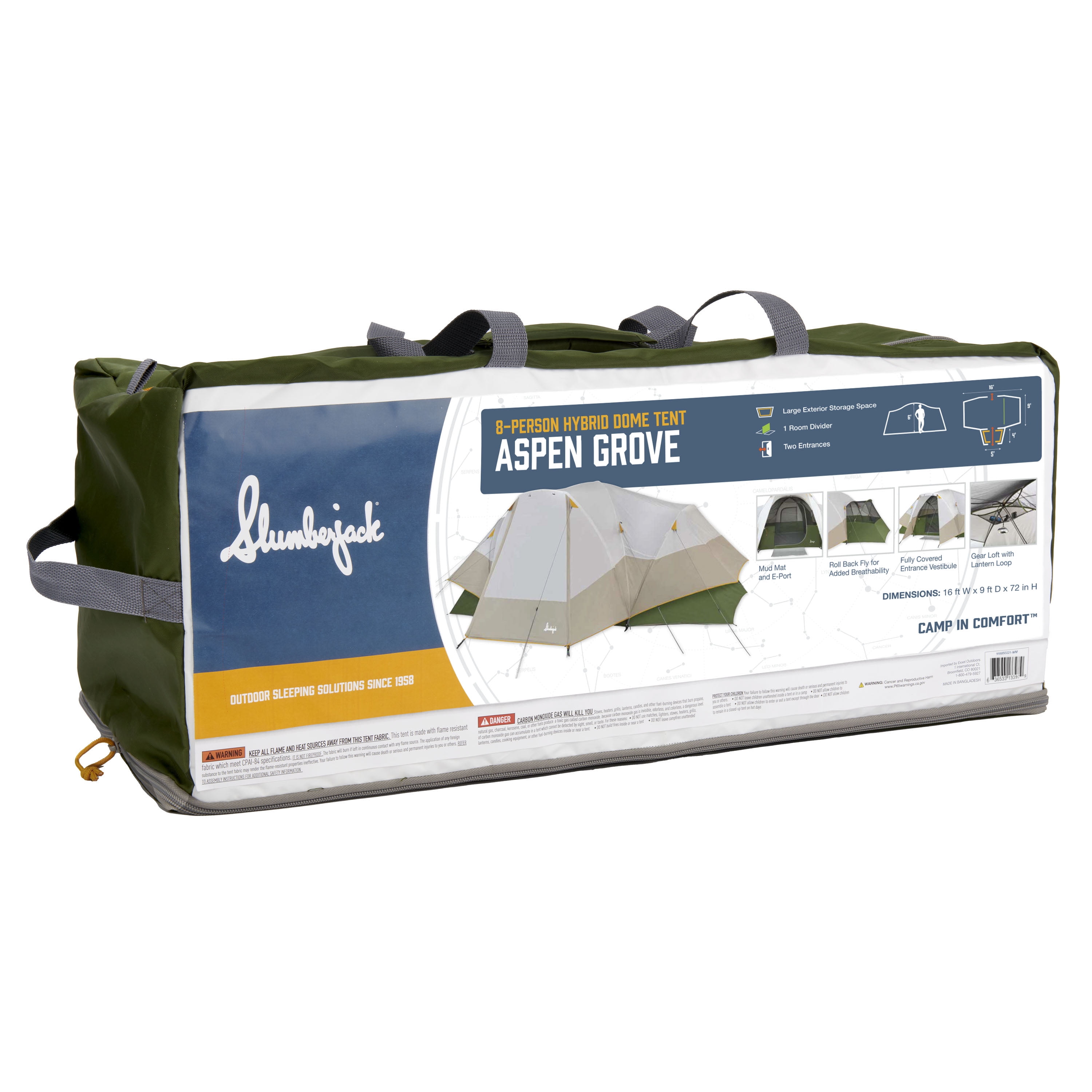 The Slumberjack Aspen Grove 8 Person Hybrid Dome Tent, with 2 Rooms, Room Divider, and Full Fly is the must-have tent for your next family camping trip. This off-white and green, 144 square foot tent comfortably sleeps eight people in sleeping bags or fits two queen size air beds. There is a room divider so that you can have one large room or two separate rooms to create privacy. You can roll the rainfly back or remove it altogether for added ventilation or to enjoy a night of stargazing through the full mesh roof. There are many features that make this tent feel like home away from home, including a mud mat to keep the inside of the tent clean, a gear loft with a lantern loop to keep your tent tidy, and an E-Port to run an extension cord so that all your gadgets stay charged. A fully covered entrance creates a 20 square foot vestibule to stow your shoes or other gear. Whether you are getting away for the weekend or enjoying a longer break, grab the Slumberjack Aspen Grove 8-Person Hybrid Dome Tent and let the relaxation begin.